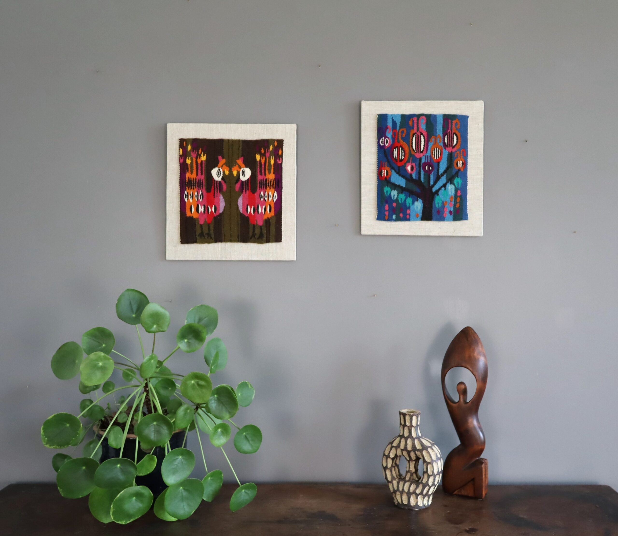 Executed with a masterful sense of geometry and folk-inspired abstraction, the work feels both decorative and symbolic — celebrating nature, symmetry, and craftsmanship. The combination of strong contrasting hues, simplified forms, and tactile woven texture make this a quintessential example of early 1970s Nordic textile art, exuding warmth, character, and playful sophistication.
