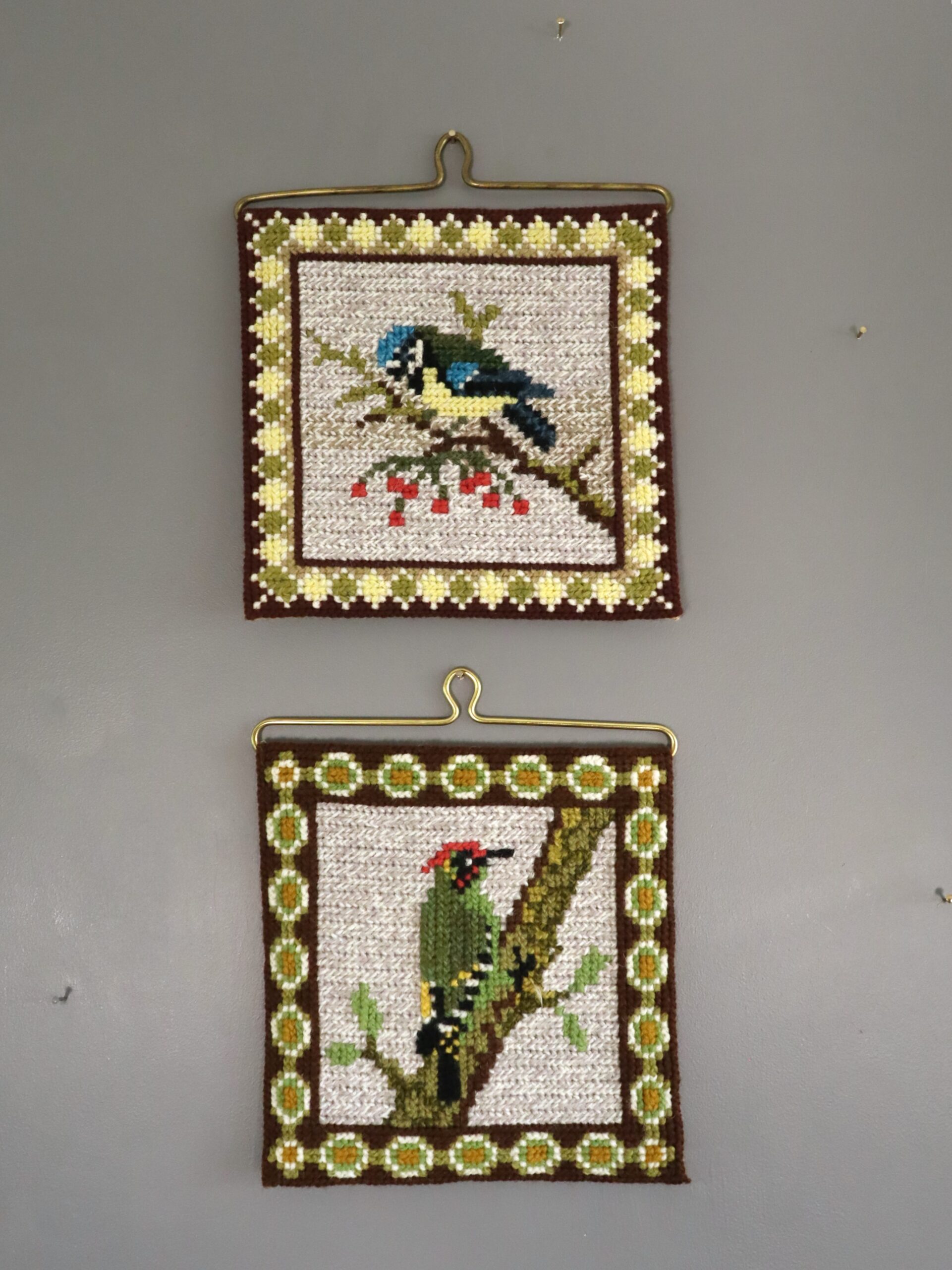 This 1970s textile artwork is a charming hand-stitched tapestry that captures a blue tit perched delicately on a branch — a delightful expression of nature interpreted through the warmth of mid-century Scandinavian craft design.