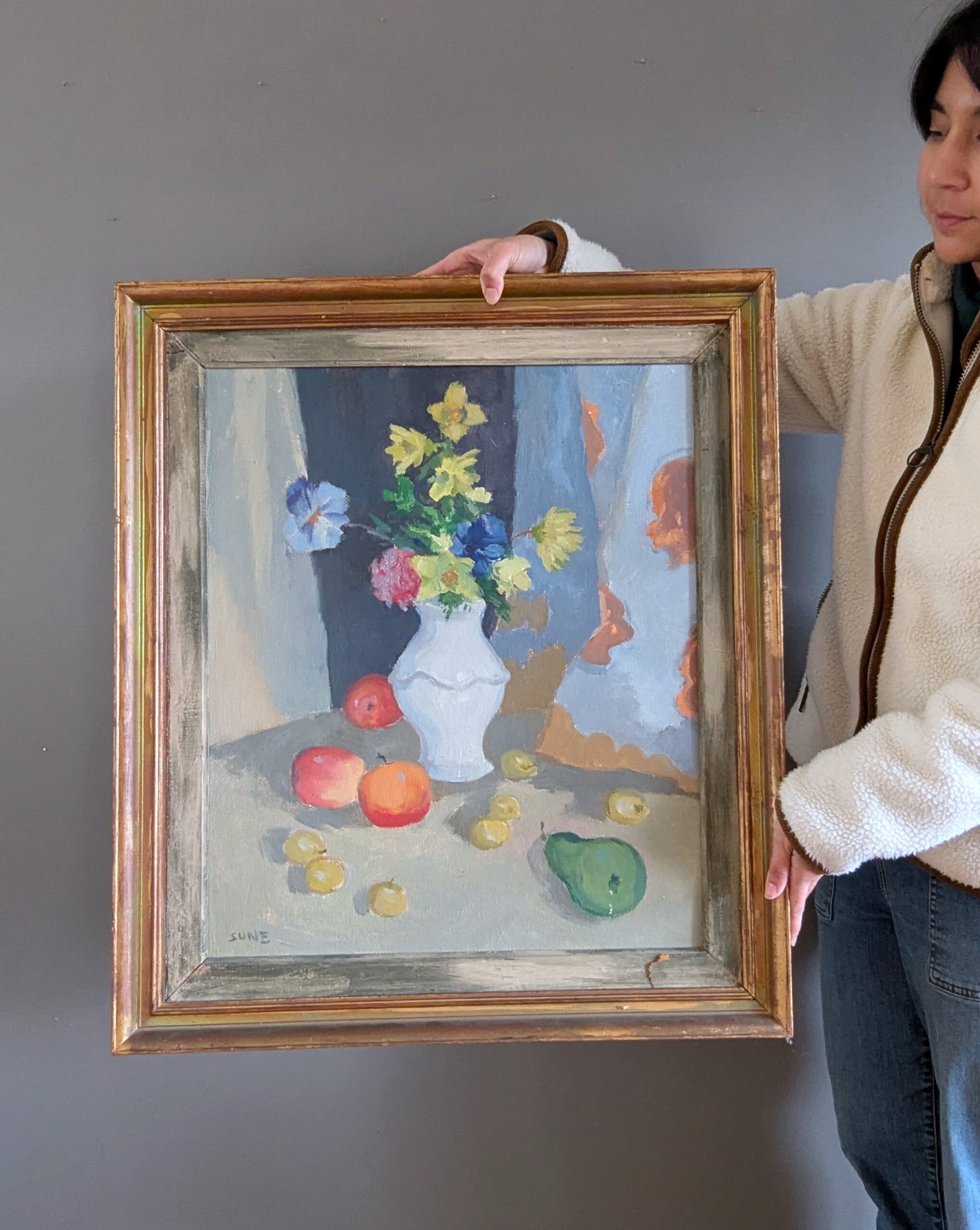 This oil on canvas is housed in a well-suited wide-profile wood frame that complements the painting’s mid-century character. The artwork itself is in excellent vintage condition. The frame shows age-commensurate wear, including a few marks to its edges as shown, however this does not detract from its overall presentation.