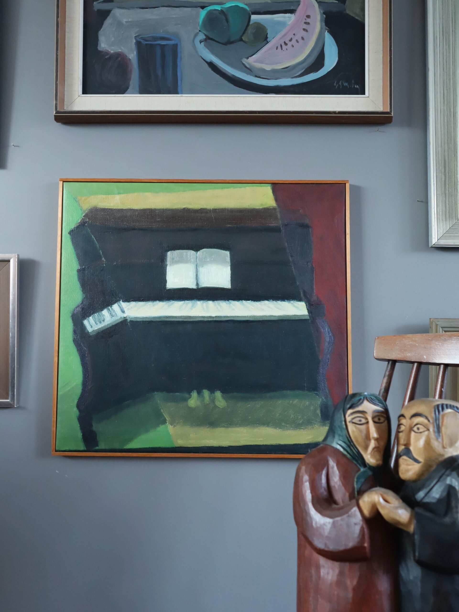 Painted in a distinctly mid-century modern style, the work favours structure and mood over detail. Forms are simplified and confidently blocked in, lending the scene a quiet solidity and timeless charm.
