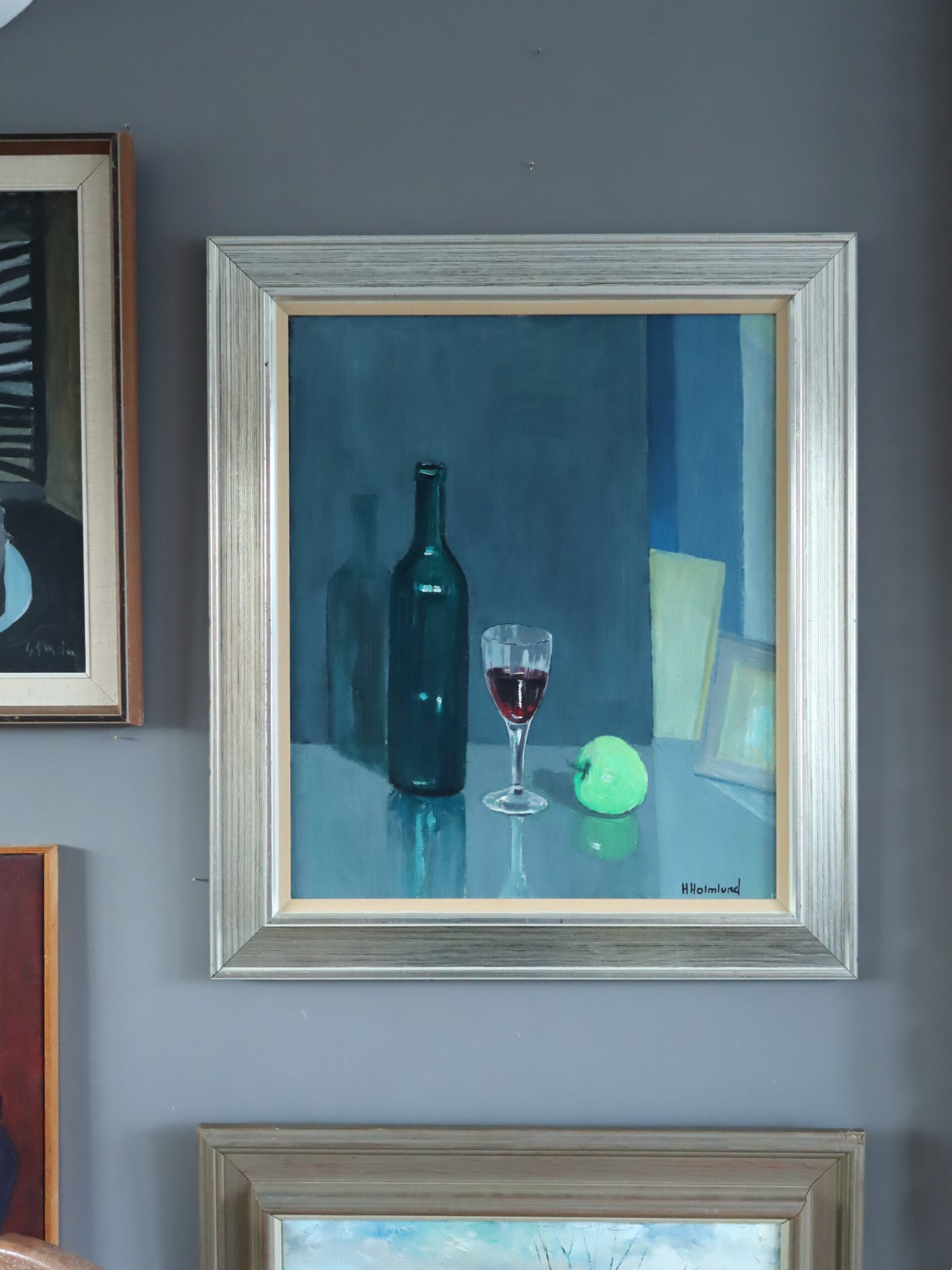 A refined mid-century interior still life painting, executed in oil onto canvas.