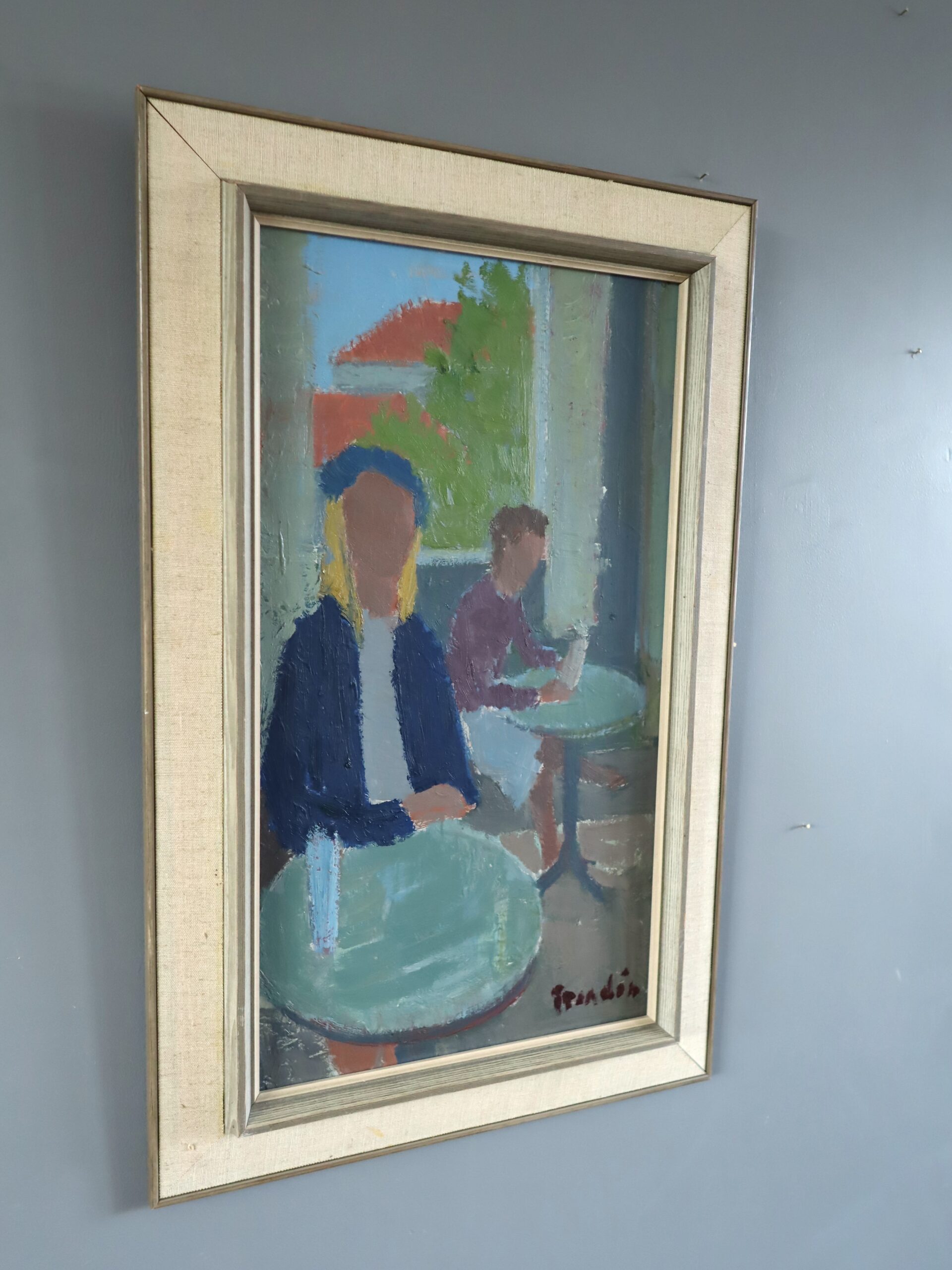 A small yet impactful mid-century figurative scene capturing two figures seated side by side and absorbed in an activity,  painted in oil onto canvas.
