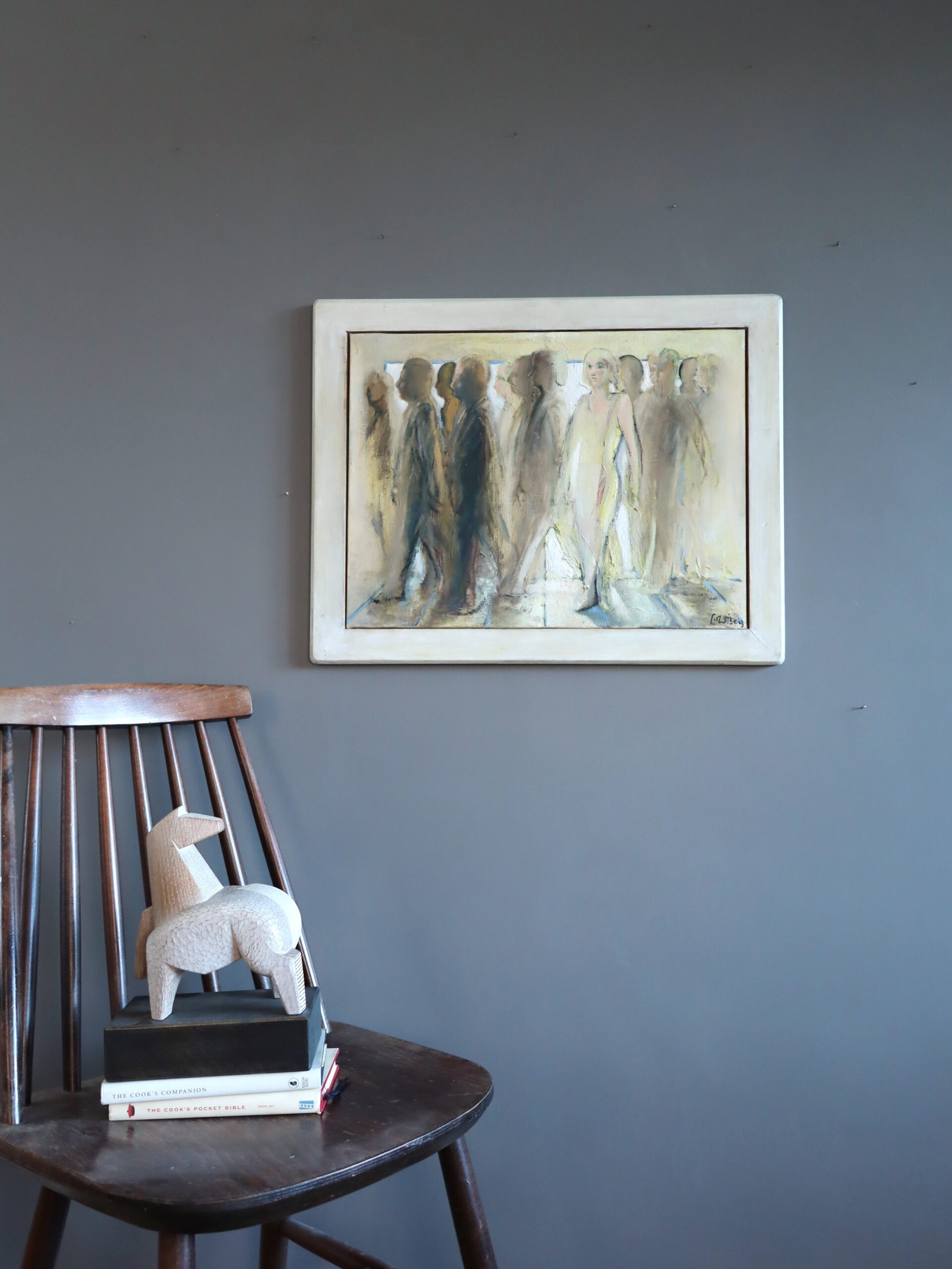 An emotive mid-century figurative painting that captures a procession of elongated figures moving through a softly lit interior space, executed in oil onto canvas.
