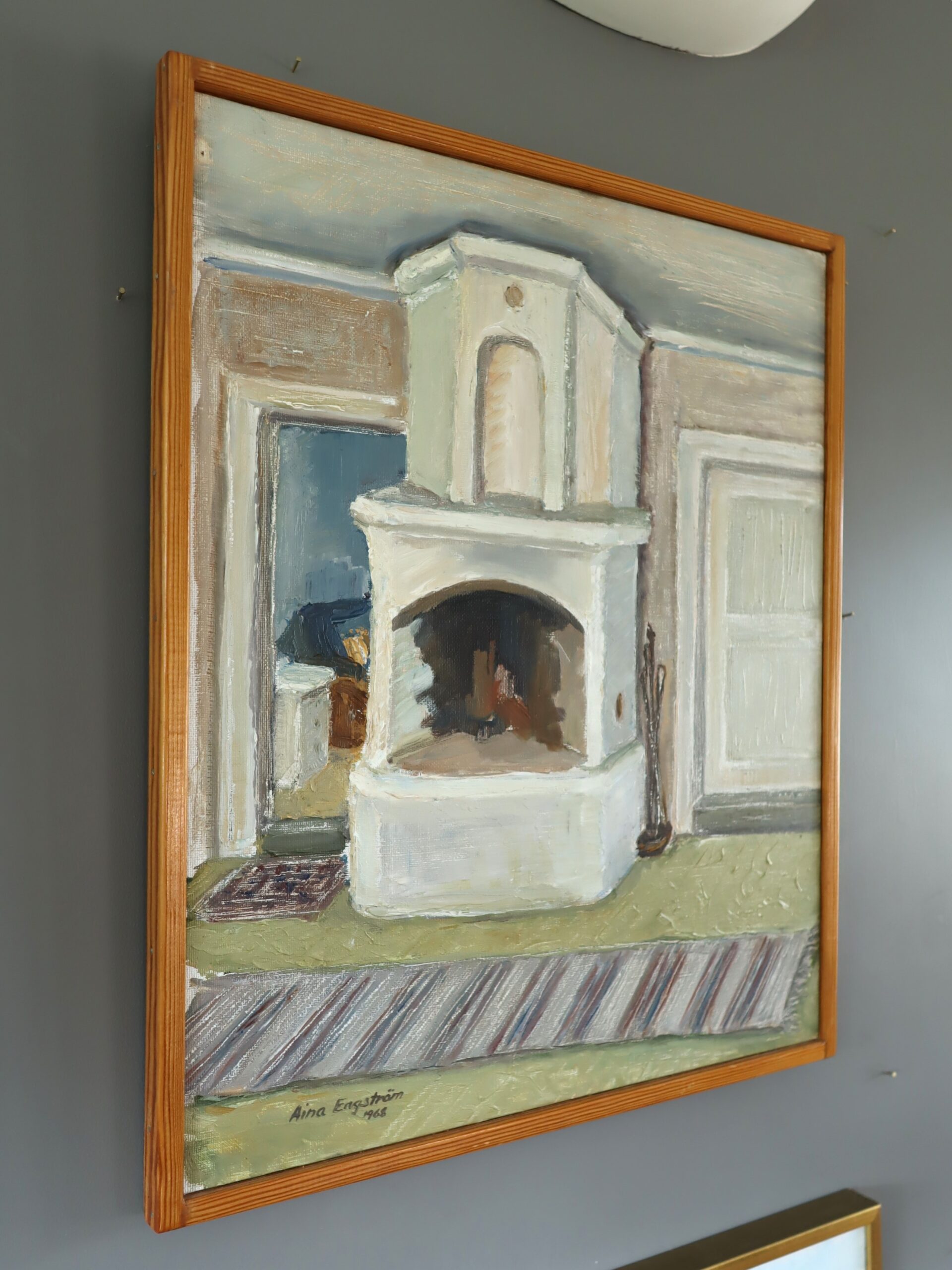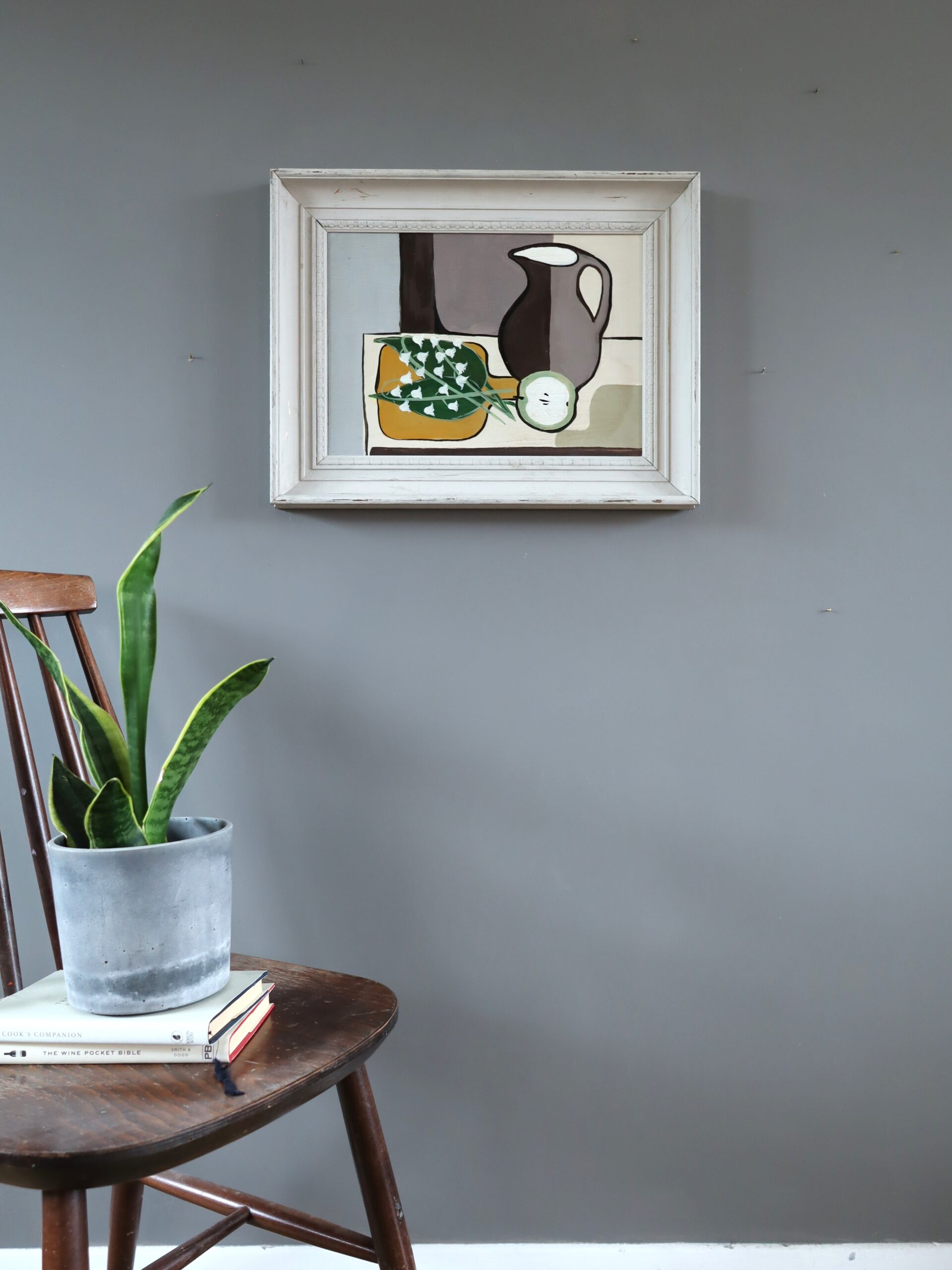 This oil on canvas is housed in a complementary hessian lined wood frame. The painting is in excellent vintage condition, and the frame has some scuffs.
