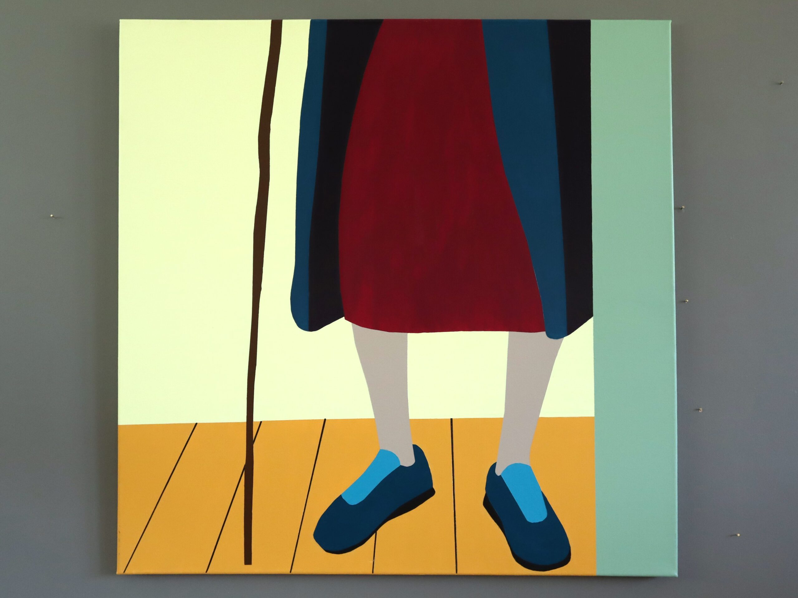 This painting is a bold, minimalist representation of a standing figure, shown from the waist down. The figure wears a red skirt, blue coat or outer garment, and blue shoes with lighter blue uppers, and holds a brown walking stick, which adds a sense of balance the composition.
