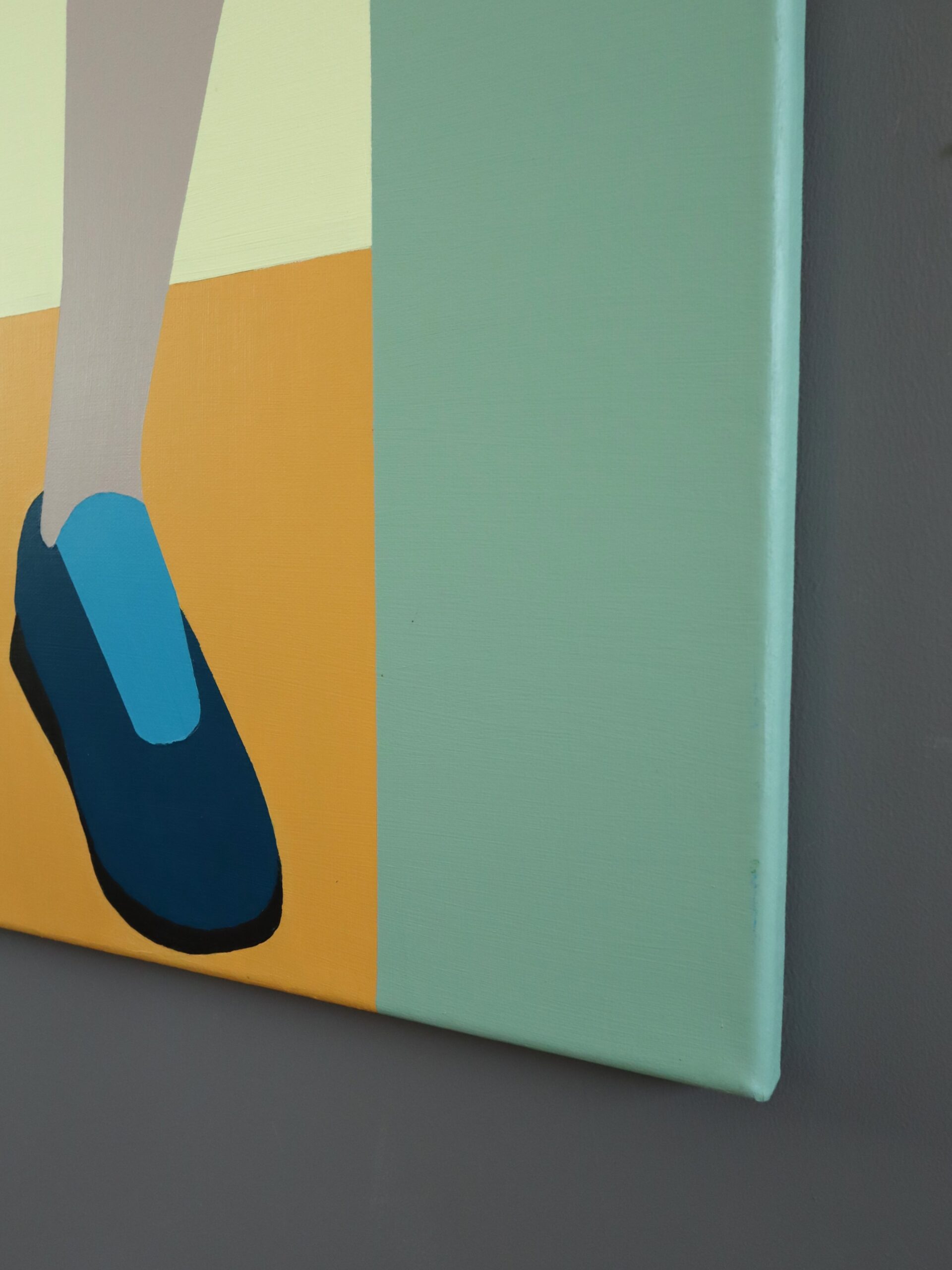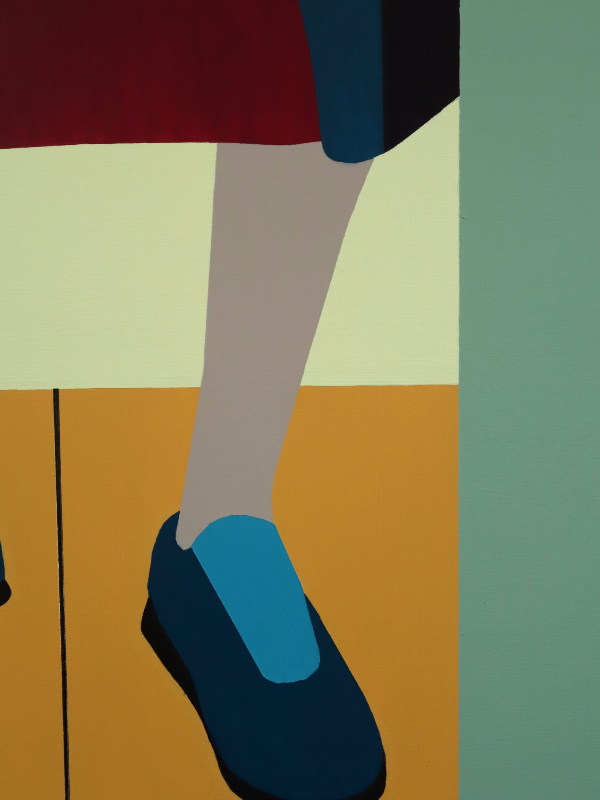 The style is flat and graphic, with solid blocks of colour and no shading or detail, creating a sense of modernist abstraction. The background consists of a light yellow wall, a mint green doorframe, and a warm ochre wooden floor with black lines indicating floorboards. The figure’s pale legs contrast against the colourful clothes and shoes, and the use of simplified forms gives the painting a striking, almost poster-like appearance.