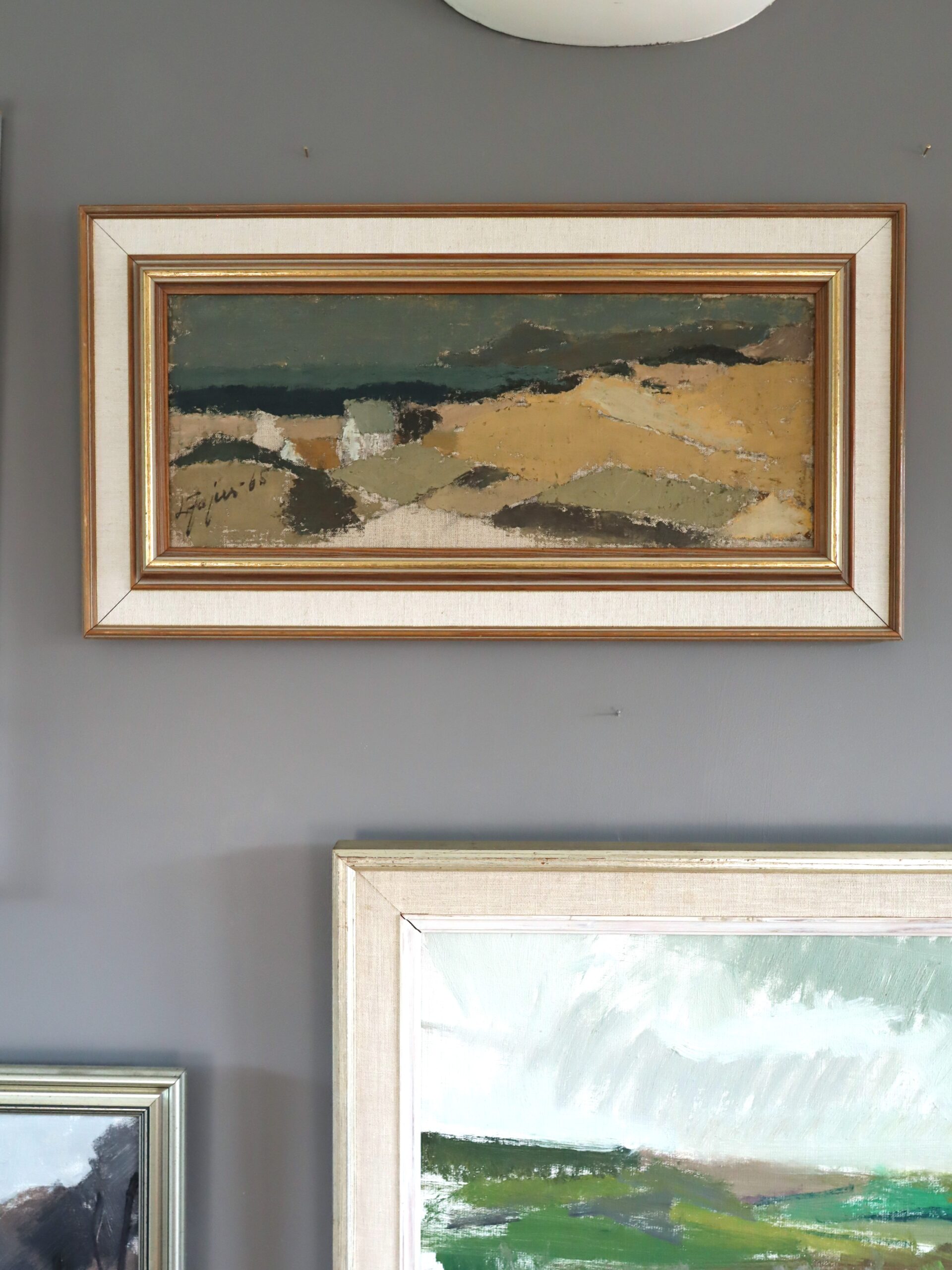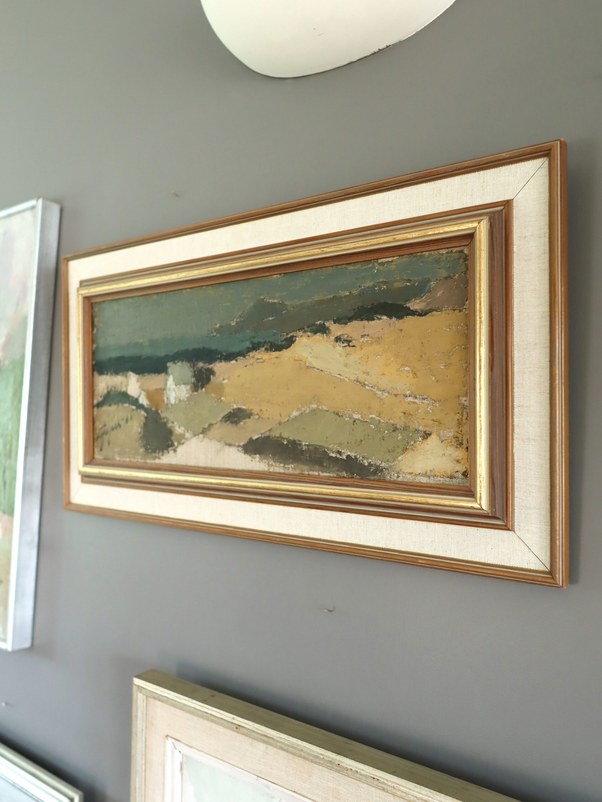 Executed in a restrained modernist style, the composition reflects the mid-century inclination toward abstraction while remaining grounded in the landscape tradition. The artist has reduced the scenery into layered, geometric passages, allowing the rhythm of land and sea to unfold through balanced shapes rather than literal detail. This approach creates a sense of calm structure and contemplative stillness, inviting the viewer to experience the landscape as both place and memory.