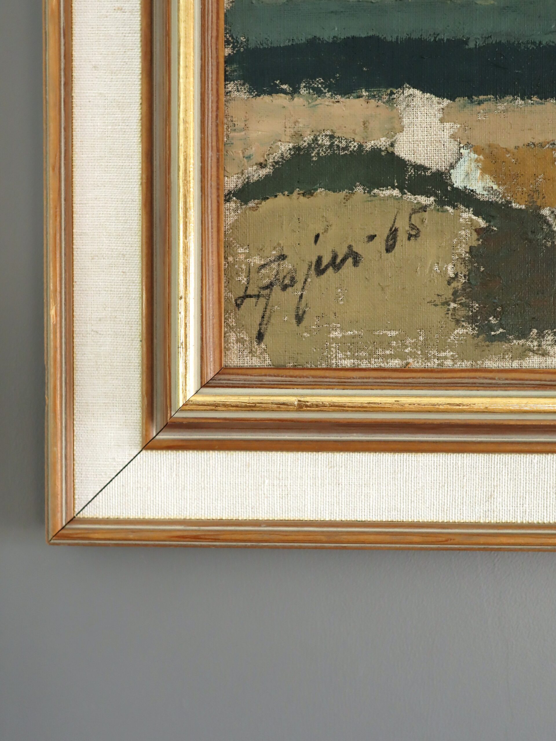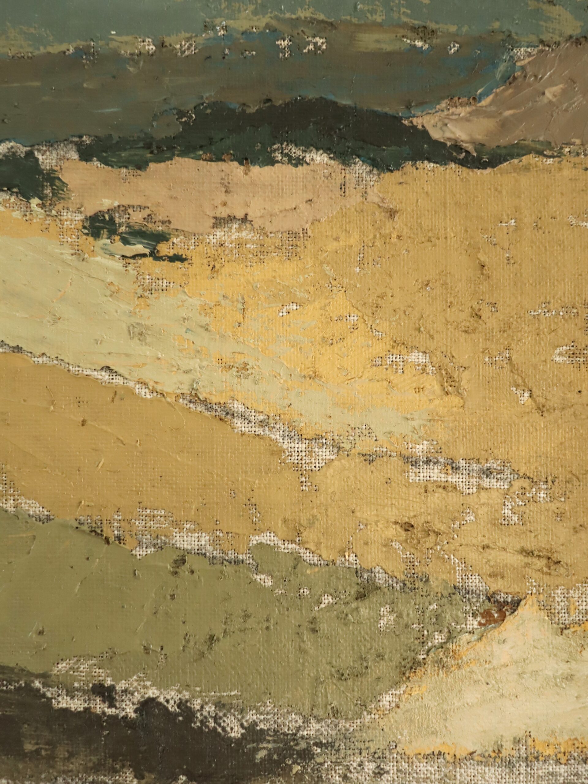 The brushwork is textural yet controlled, with areas of dry brush and impasto that allow the weave of the canvas to emerge through the paint surface. Edges are softly broken and irregular, lending the composition an organic, tactile quality. This interplay between material texture and simplified form enhances the painting’s atmospheric presence, embodying the quiet elegance and thoughtful restraint characteristic of mid-century modernist landscape painting.