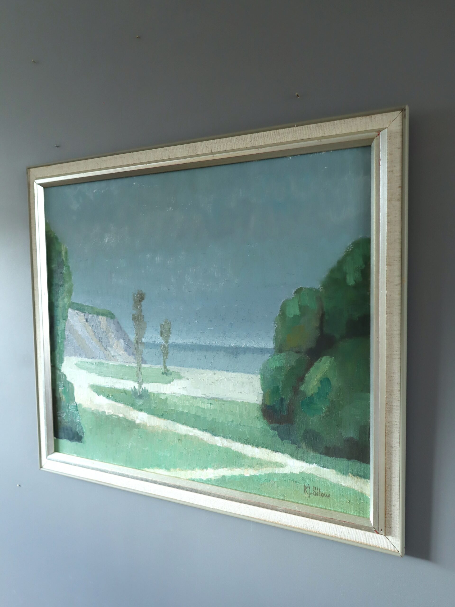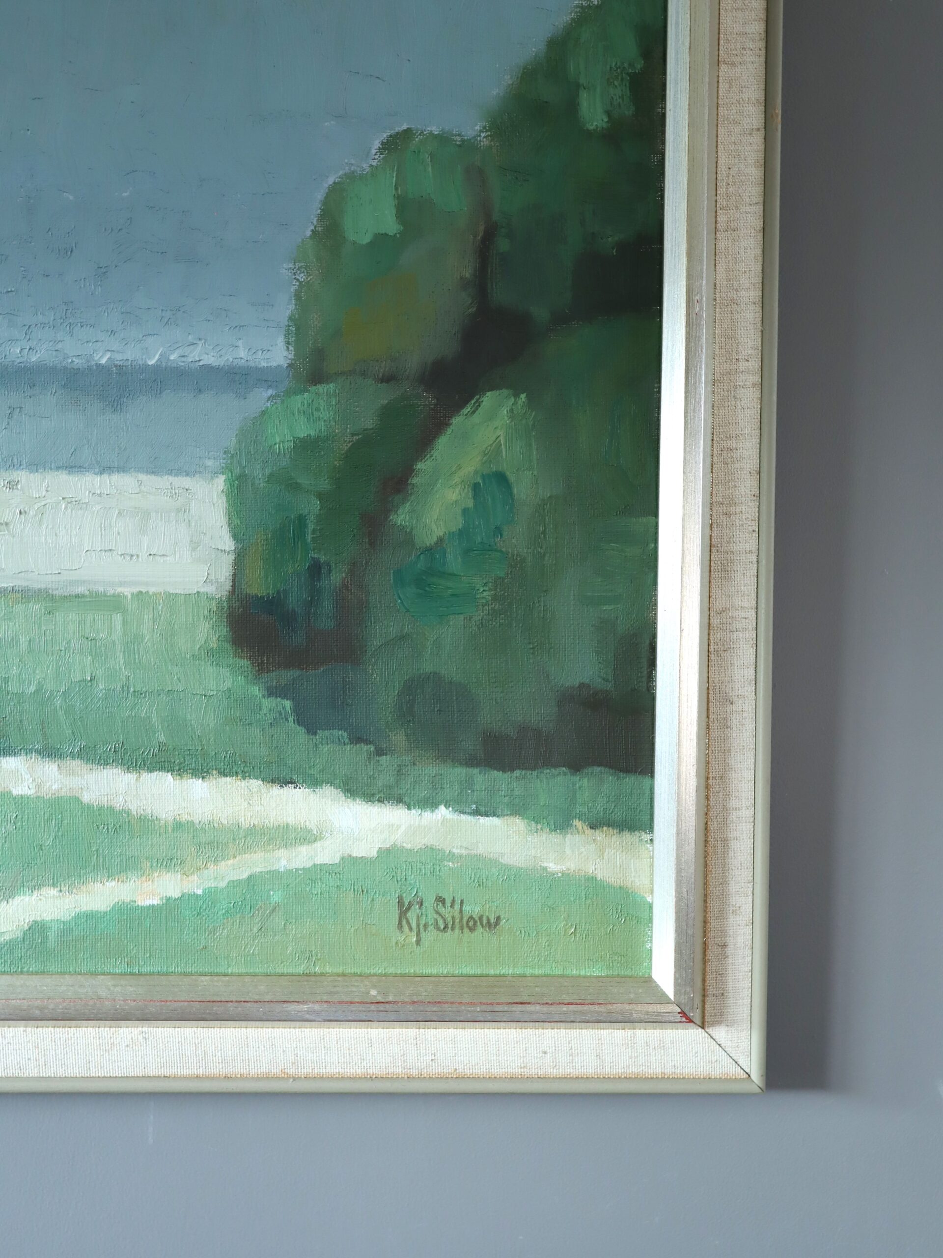 A serene mid-century landscape that captures a quiet coastal scene defined by openness, balance, and gentle geometry, executed in oil onto canvas.