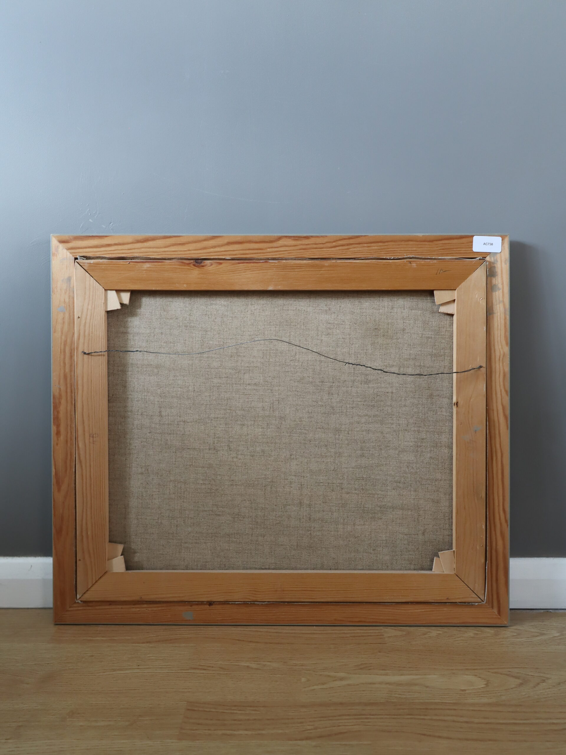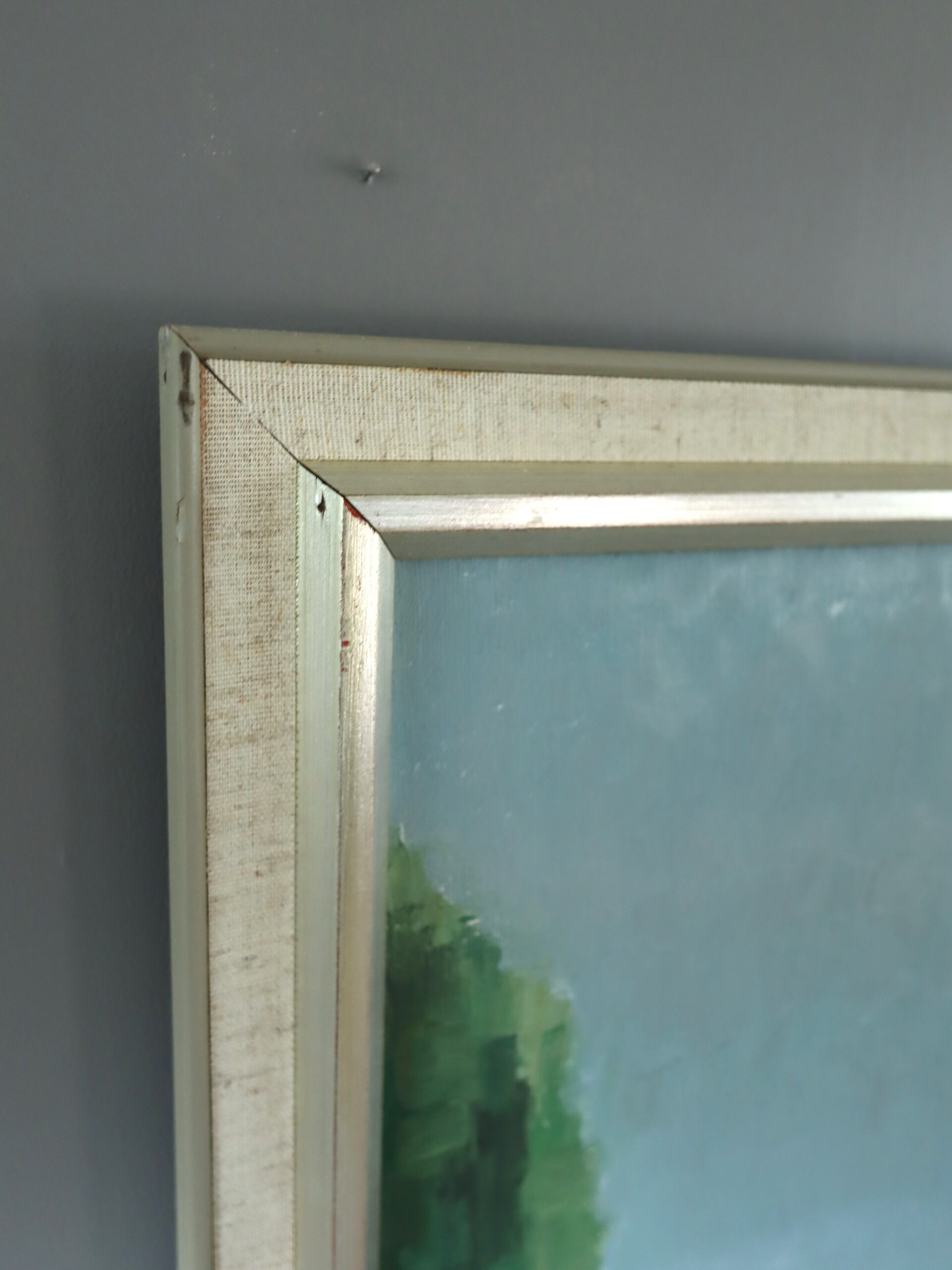 This oil on canvas is housed in a complementary linen lined wood frame with an inner silver border. The painting is in good vintage condition overall. The frame has small scuffs and marks, also consistent with age.