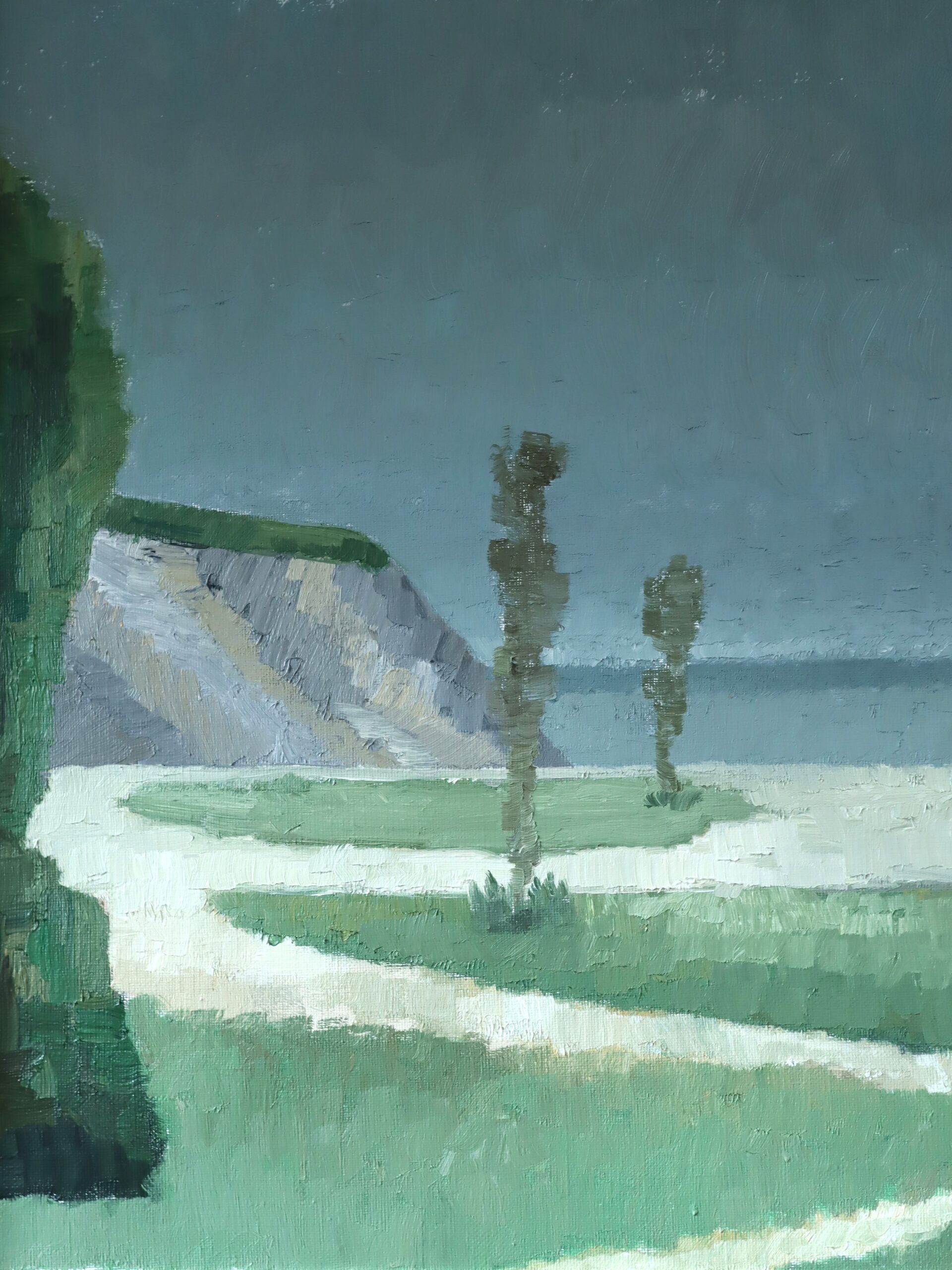 A pale winding pathway leads the viewer’s eye through a soft green foreground toward a tranquil shoreline and expansive horizon beyond. Two slender trees stand as quiet sentinels at the centre of the composition, their vertical forms offering a subtle counterpoint to the horizontal bands of land, sea, and sky. On the left, a gently rising bluff adds structure and depth, while rounded, sculptural foliage frames the scene with a sense of intimacy.