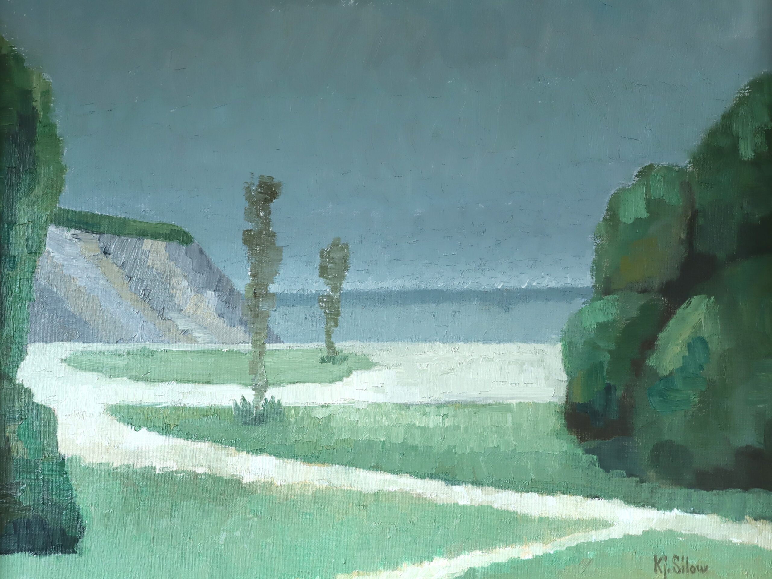 The painting is executed in a modernist, semi-abstracted style characteristic of mid-century landscape painting, where natural forms are simplified into harmonious blocks of colour and shape. The artist prioritises mood and spatial clarity over fine detail, creating a composition that feels both contemplative and timeless.