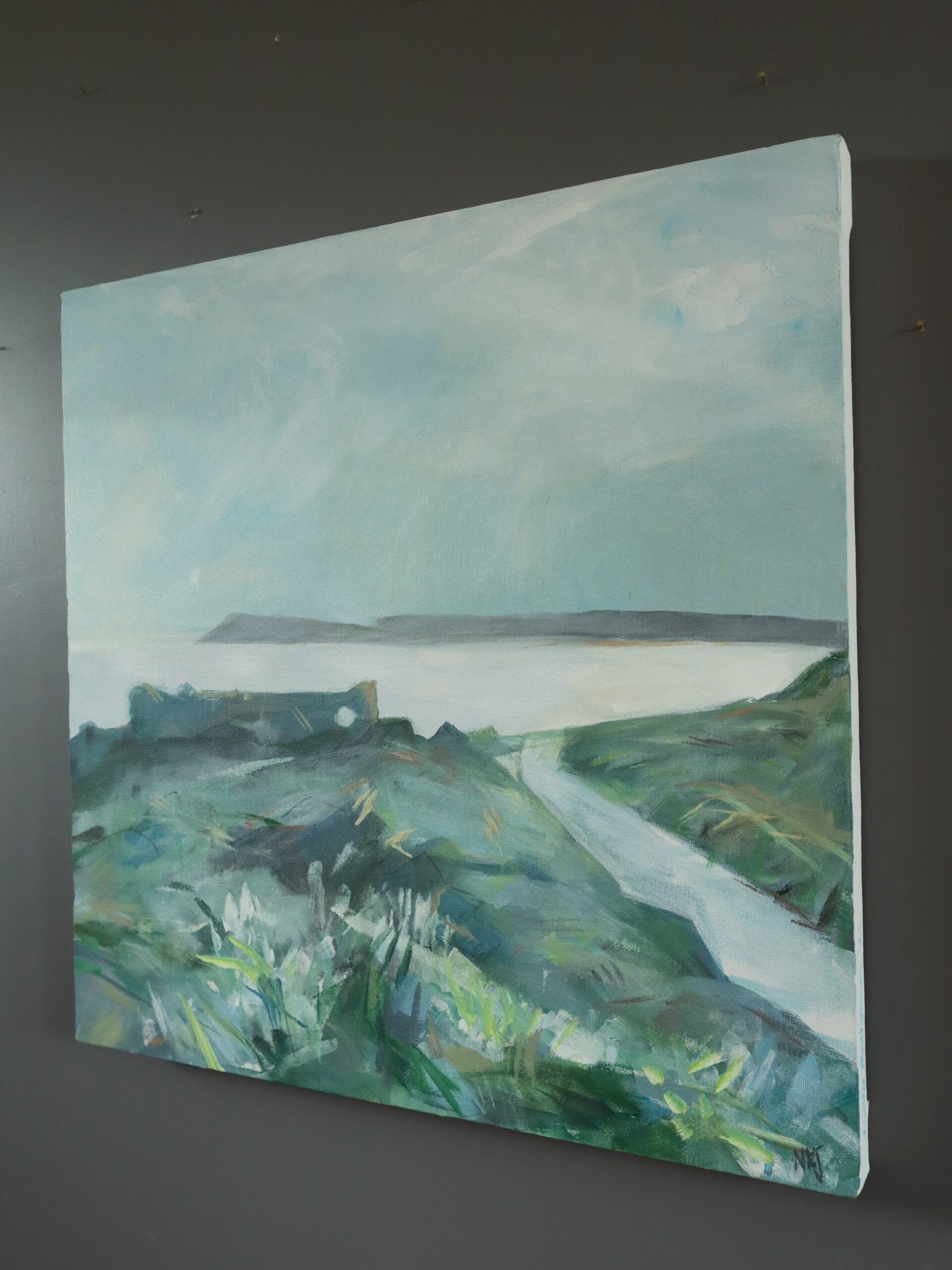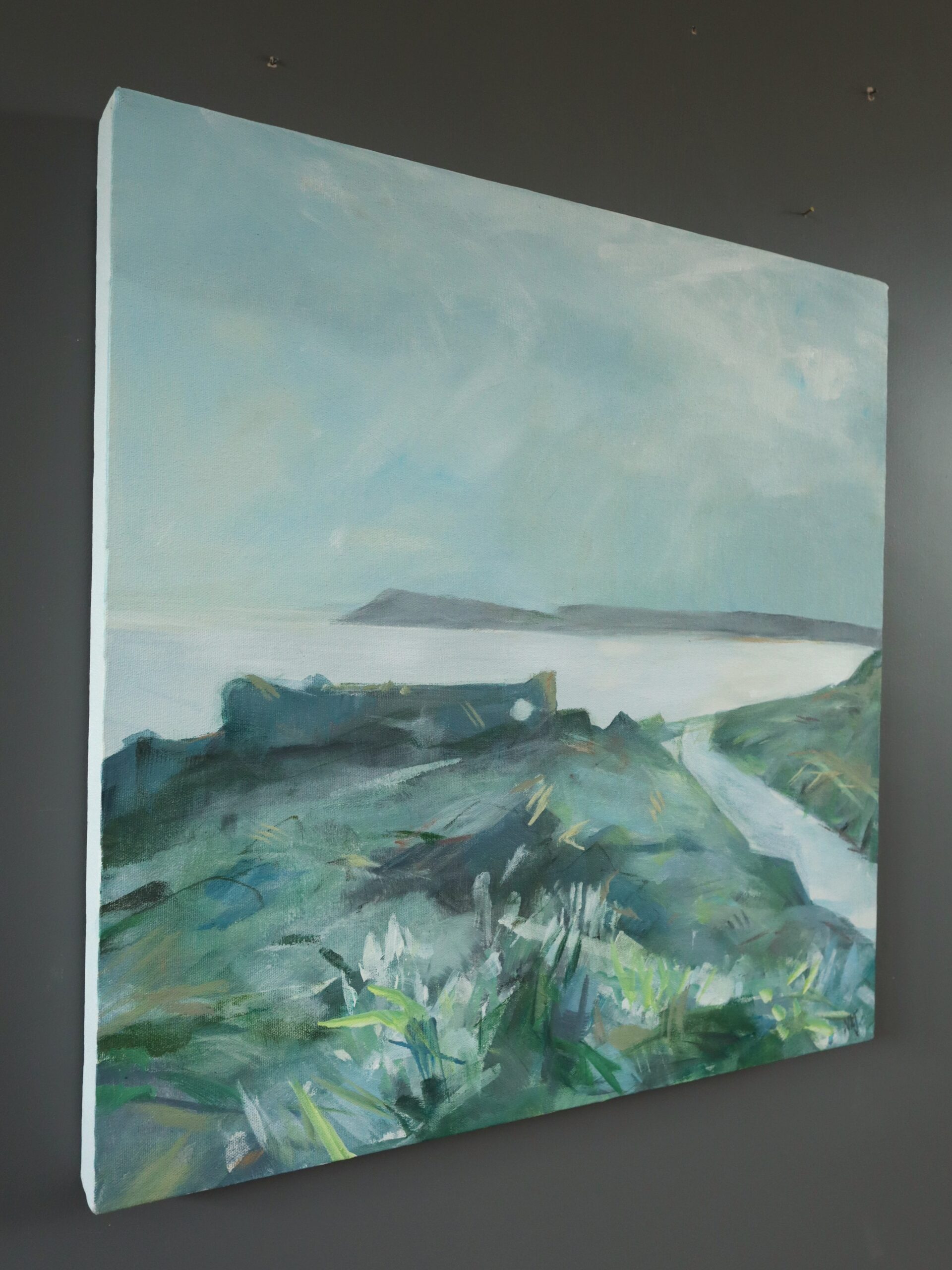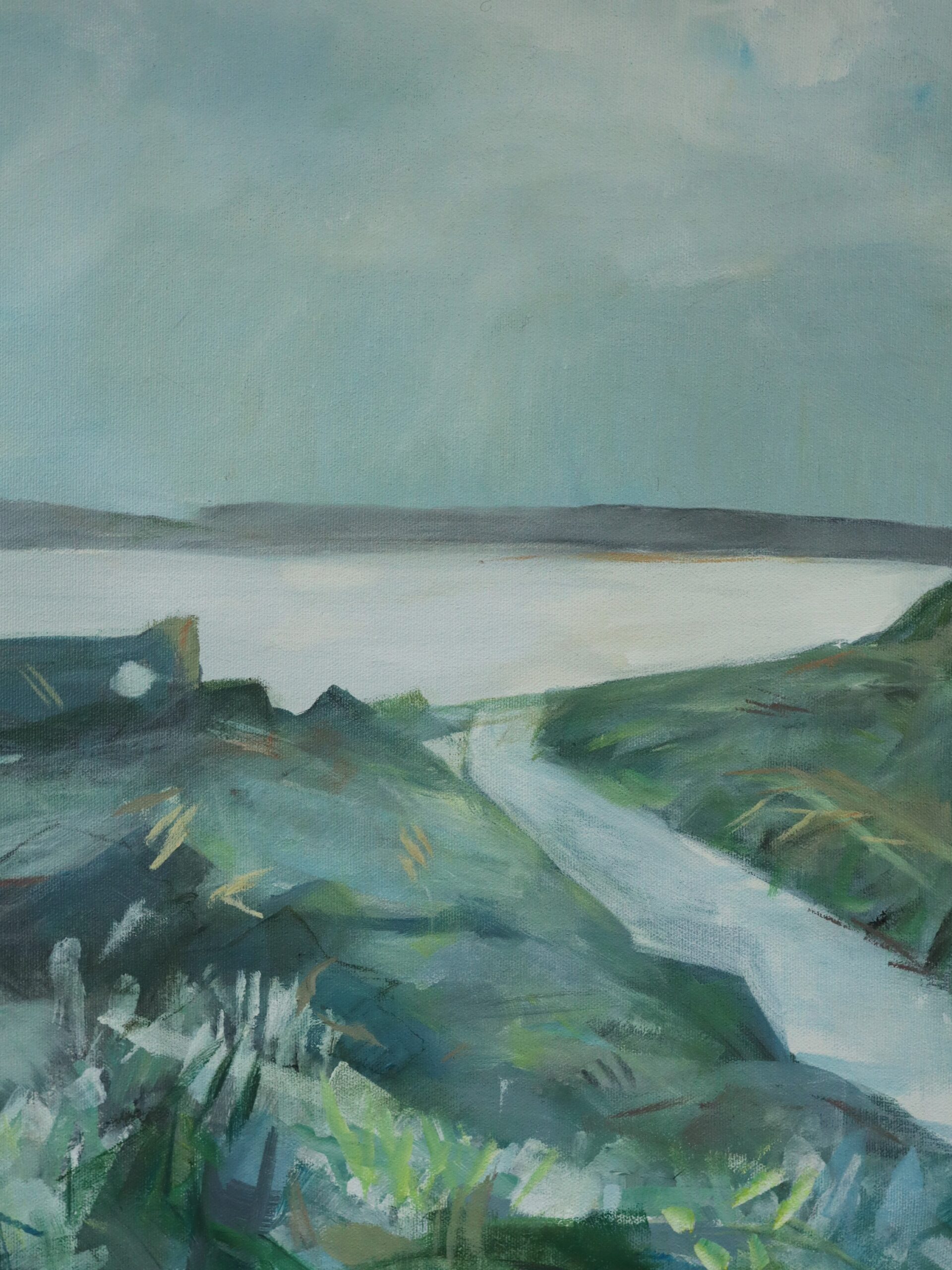 This calming landscape  captures a view of the Cornish shoreline. The composition leads the viewer’s eye along a soft, winding path that cuts through verdant green headlands, drawing attention to the expansive, pale sea in the distance. Broad, painterly brushstrokes and a palette dominated by cool greens, soft blues, and muted whites evoke the brisk, fresh atmosphere of the coast. The hazy sky and gentle gradation of light across the canvas suggest a calm, overcast day, adding a contemplative and tranquil mood to the scene. The overall impression is both dynamic and peaceful, capturing the natural beauty of Cornwall’s rugged coastline.