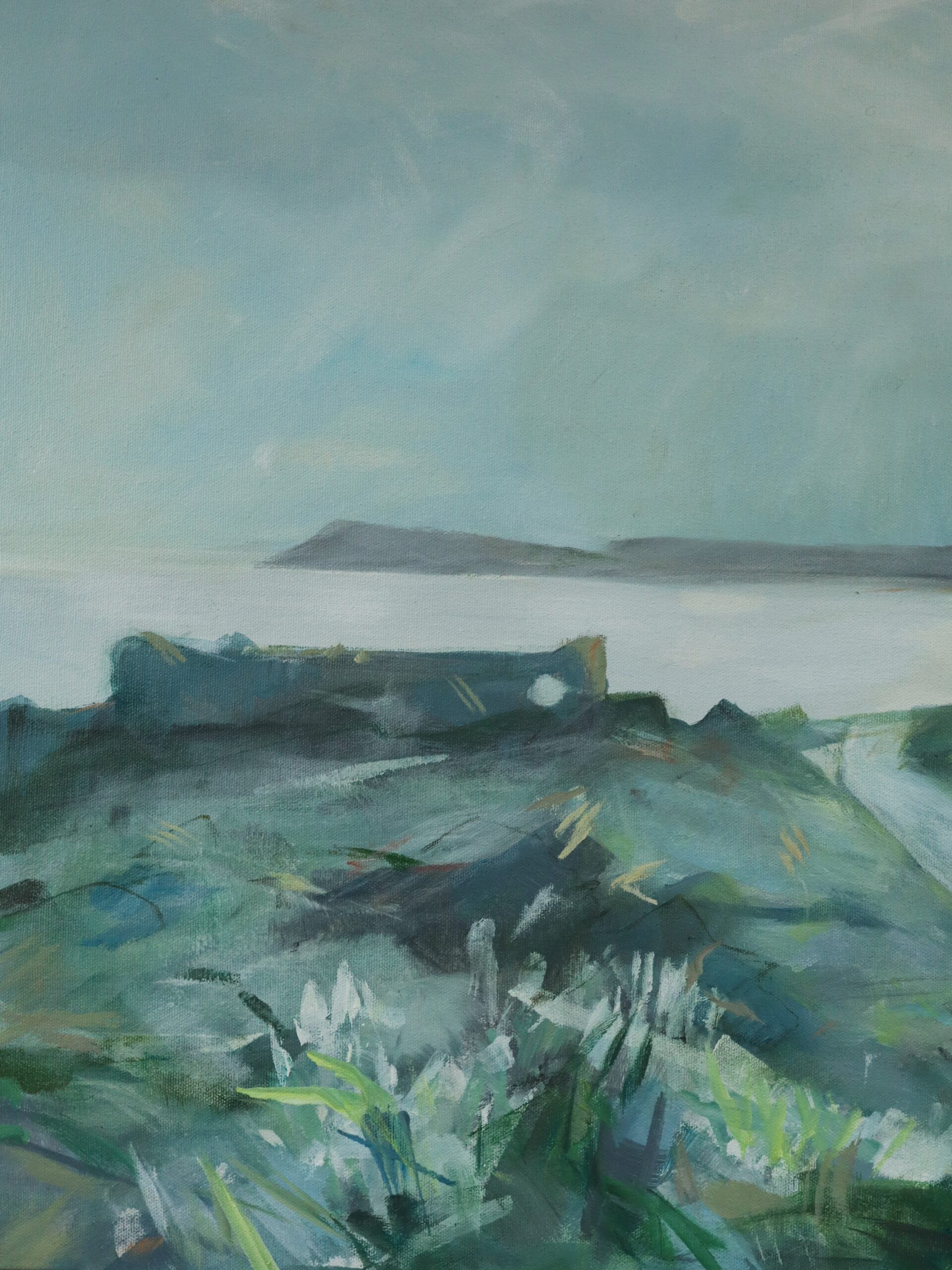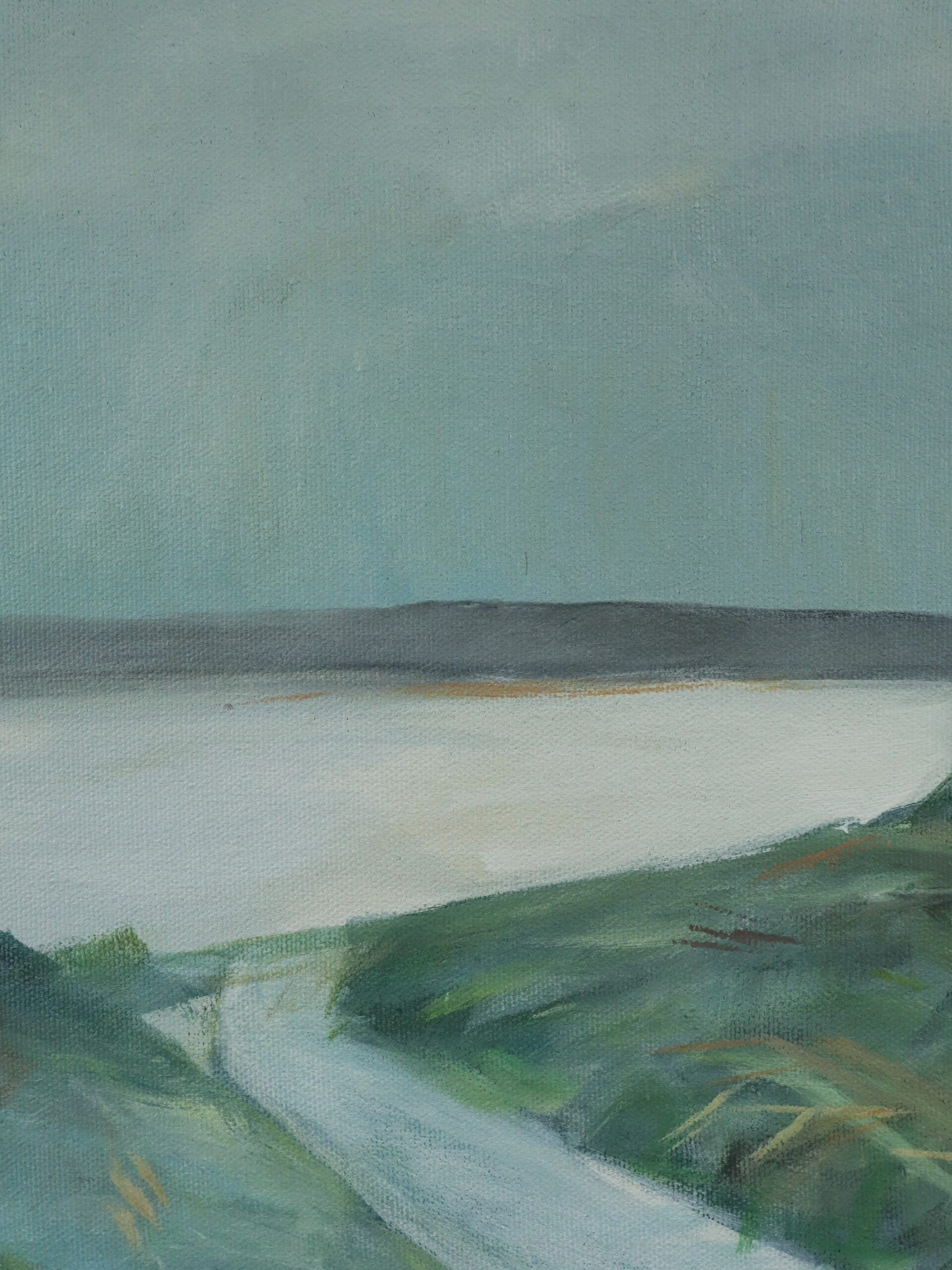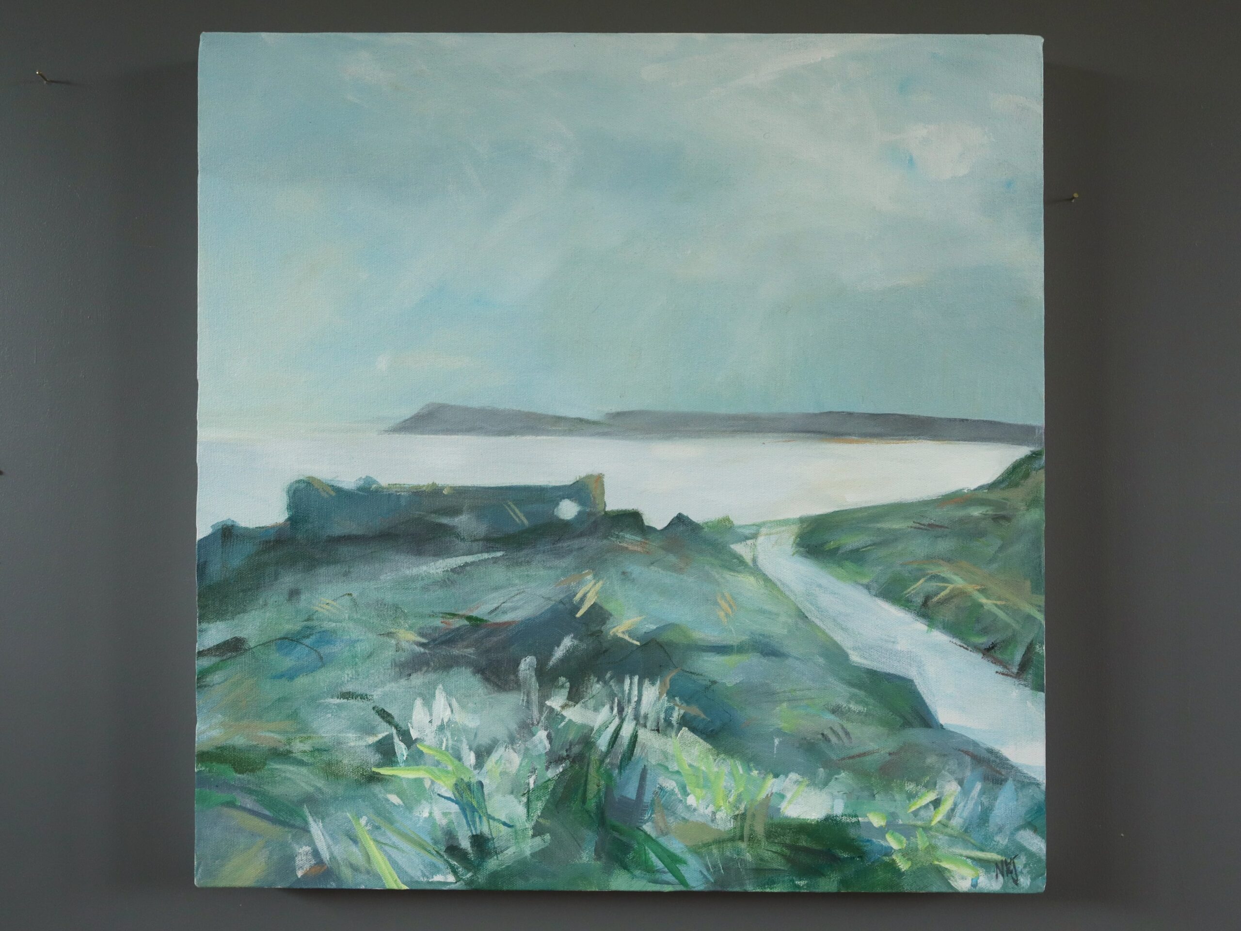 This calming landscape  captures a view of the Cornish shoreline. The composition leads the viewer’s eye along a soft, winding path that cuts through verdant green headlands, drawing attention to the expansive, pale sea in the distance. Broad, painterly brushstrokes and a palette dominated by cool greens, soft blues, and muted whites evoke the brisk, fresh atmosphere of the coast. The hazy sky and gentle gradation of light across the canvas suggest a calm, overcast day, adding a contemplative and tranquil mood to the scene. The overall impression is both dynamic and peaceful, capturing the natural beauty of Cornwall’s rugged coastline.