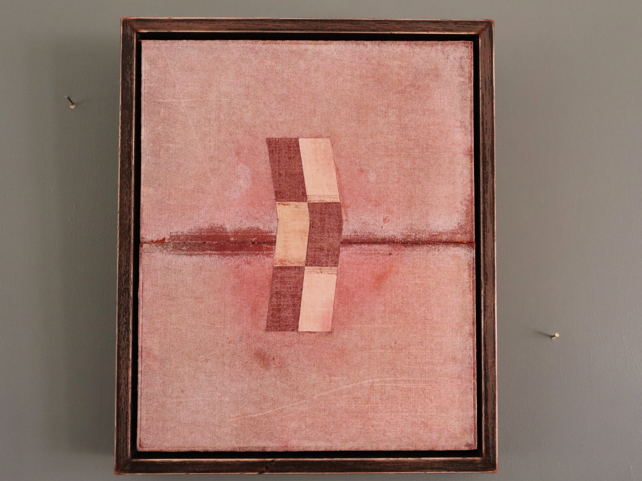 The surface is covered in faded rose-hued cloth, visibly aged with subtle textures, creases, and discoloration that speak to its previous life as part of a book cover. A horizontal seam running across the midline subtly divides the work, adding a sense of structure and time-worn narrative.