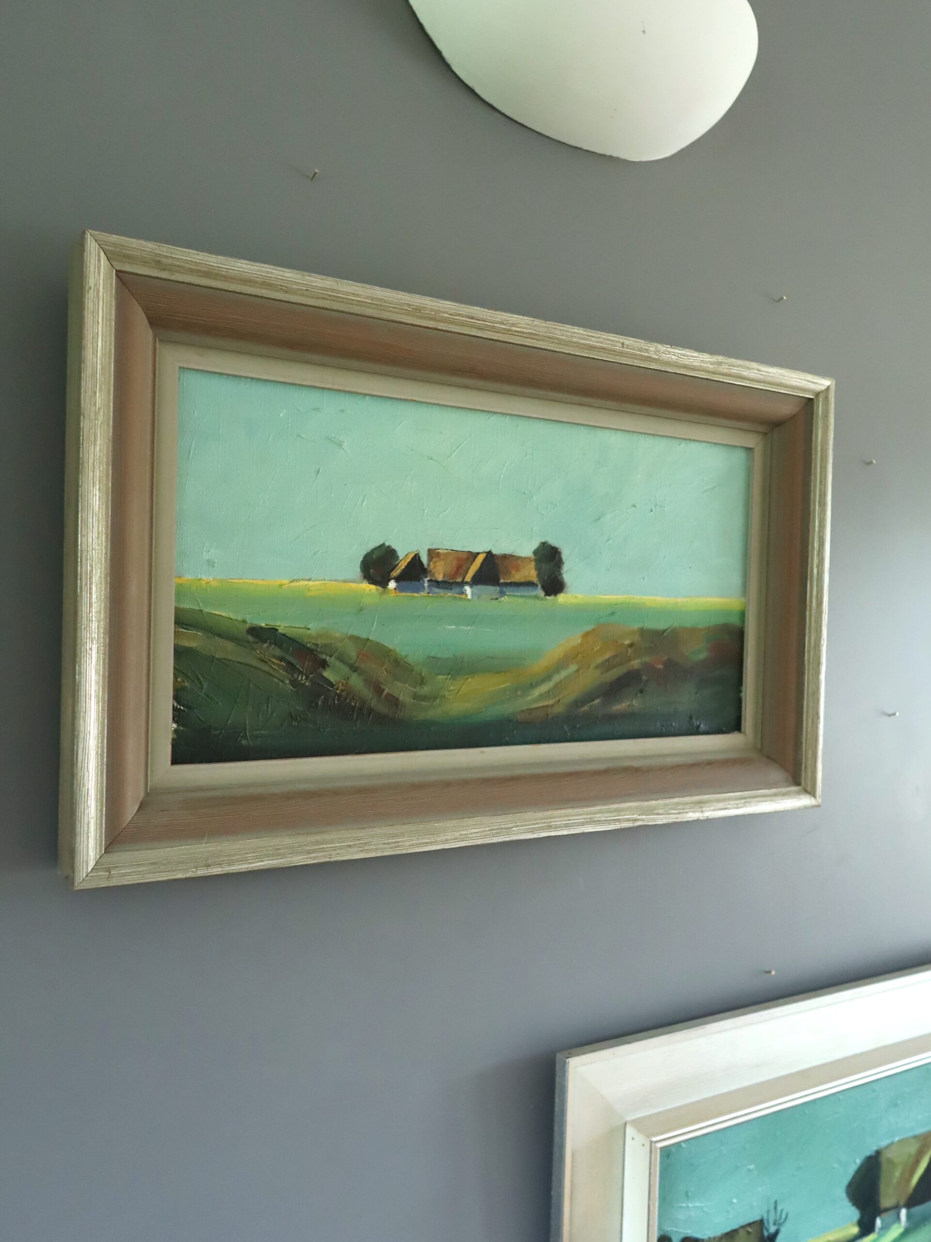 An elegant pair of mid-century landscapes that capture the quiet poetry of rural life through a minimalist modernist lens, and executed in oil onto canvas.