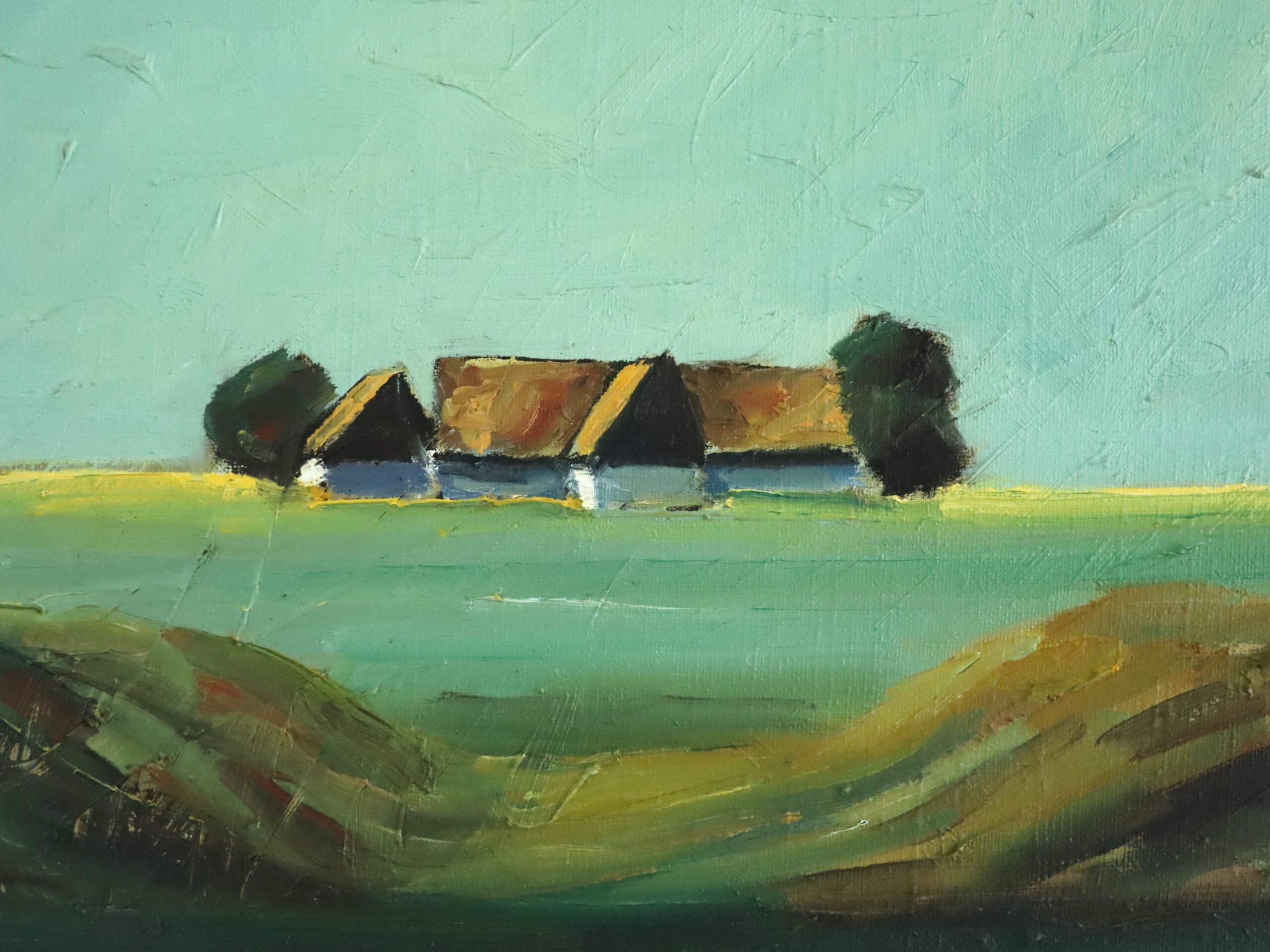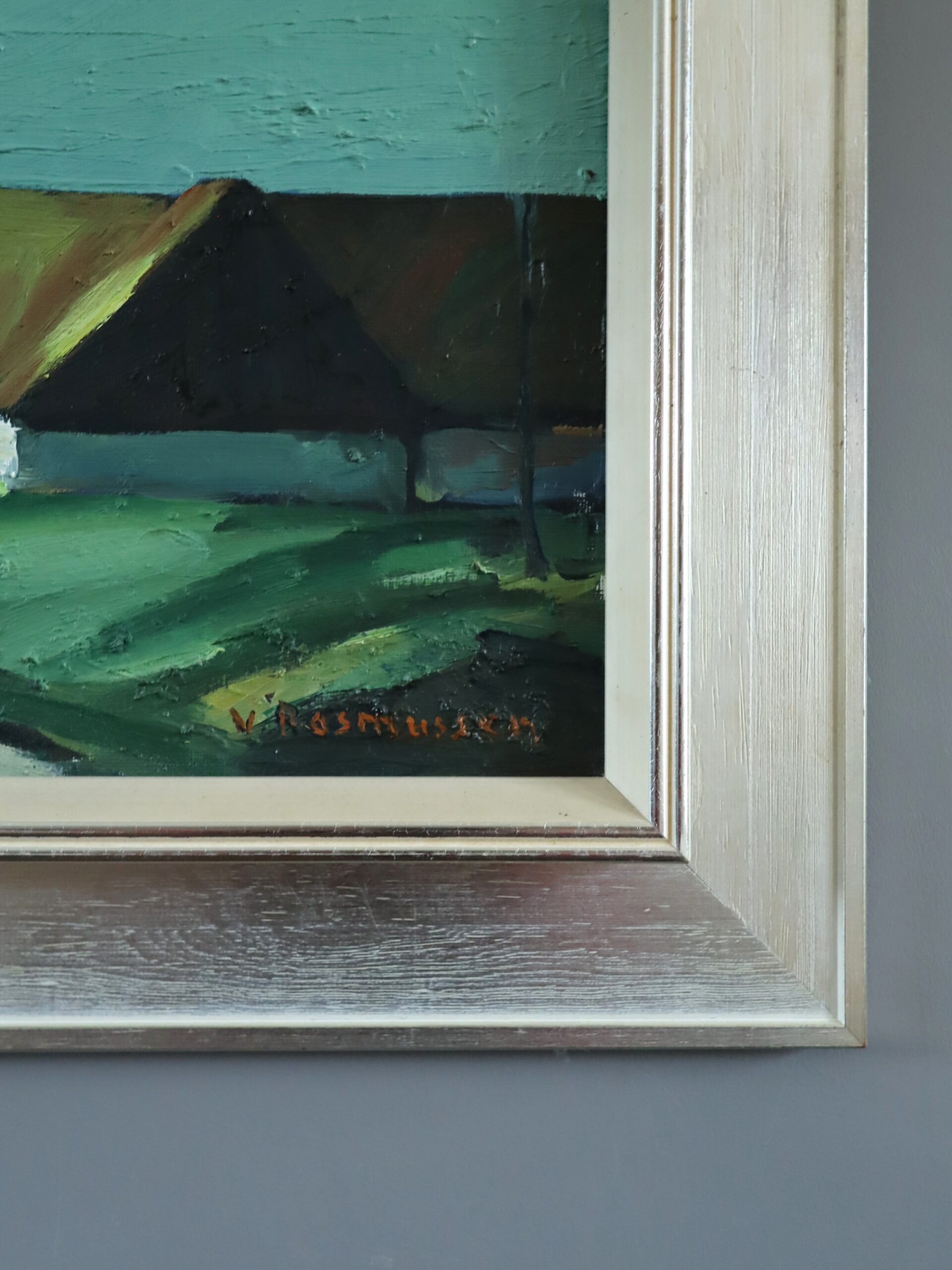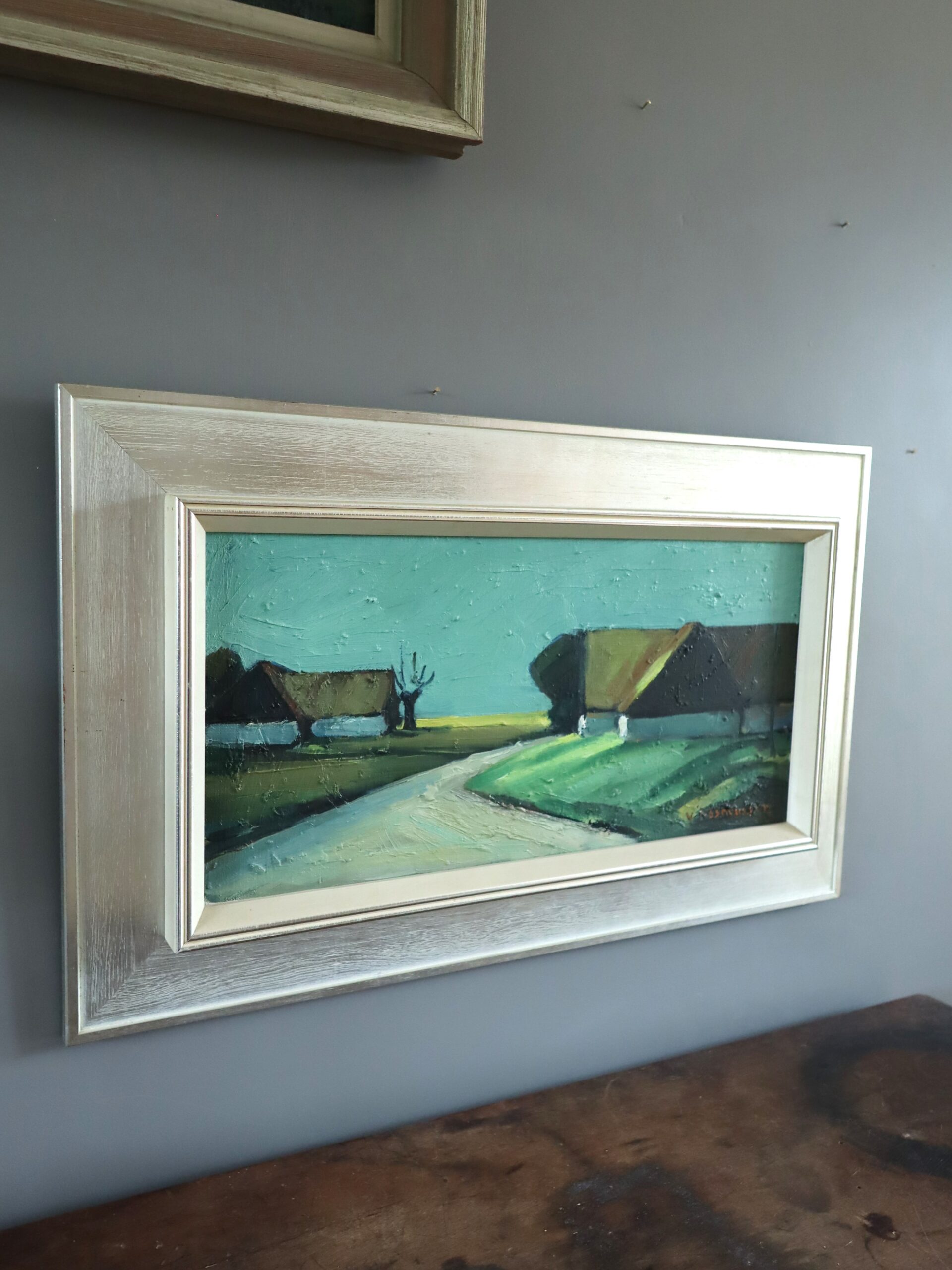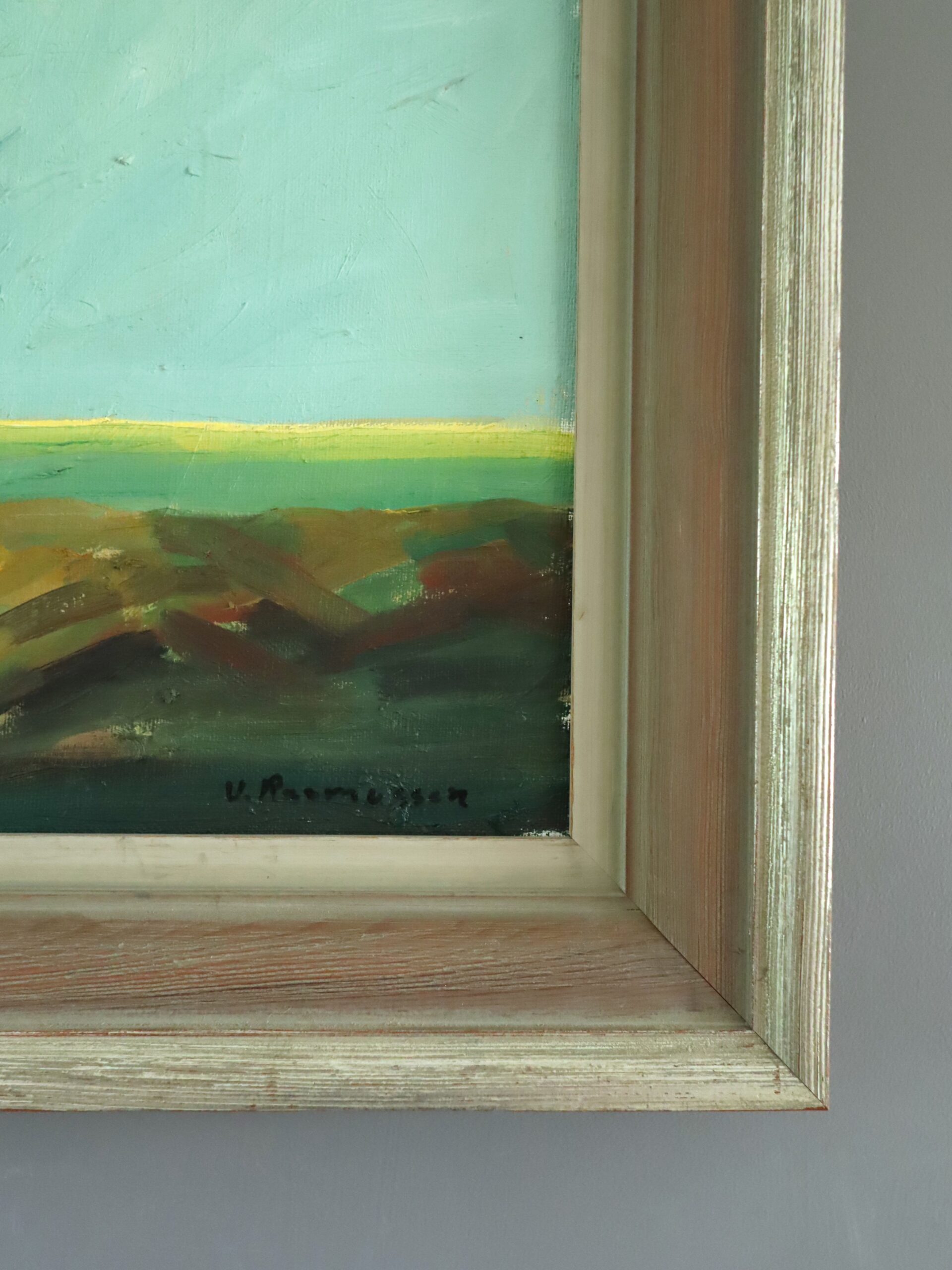 The artist’s style is distinctly modernist, characterised by bold, simplified forms and strong, rhythmic geometry within the land contours. The palette is a refined harmony of sage greens, browns, and teal-blue skies – colours that evoke both calm and structure. Thick, expressive brushstrokes convey texture and light with confident economy, allowing the paint itself to suggest the terrain’s movement and atmosphere.