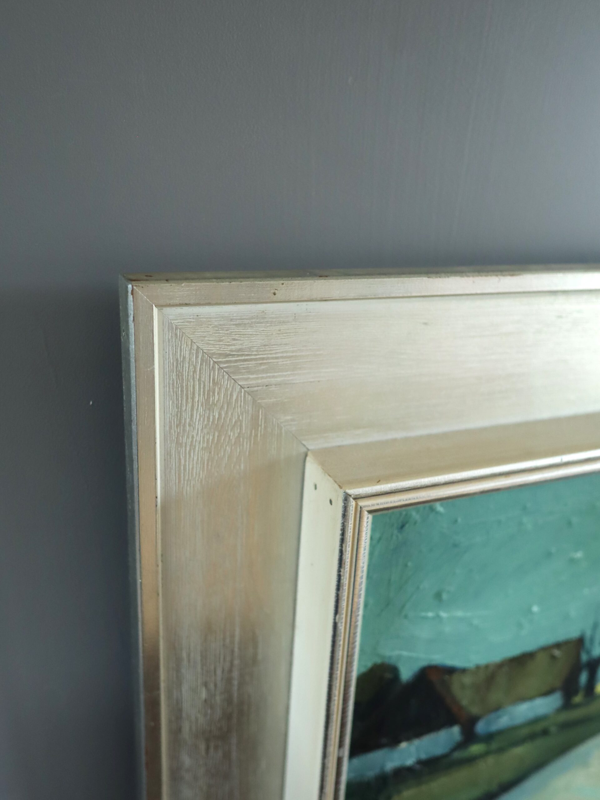 These oil on canvases are presented in beautifully complementary mid-century style frames that enhance their serene, modernist quality. One in a soft silvered wood finish, and the other in a champagne-gold undertone finish. Both the paintings and frames are in excellent vintage condition.