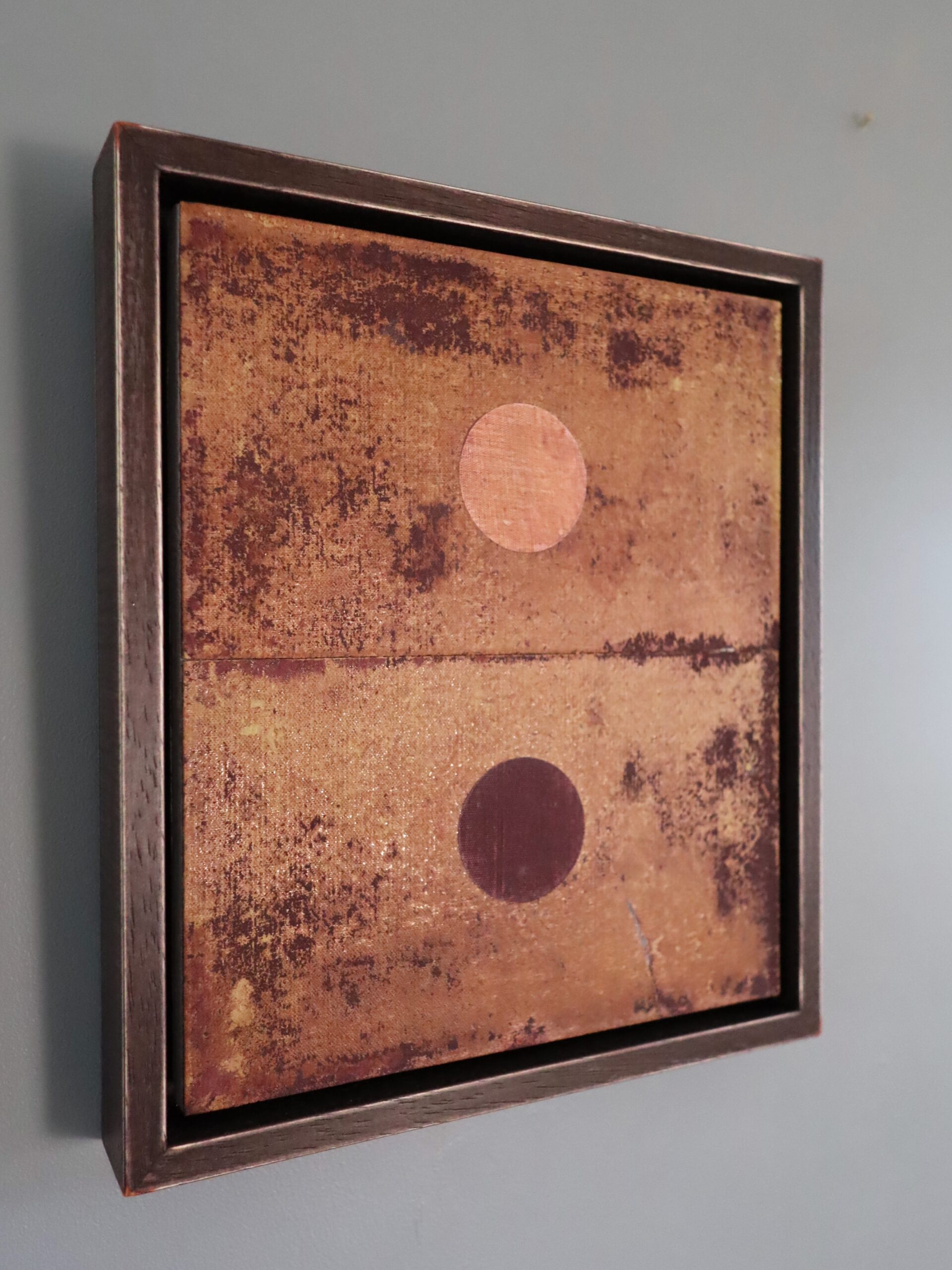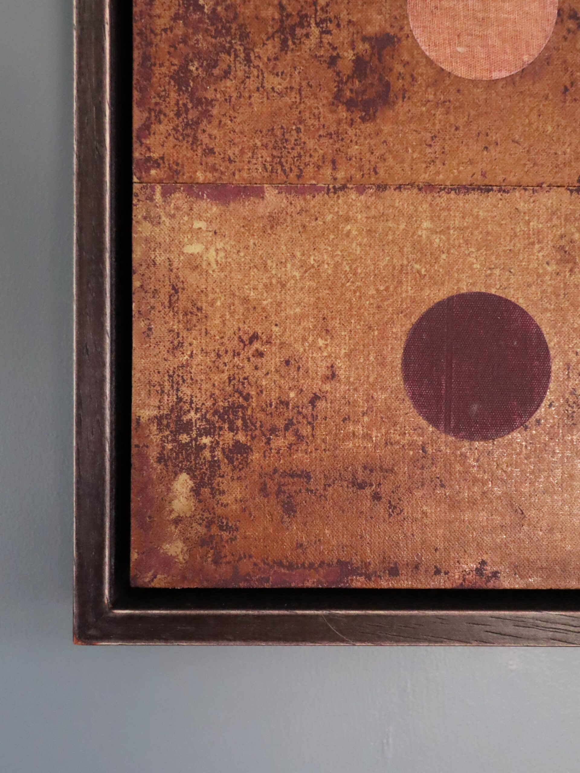 Centred in the upper half is a soft pinkish-orange circle, and in the lower half, a deep maroon or burgundy circle, both crisply defined but softly textured. The background is a heavily textured rust-brown surface, almost like oxidized metal or aged earth. It’s speckled with natural-looking marks, scuffs, and tonal variation, creating a sense of history and suggesting time, wear, and process.