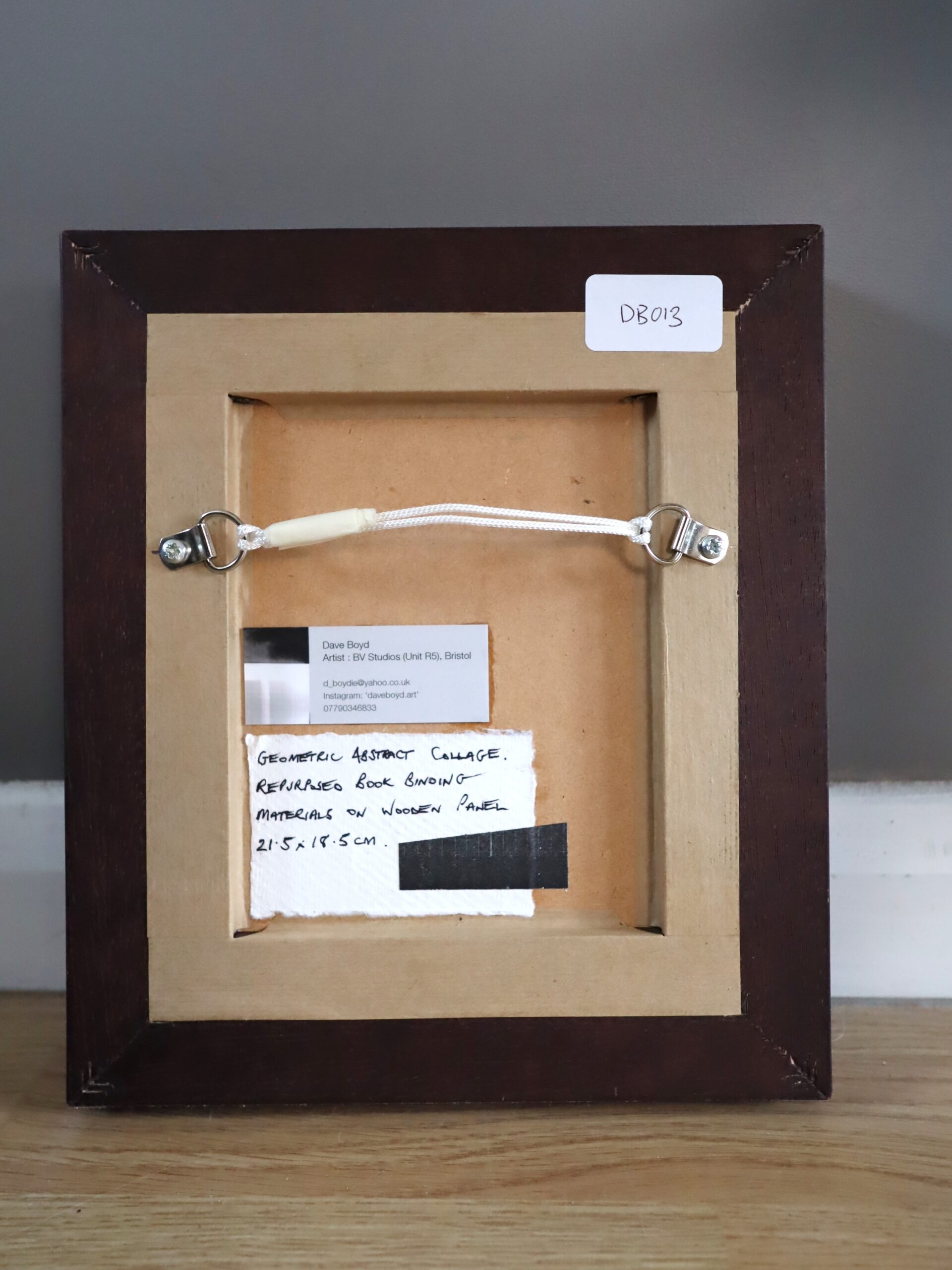 A very unique original artwork by British artist Dave Boyd, constructed from discarded books (repurposed cloth covers, papers, cardboard, binding boards) mounted on a wooden panel in a solid wood float frame.