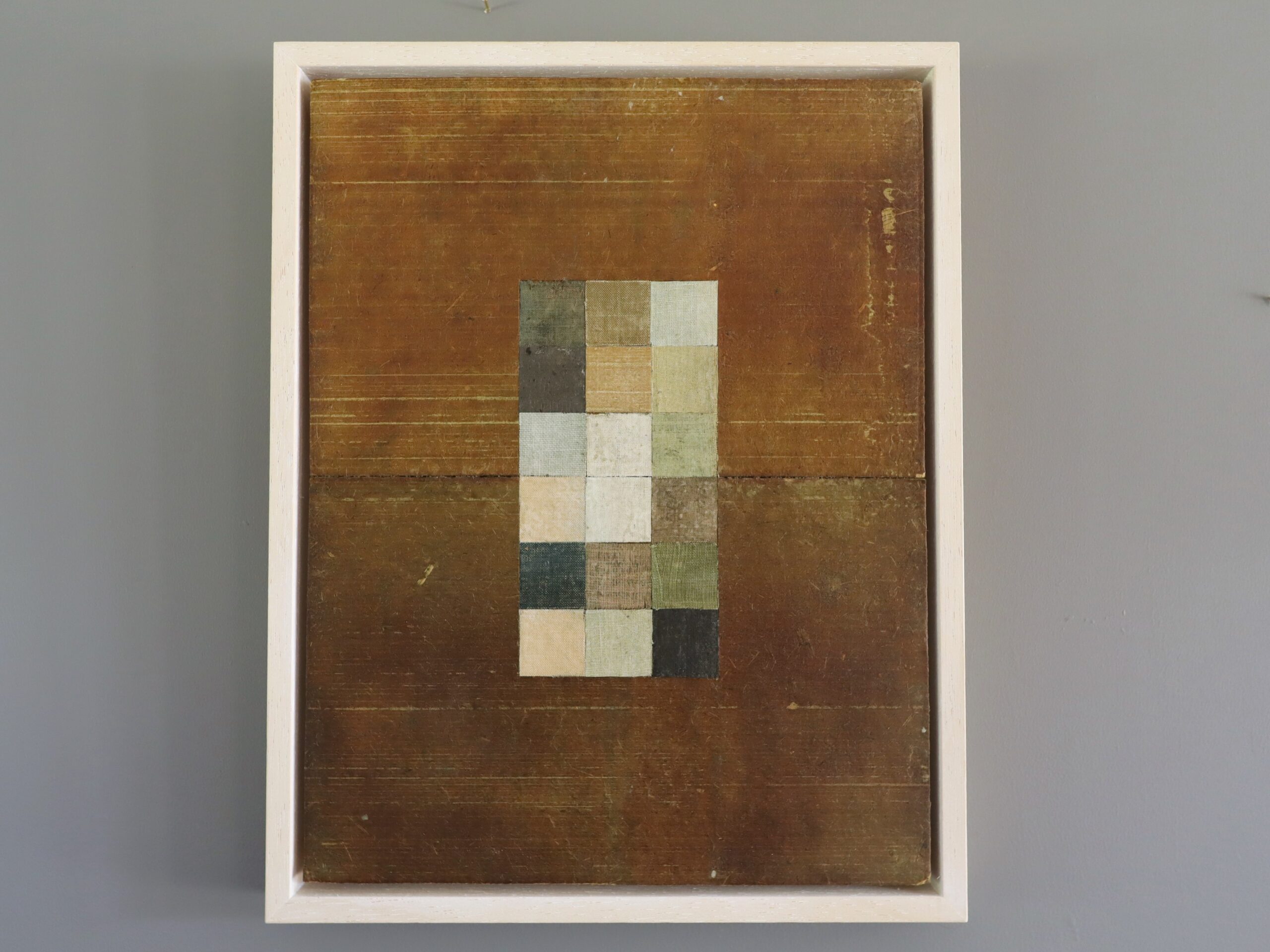 Centrally placed is a vertical arrangement of nine small rectangles, each made from a different swatch of book cloth. These blocks vary in hue—soft blues, warm reds, ochres, deep burgundy, and neutral beige—and are carefully aligned to form a grid-like column. Their tight geometry contrasts with the organic wear of the background, creating visual tension and balance.