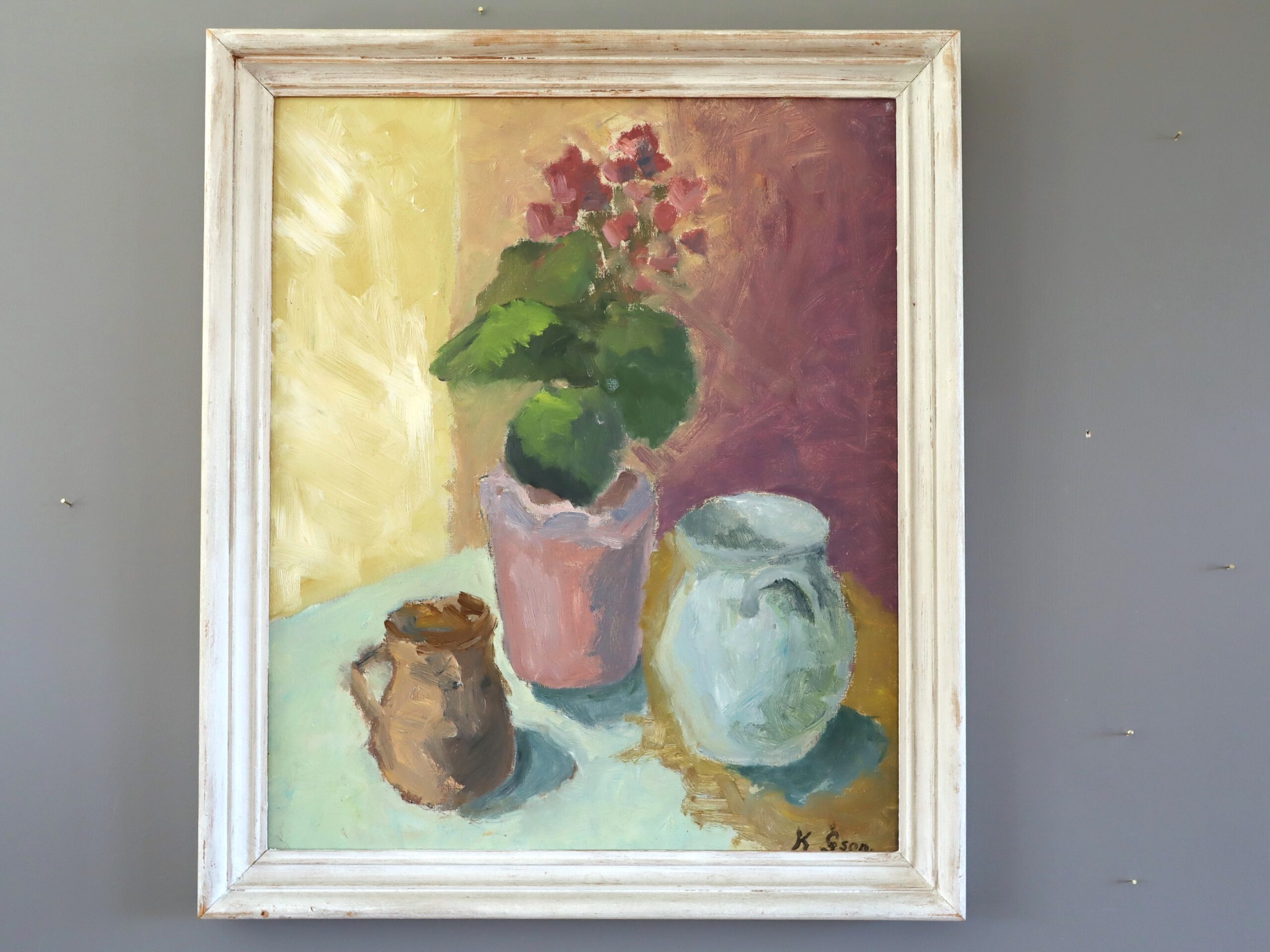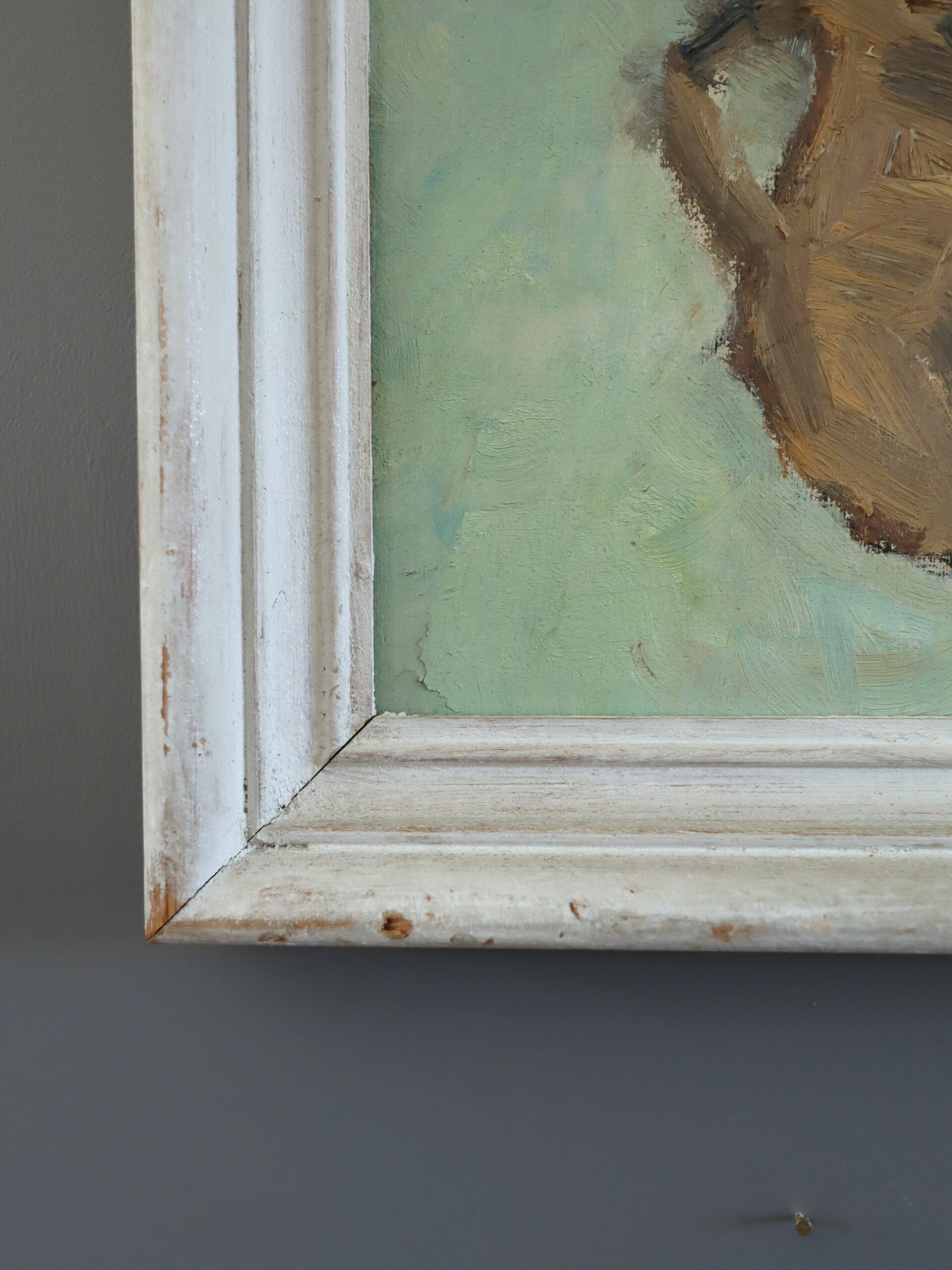 This oil on board is housed in a complementary white-painted distressed style wood frame. The painting is in excellent vintage condition, and the frame has a small nick at its left corner but is in very good condition overall.