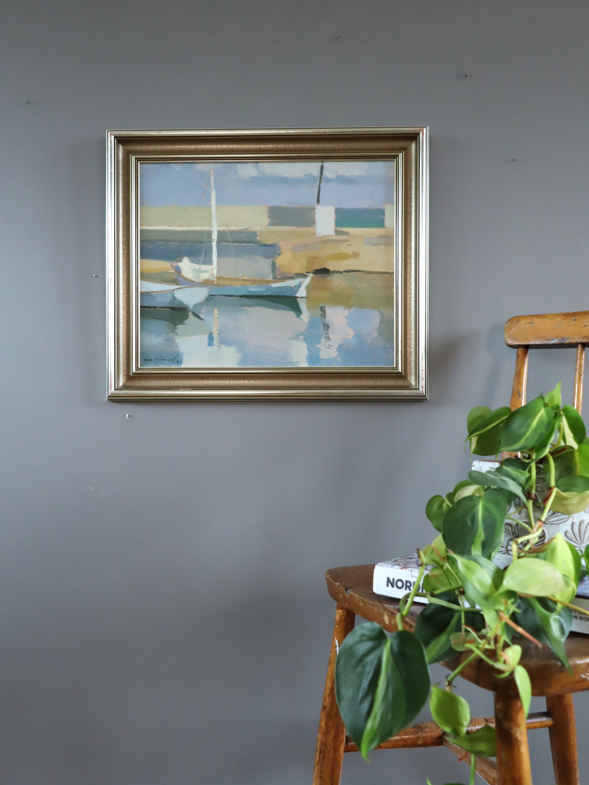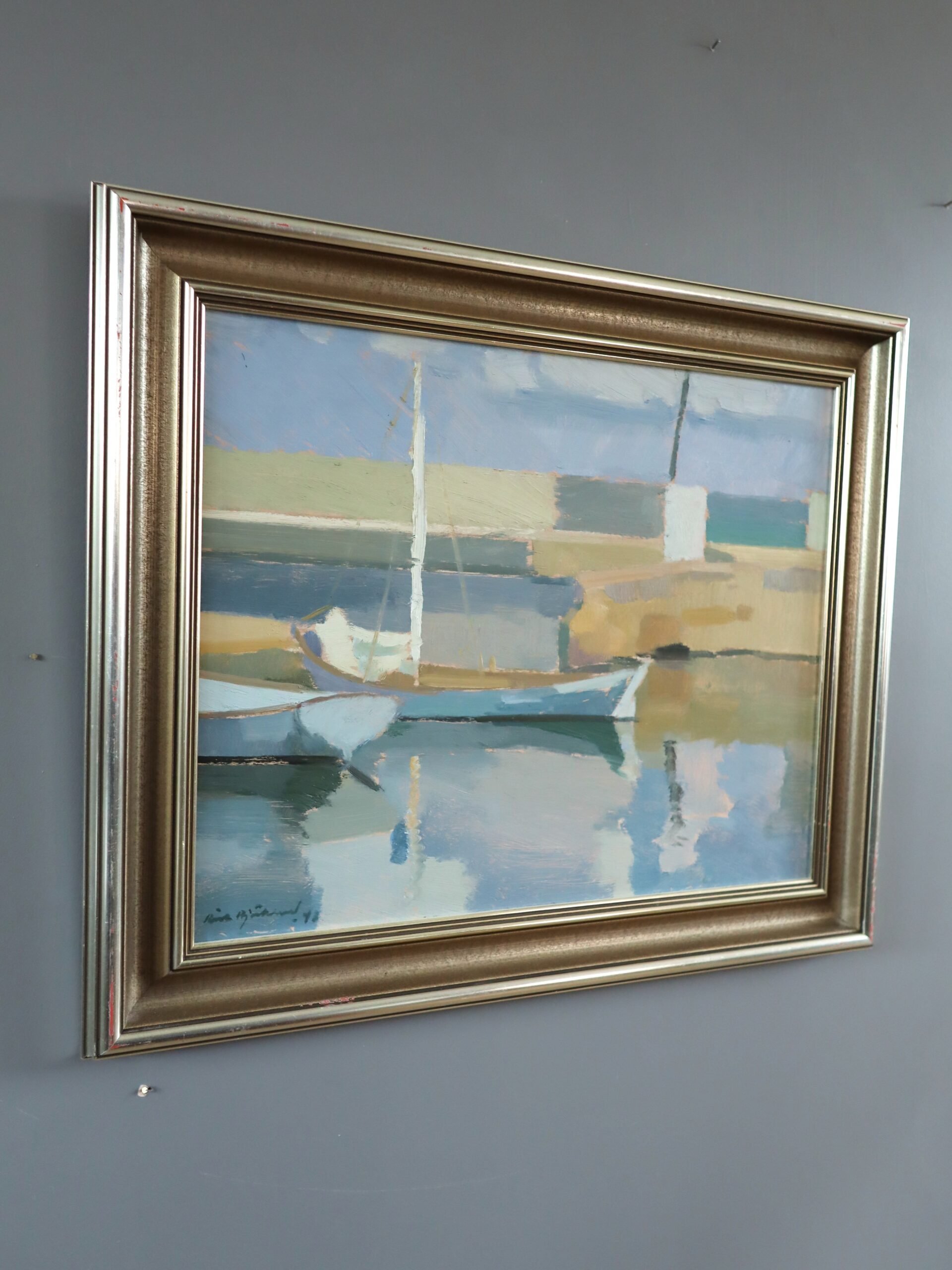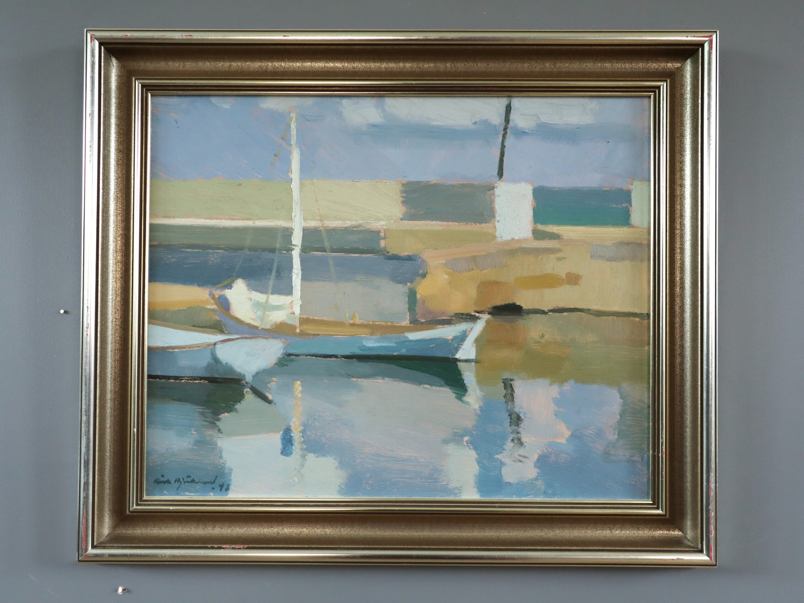 A serene mid-century painting that captures a quiet harbour scene where two small sailboats rest gently on calm, reflective waters, painted in oil onto board in 1942 by the established Swedish artist Richard Björklund (1897–1974), whose works have been exhibited in public collections including the National Museum in Stockholm, Moderna Museet in Stockholm, Malmo Museum, Ystads Art Museum, and others.