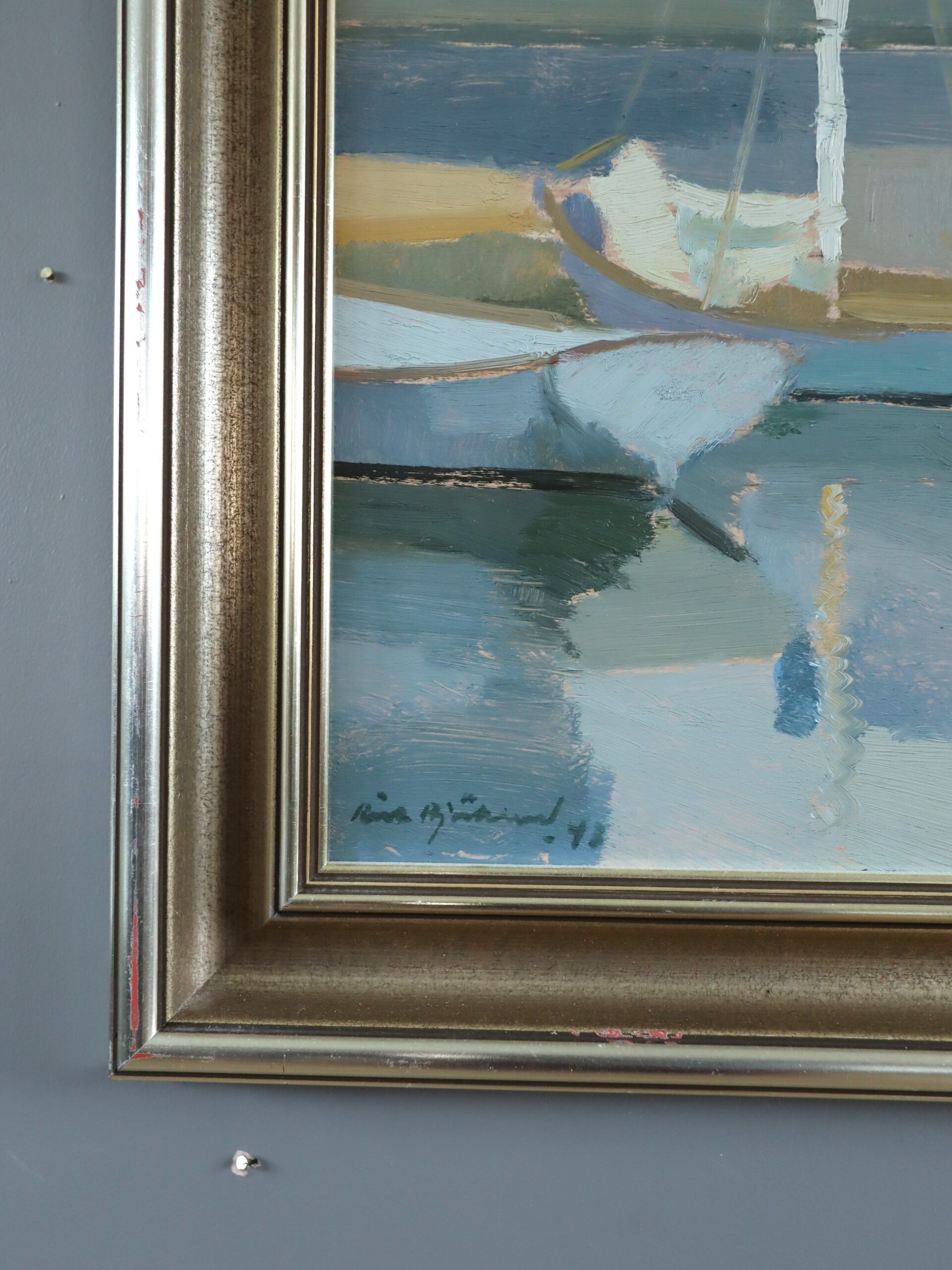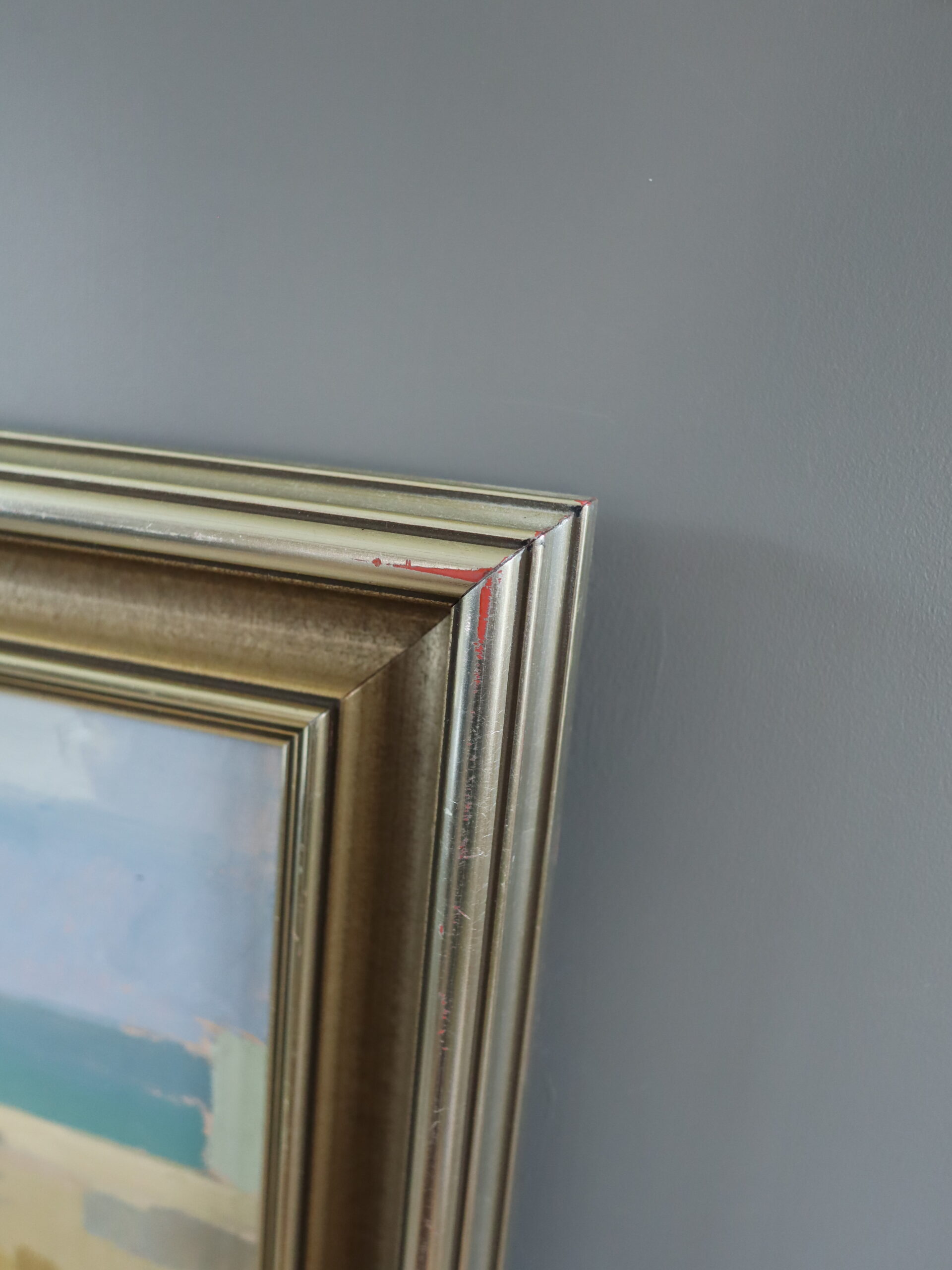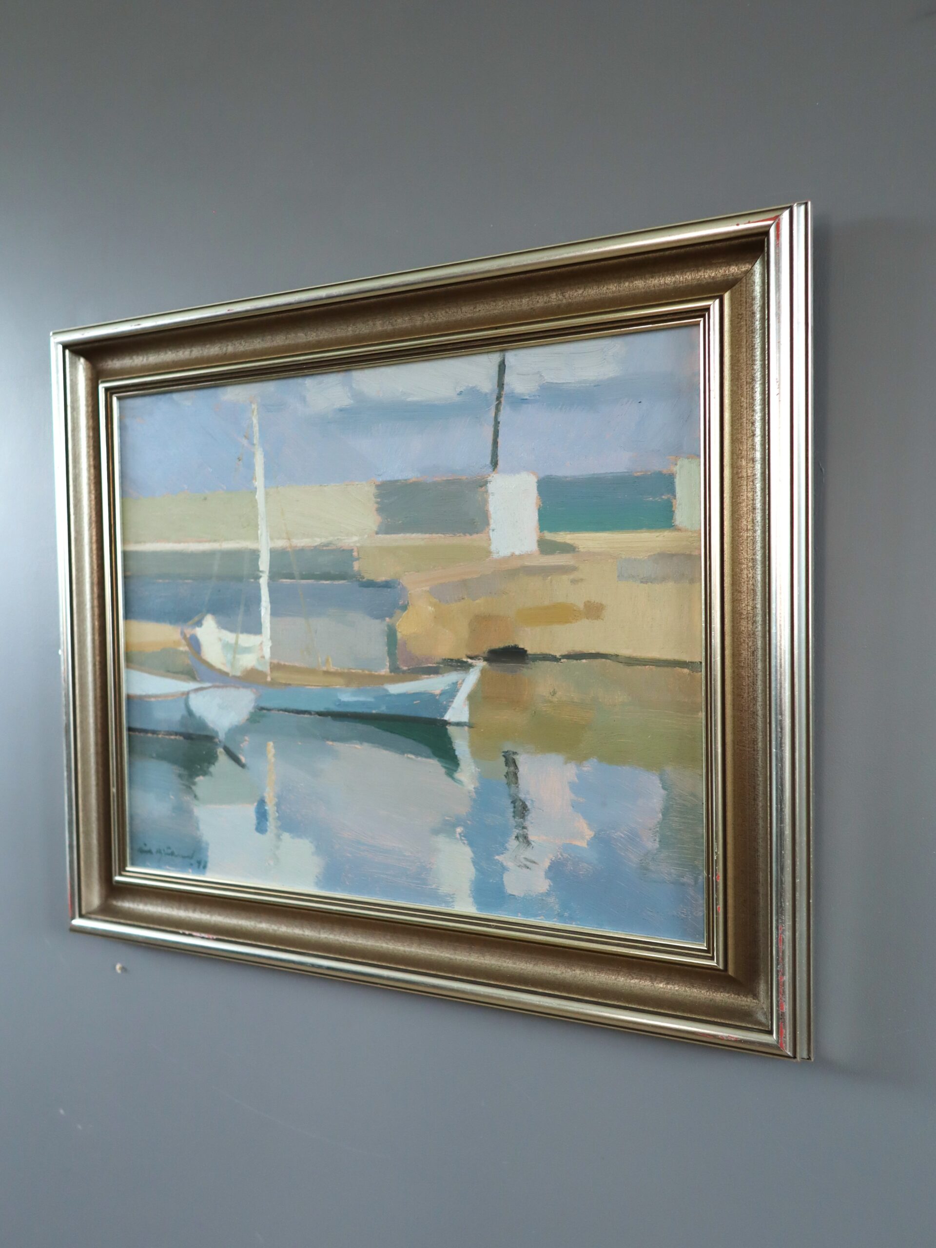This oil on board is presented in an elegant wood frame with a warm, brushed gold and silver finish, and a gently stepped profile with subtle ridging. Both the painting and frame are in excellent vintage condition.