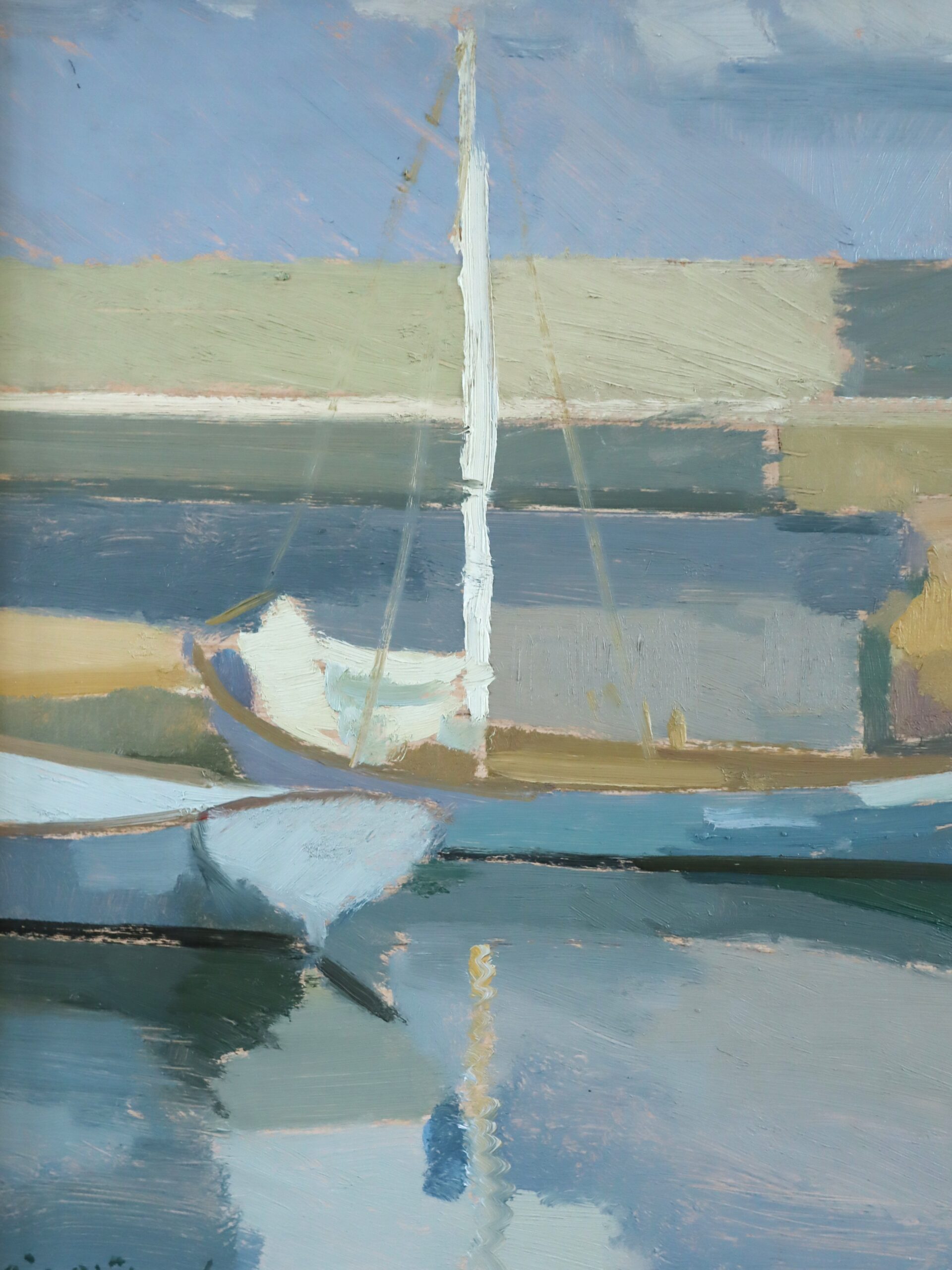 The composition is pared back and contemplative: boats sit low in the foreground, their slender masts rising vertically and echoed in the soft, rippling reflections below. Beyond them, a simplified shoreline unfolds in horizontal bands, punctuated by a small white structure and subtle architectural hints, evoking a sunlit coastal setting at rest.