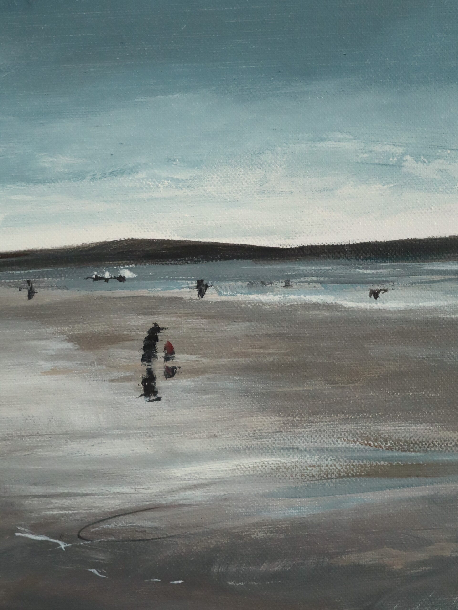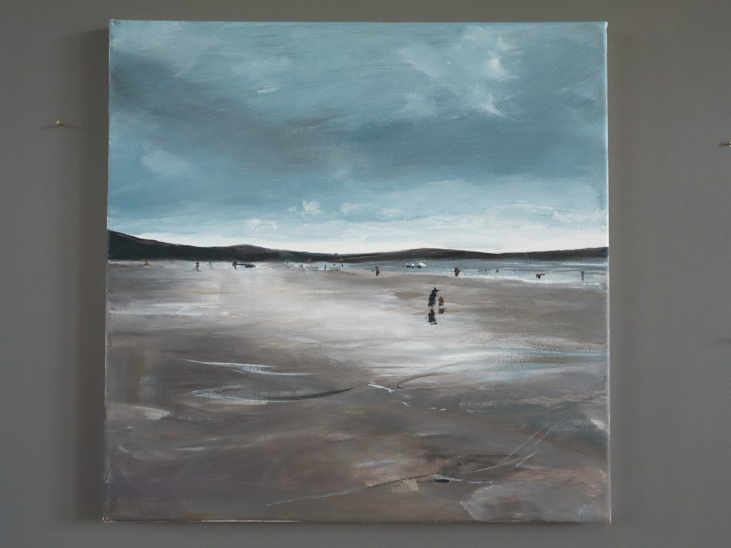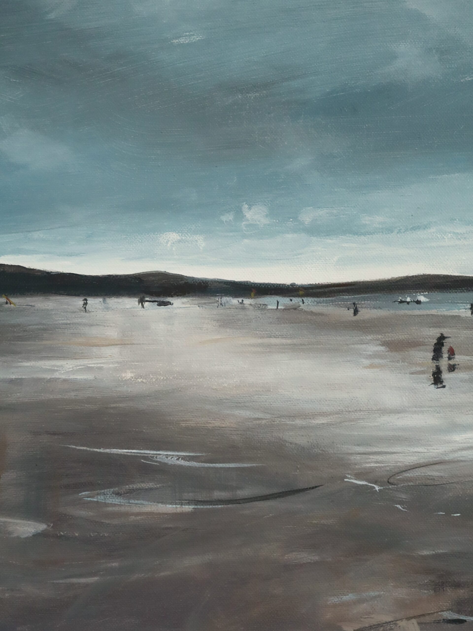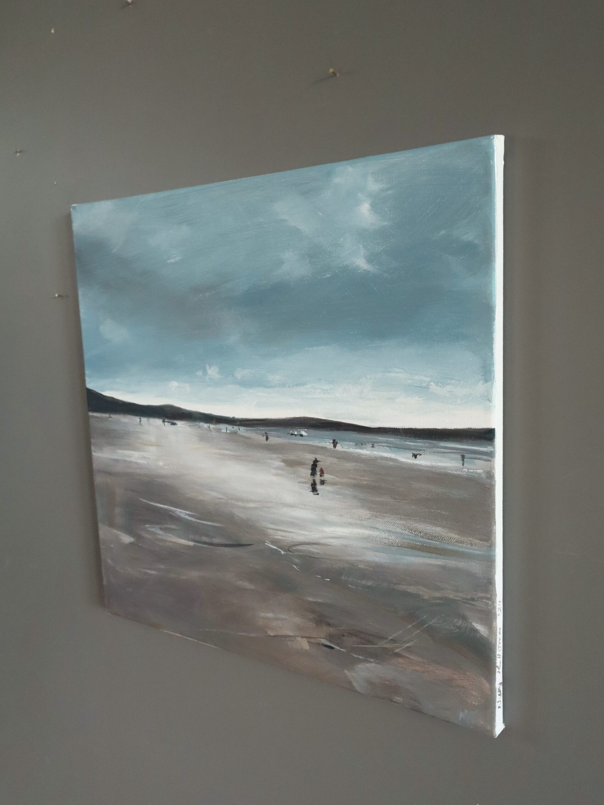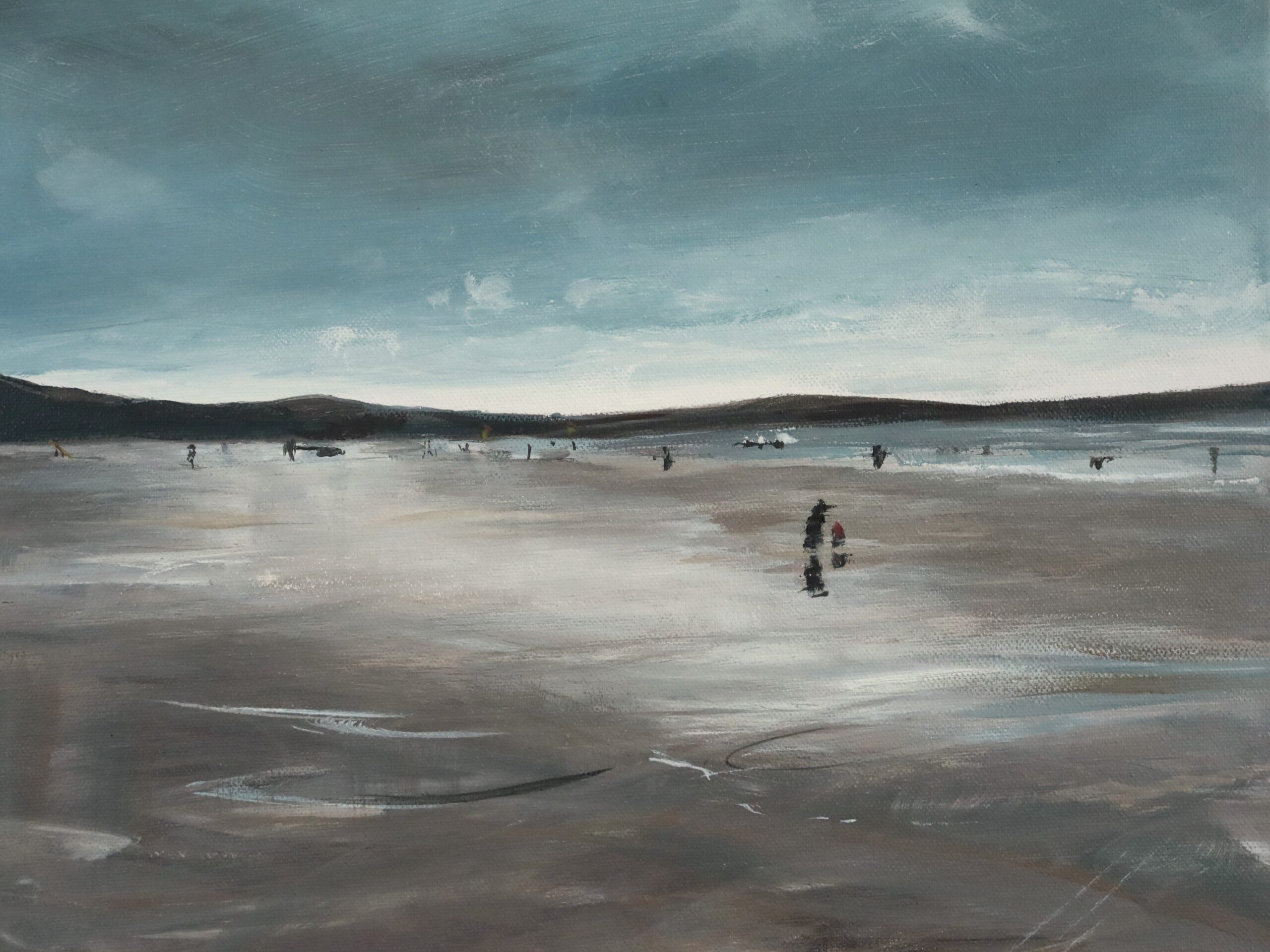 Scattered across the wet sand are small, loosely rendered figures, their reflections faintly mirrored on the glistening surface. The central figure draws the viewer’s eye and lends a quiet narrative to the scene. The broad, gentle brushstrokes and subdued palette evoke a fleeting, introspective mood — capturing the stillness and solitude of a moment suspended in time.
