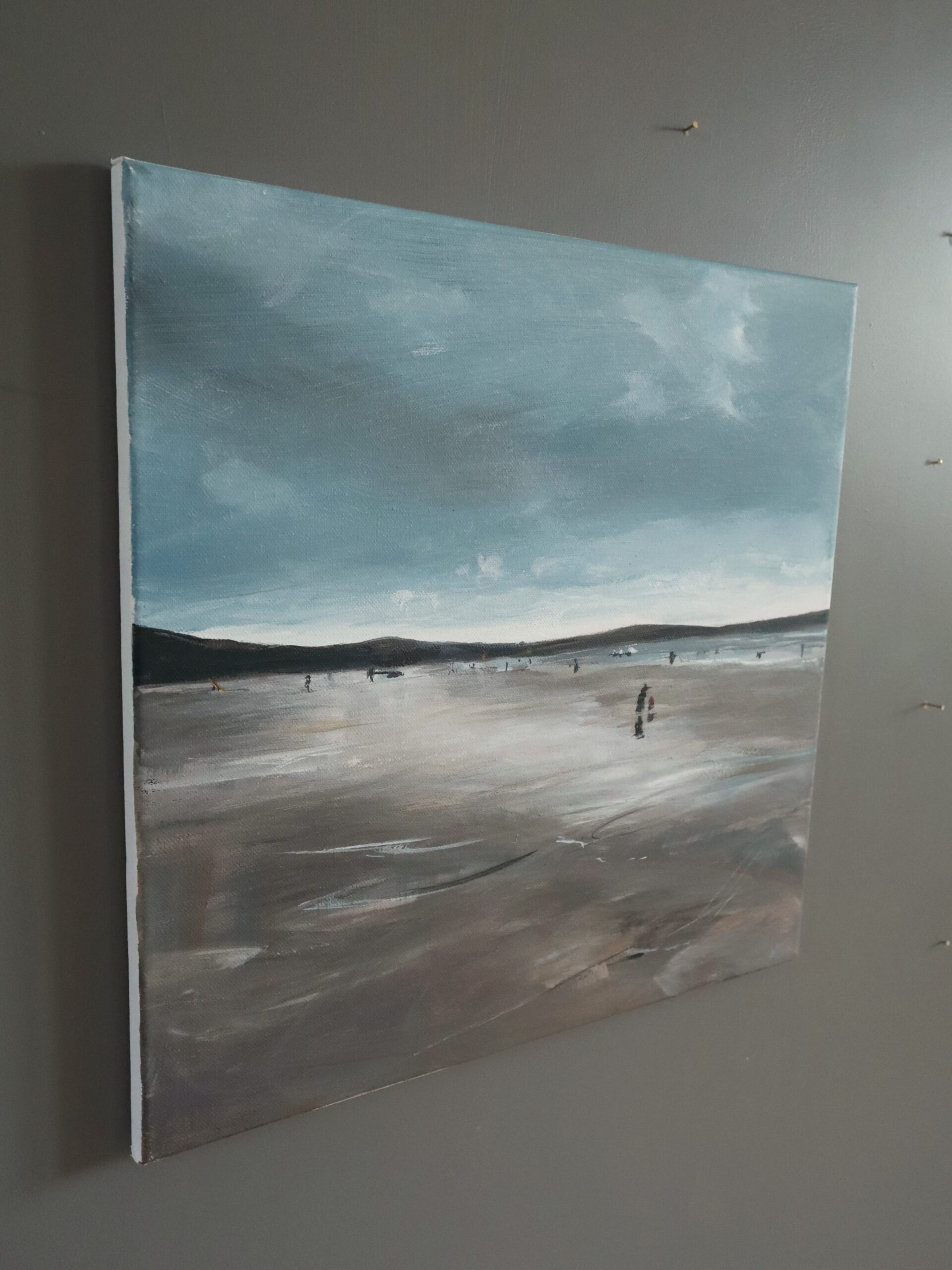 This painting portrays a vast, windswept beach under a dramatic, cloud-streaked sky. The horizon is low and dark, with rolling hills framing the edge of the sea, while the expansive sky dominates the upper half of the canvas in shifting tones of blue and grey.
