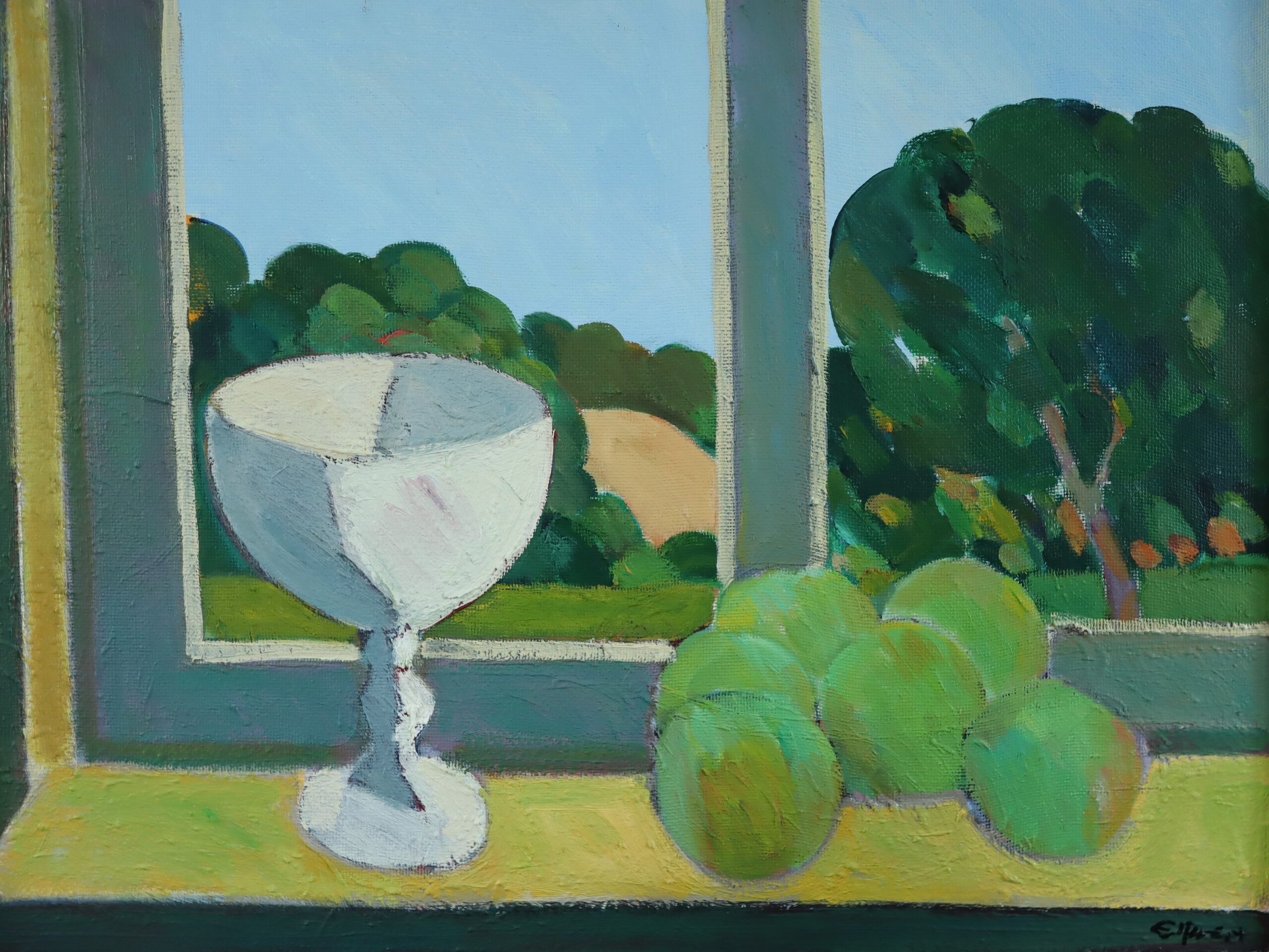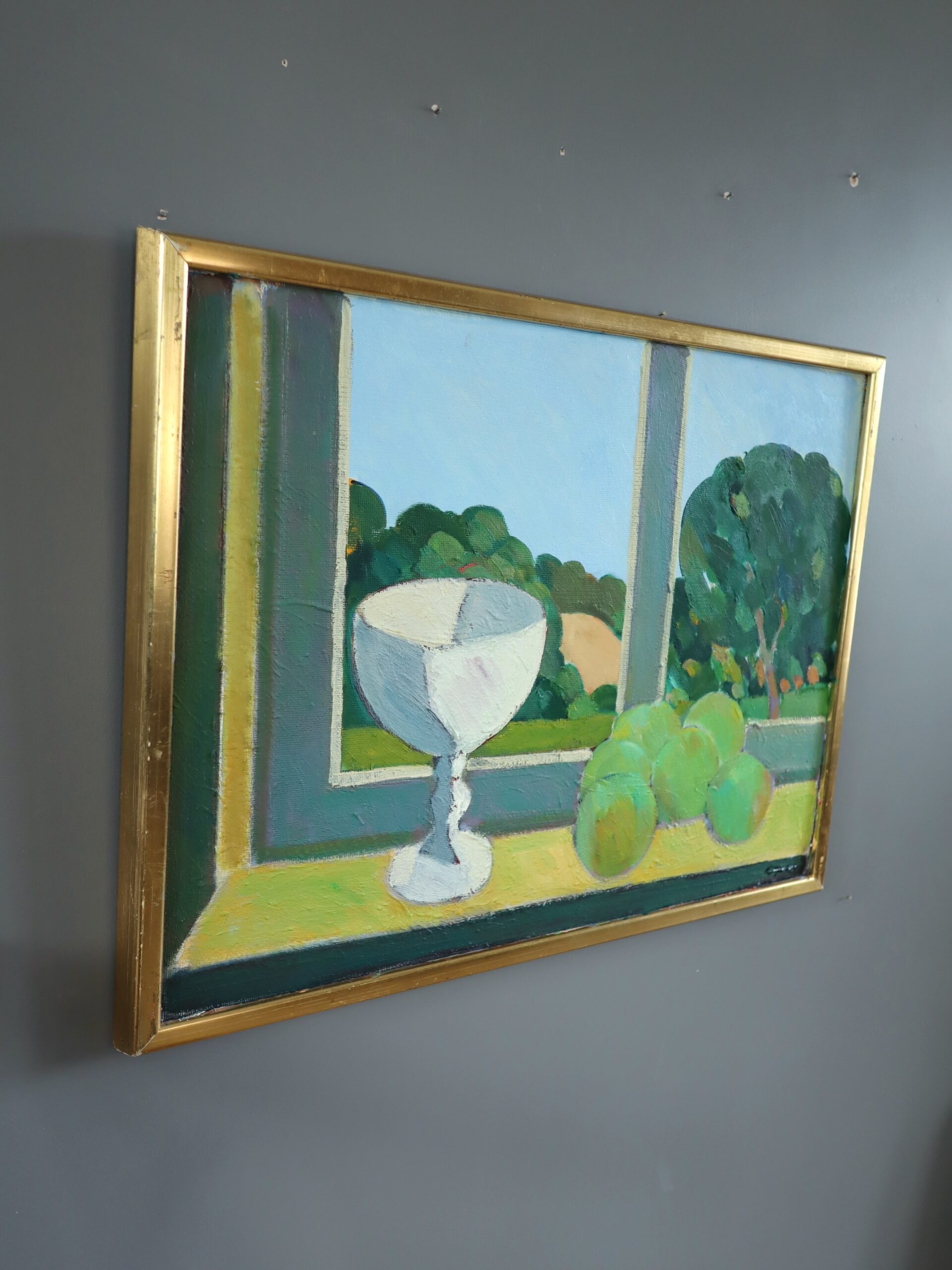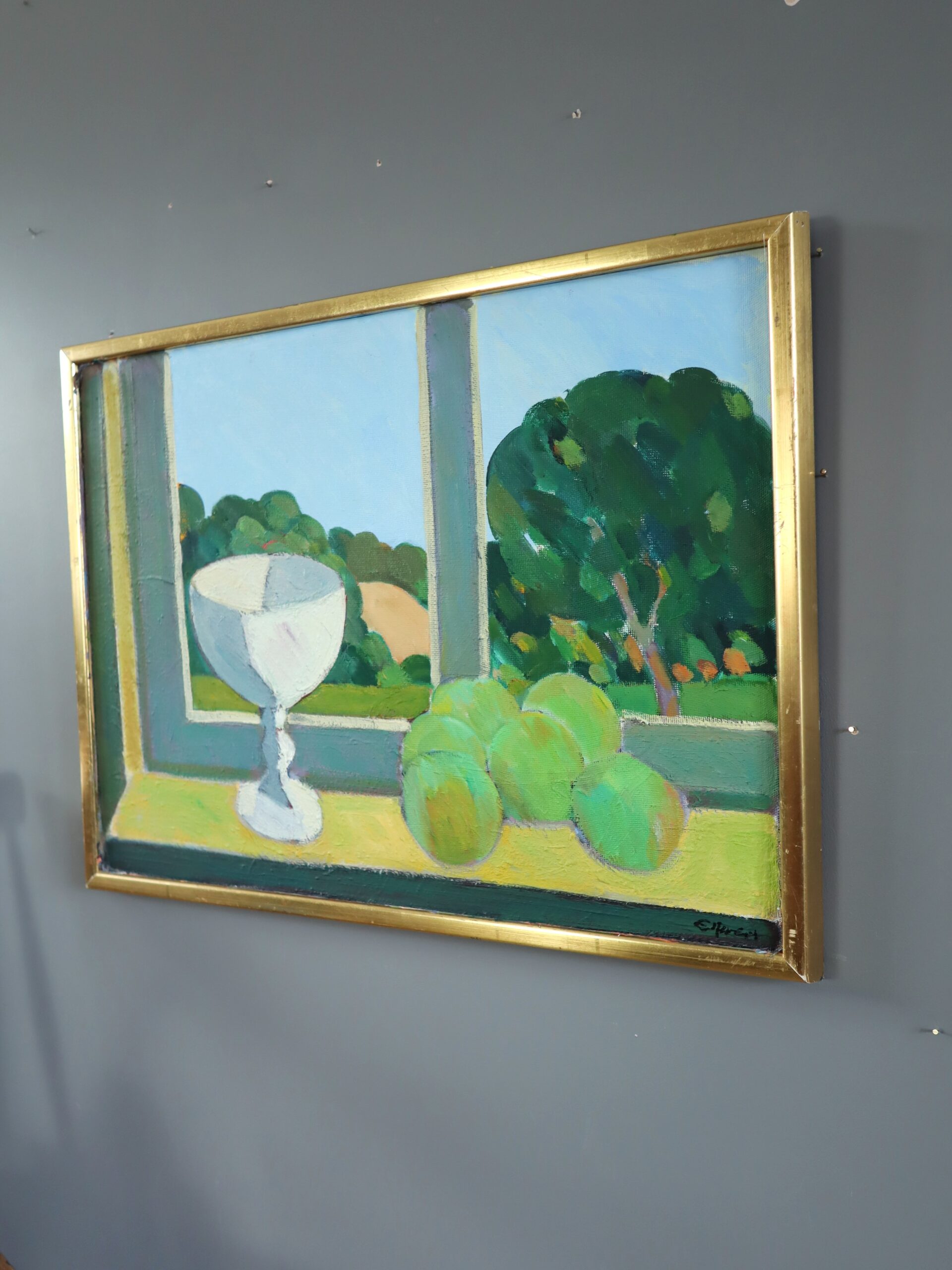 A vibrant mid-century modernist still life oil painting that captures a calm interior moment with a strong sense of geometry and structure, by Swedish artist Eric Elfvén (1921–2008), whose works have been exhibited in public collections including the Moderna Museet in Stockholm, Jönköping Museum, Borås Art Museum, and the Victoria and Albert Museum in London.