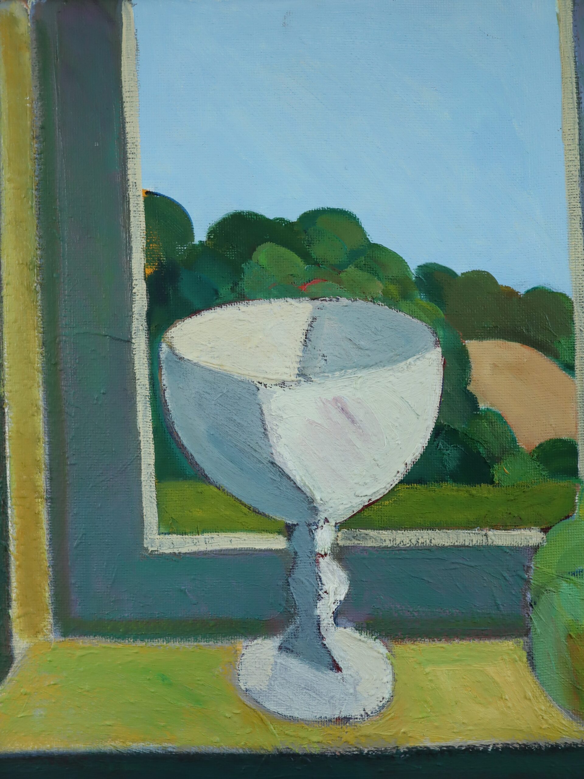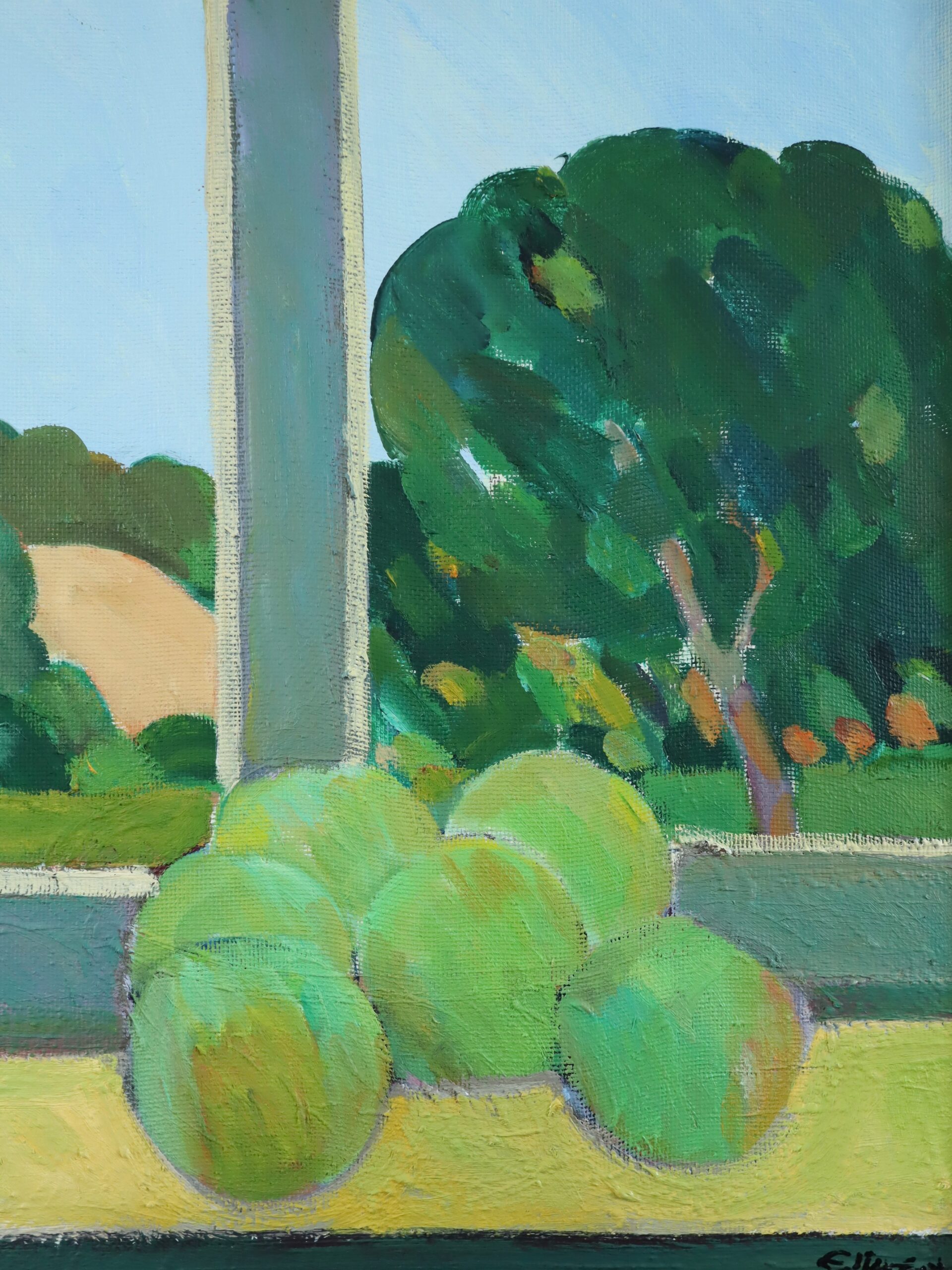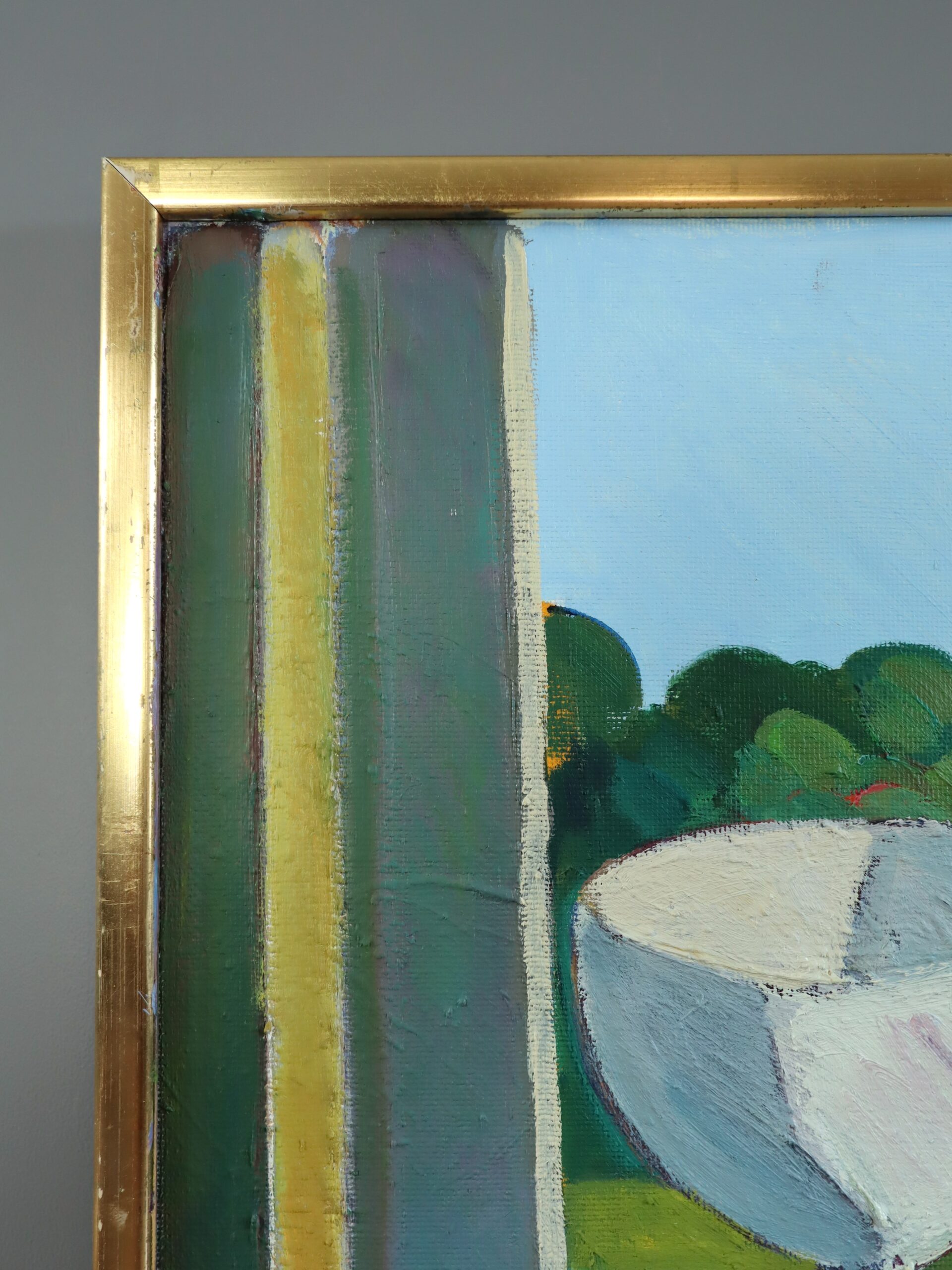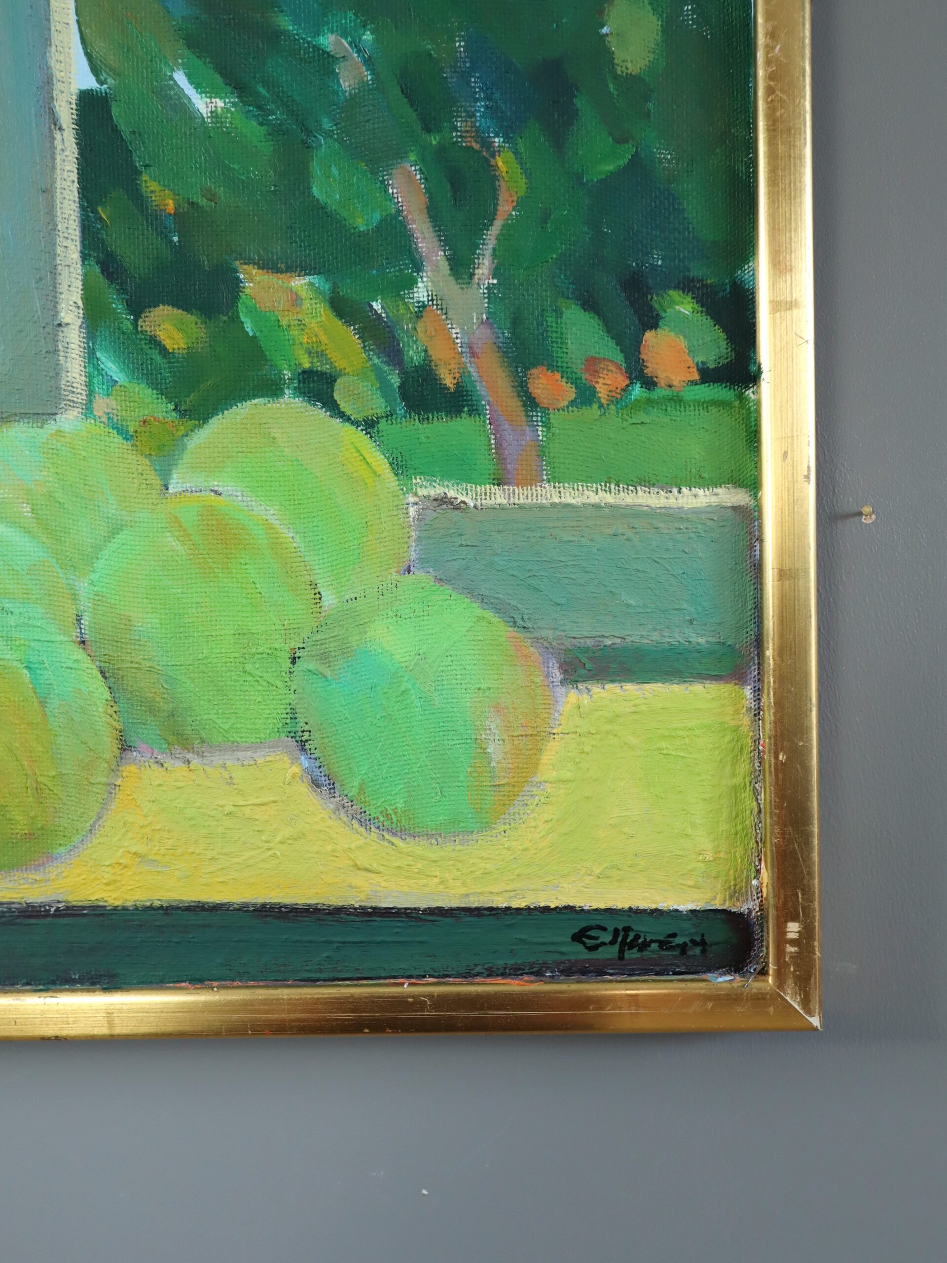 A vibrant mid-century modernist still life oil painting that captures a calm interior moment with a strong sense of geometry and structure, by Swedish artist Eric Elfvén (1921–2008), whose works have been exhibited in public collections including the Moderna Museet in Stockholm, Jönköping Museum, Borås Art Museum, and the Victoria and Albert Museum in London.
