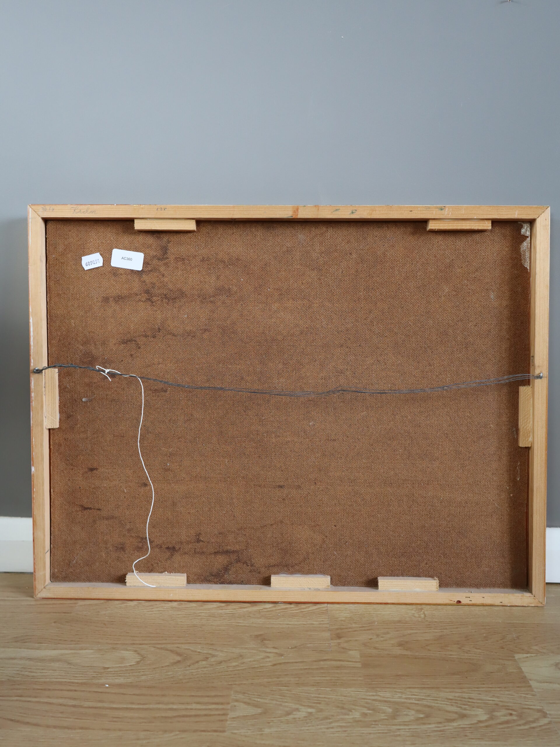 This oil on board is housed in a complementary gilt frame. The painting is in excellent vintage condition, and the frame has some scuffs and marks present.Â