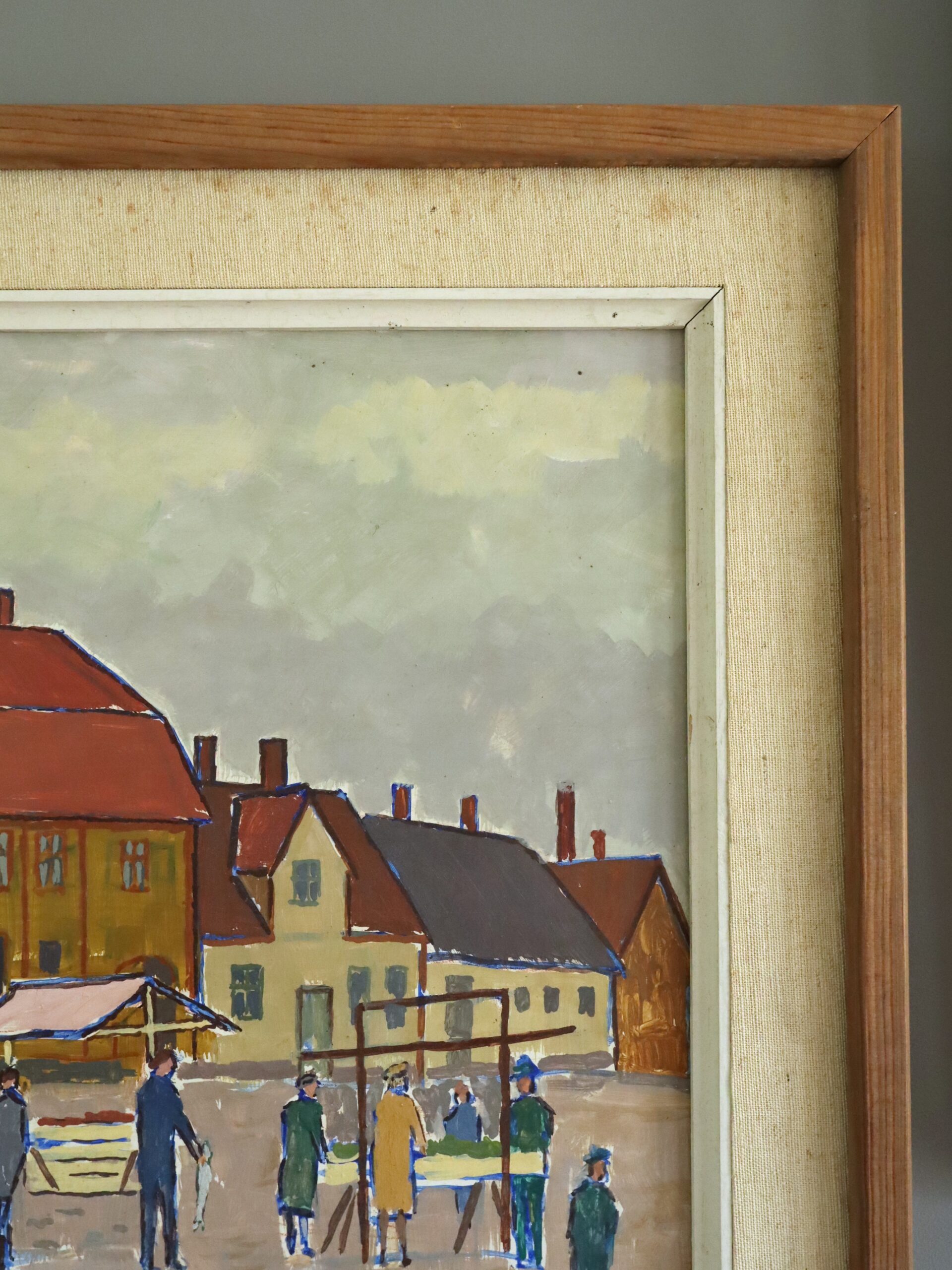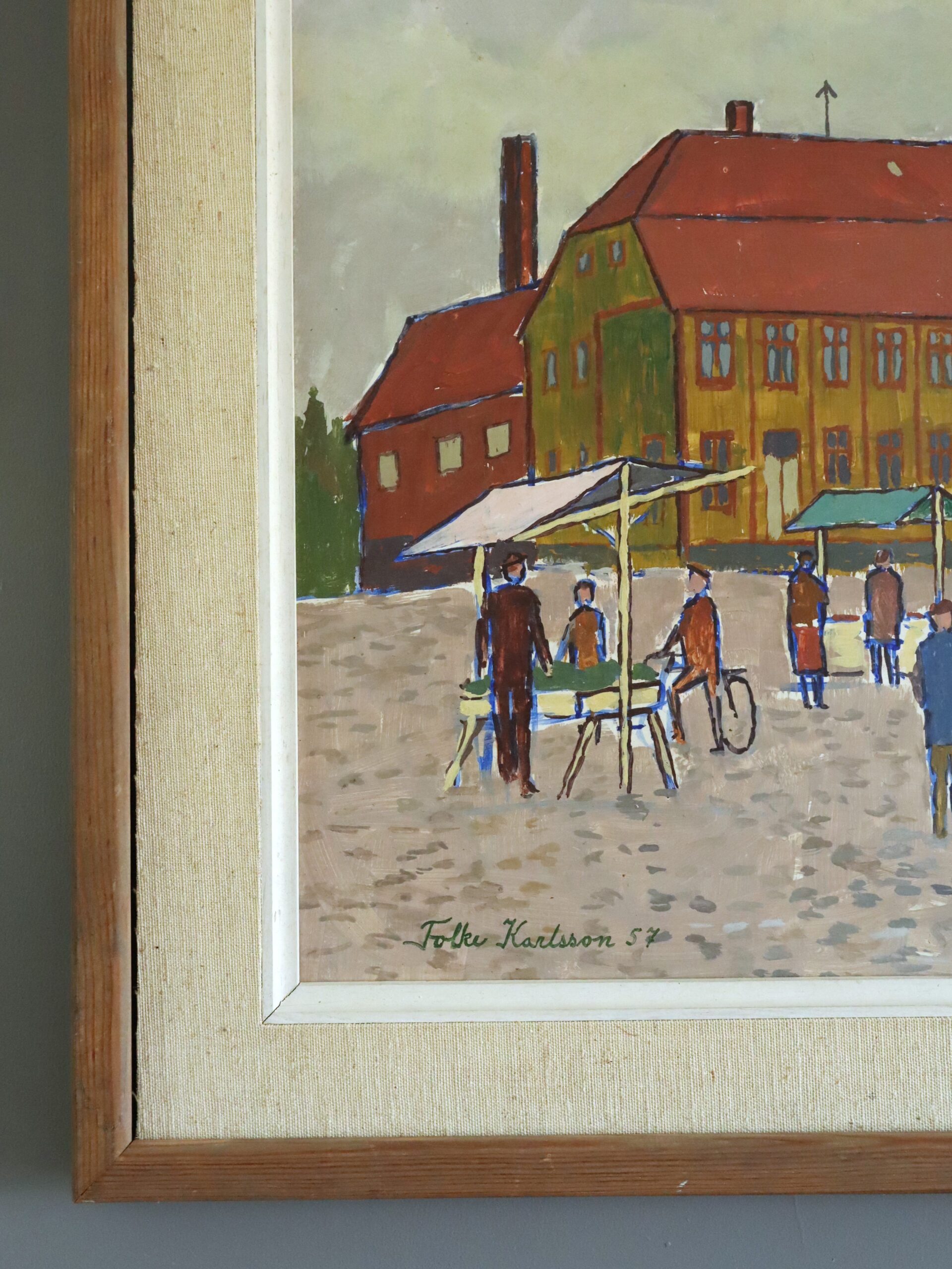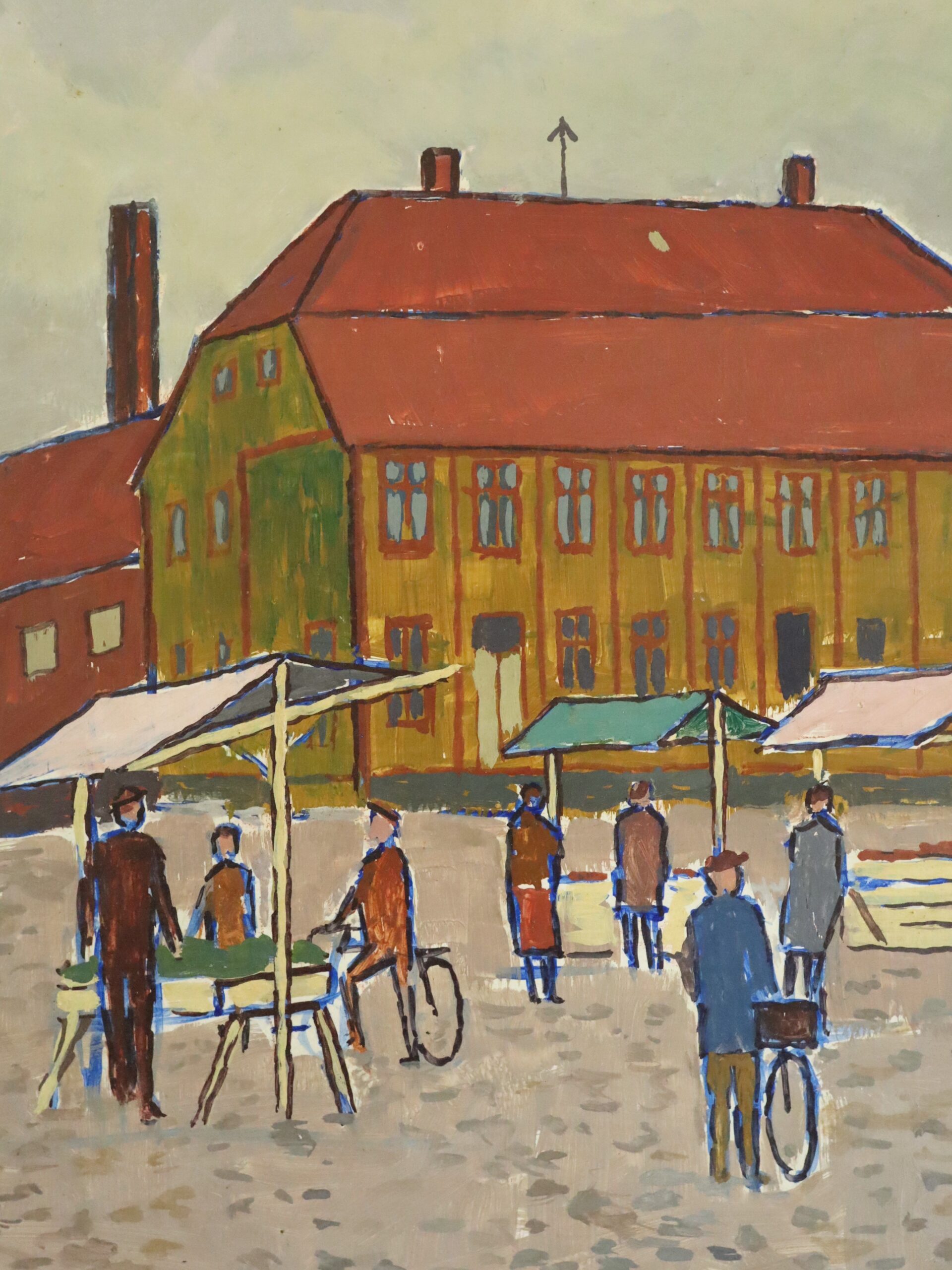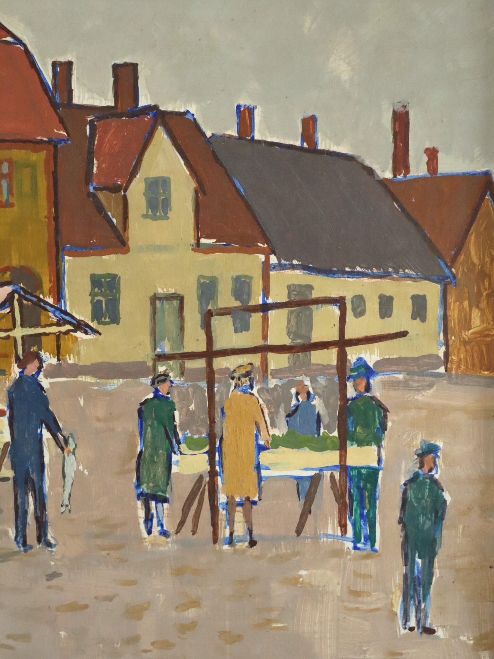 A charming mid-century Naïve style street scene that captures the rhythm and warmth of a local European town square on market day, executed in oil onto board and dated 1957.