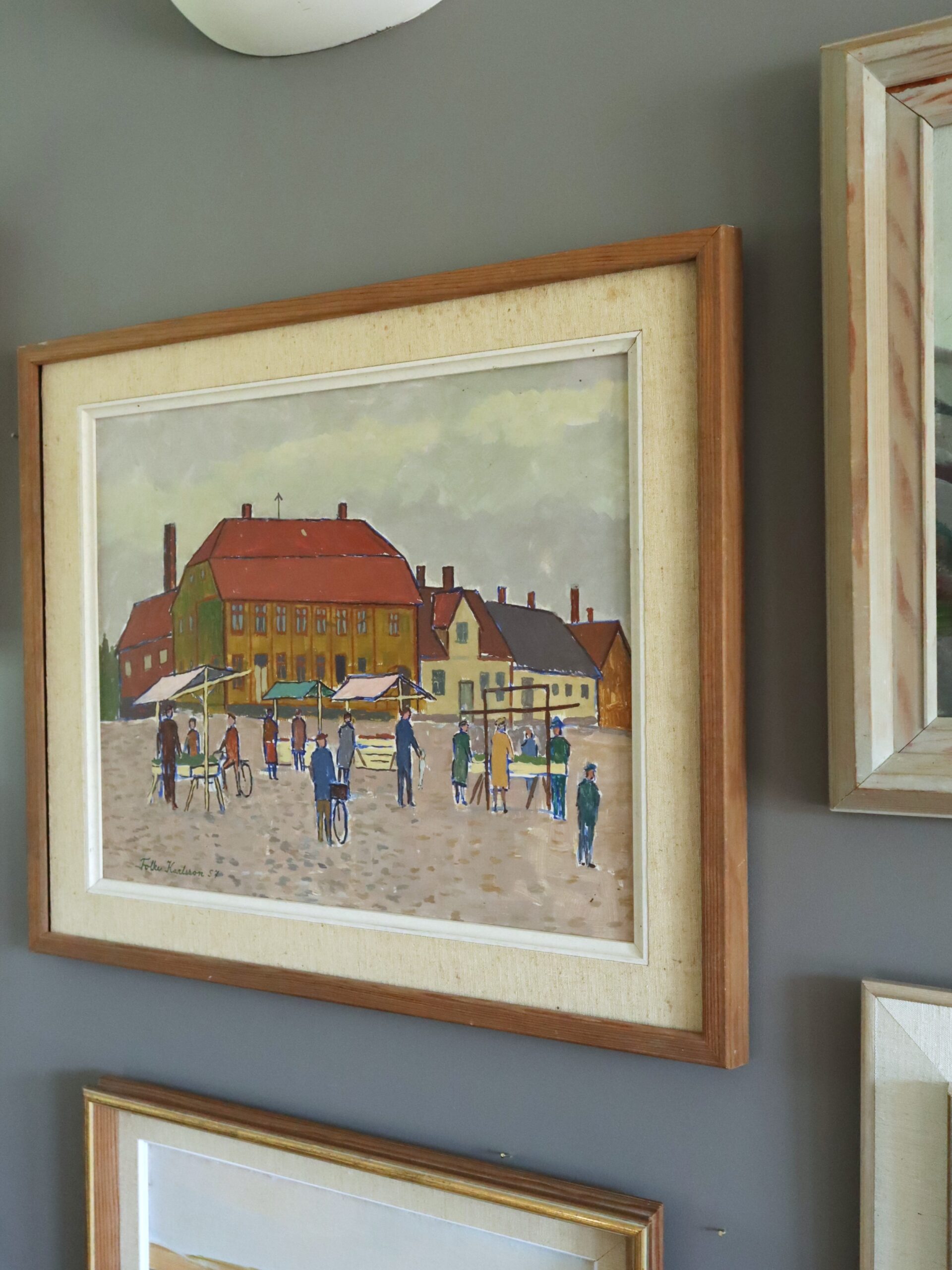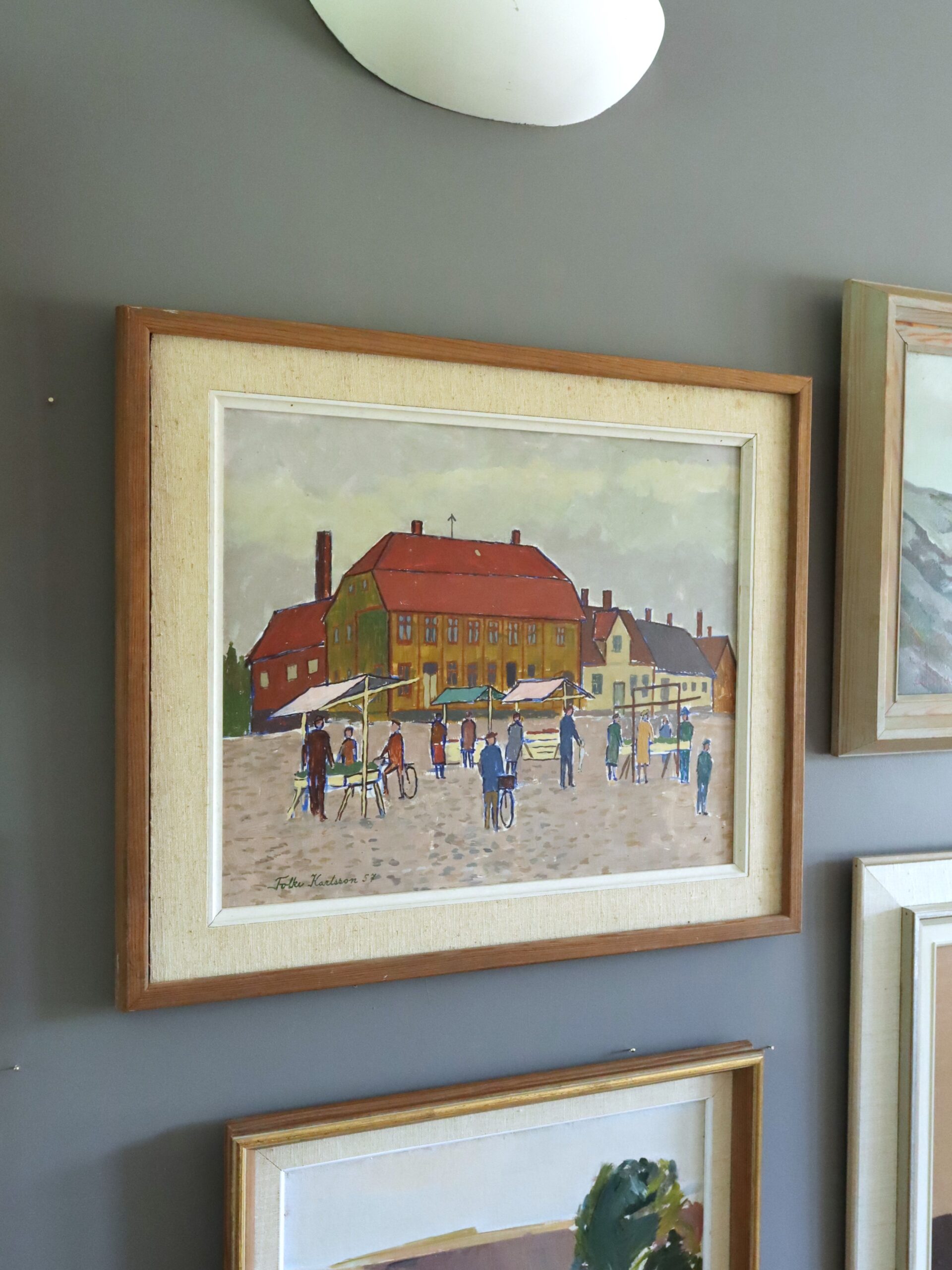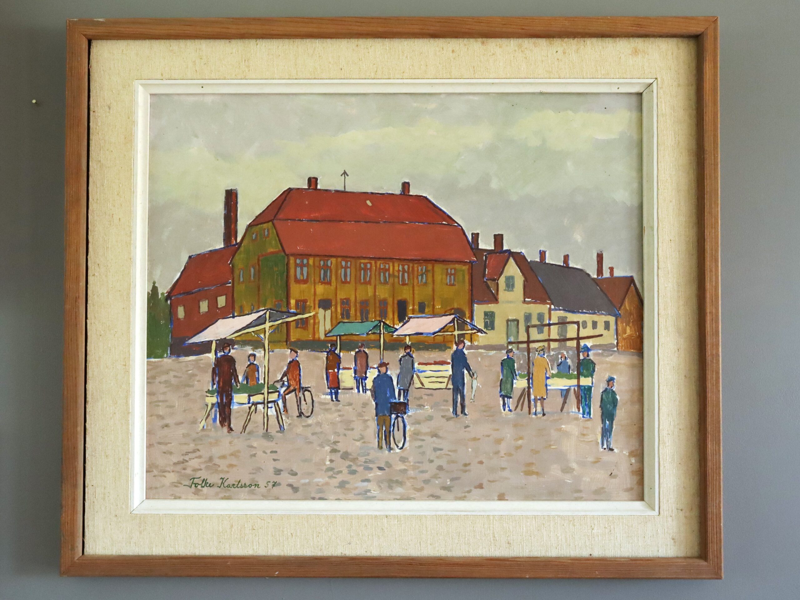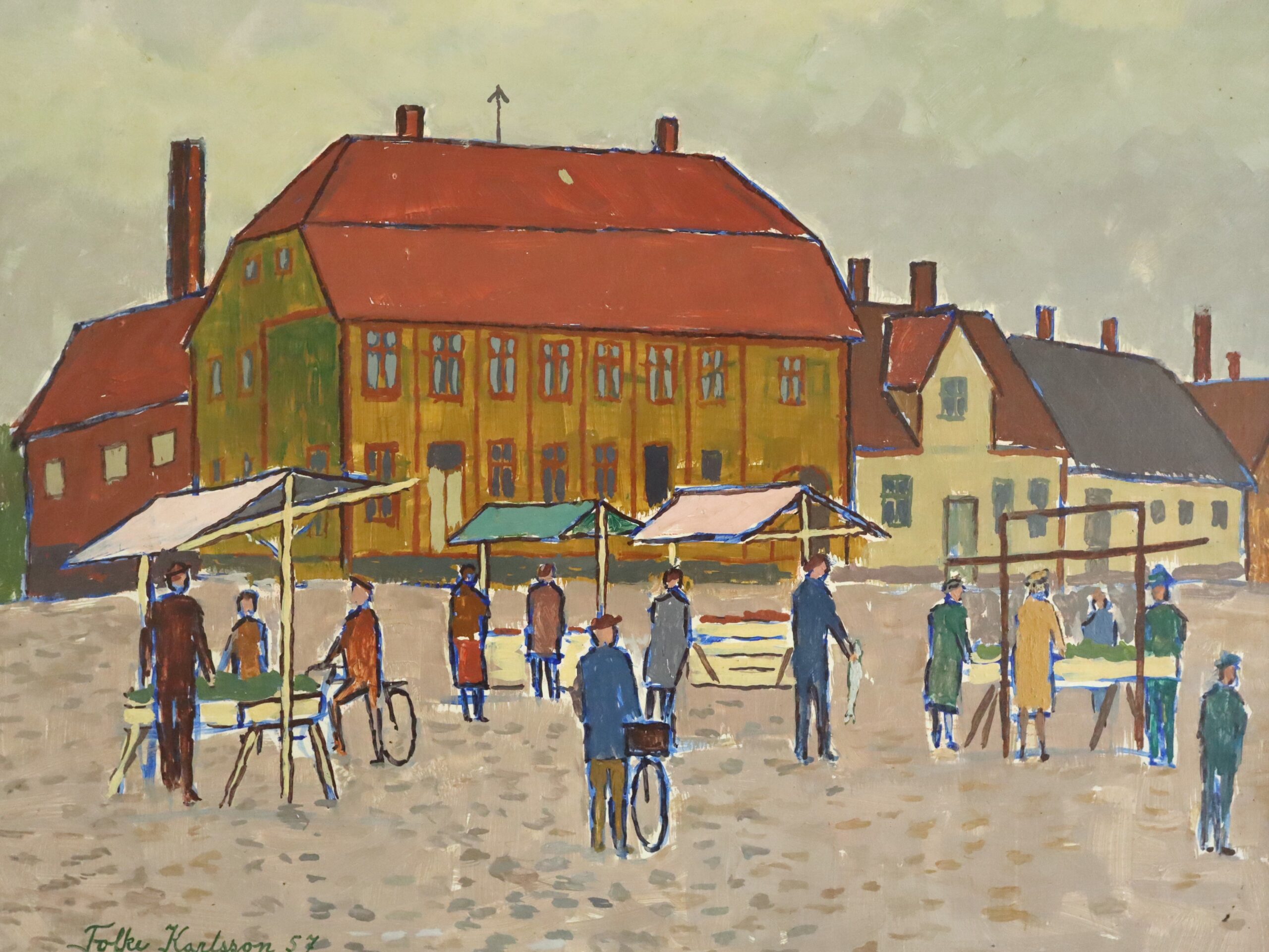 A charming mid-century Naïve style street scene that captures the rhythm and warmth of a local European town square on market day, executed in oil onto board and dated 1957.
