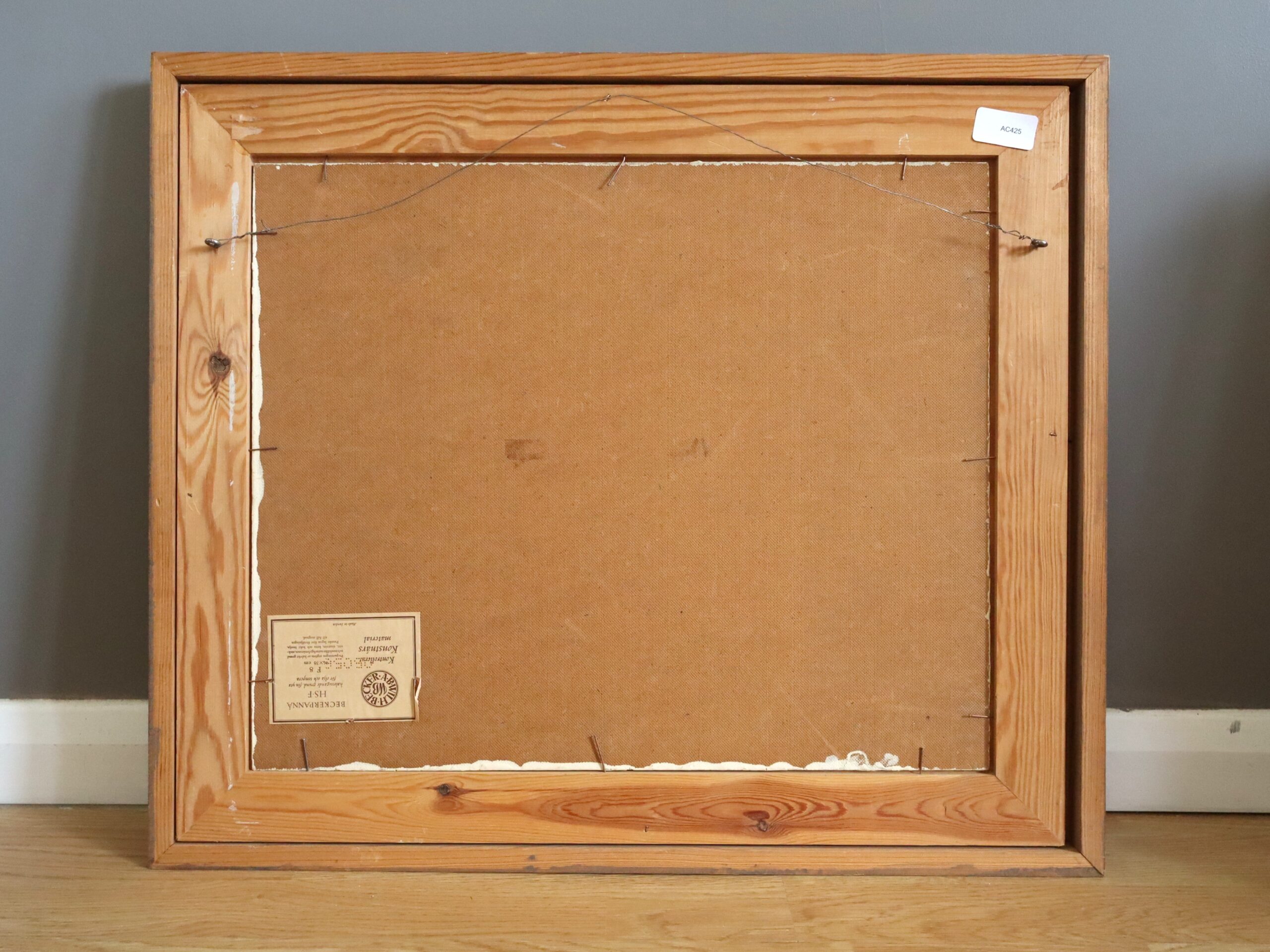 This oil on board is housed in a complementary wood frame with an inner linen border. The painting is in excellent vintage condition. The frame has minor scuffs.