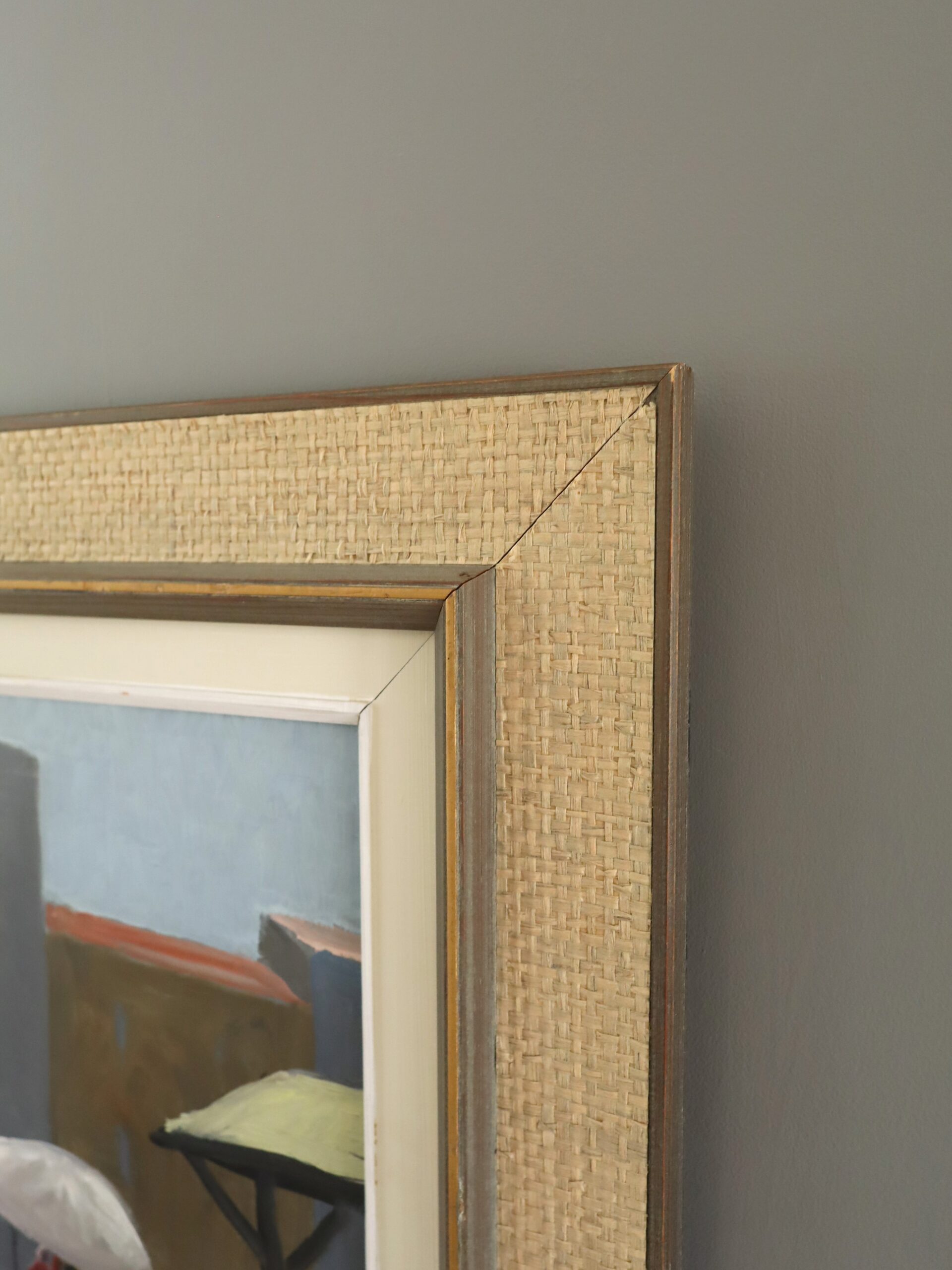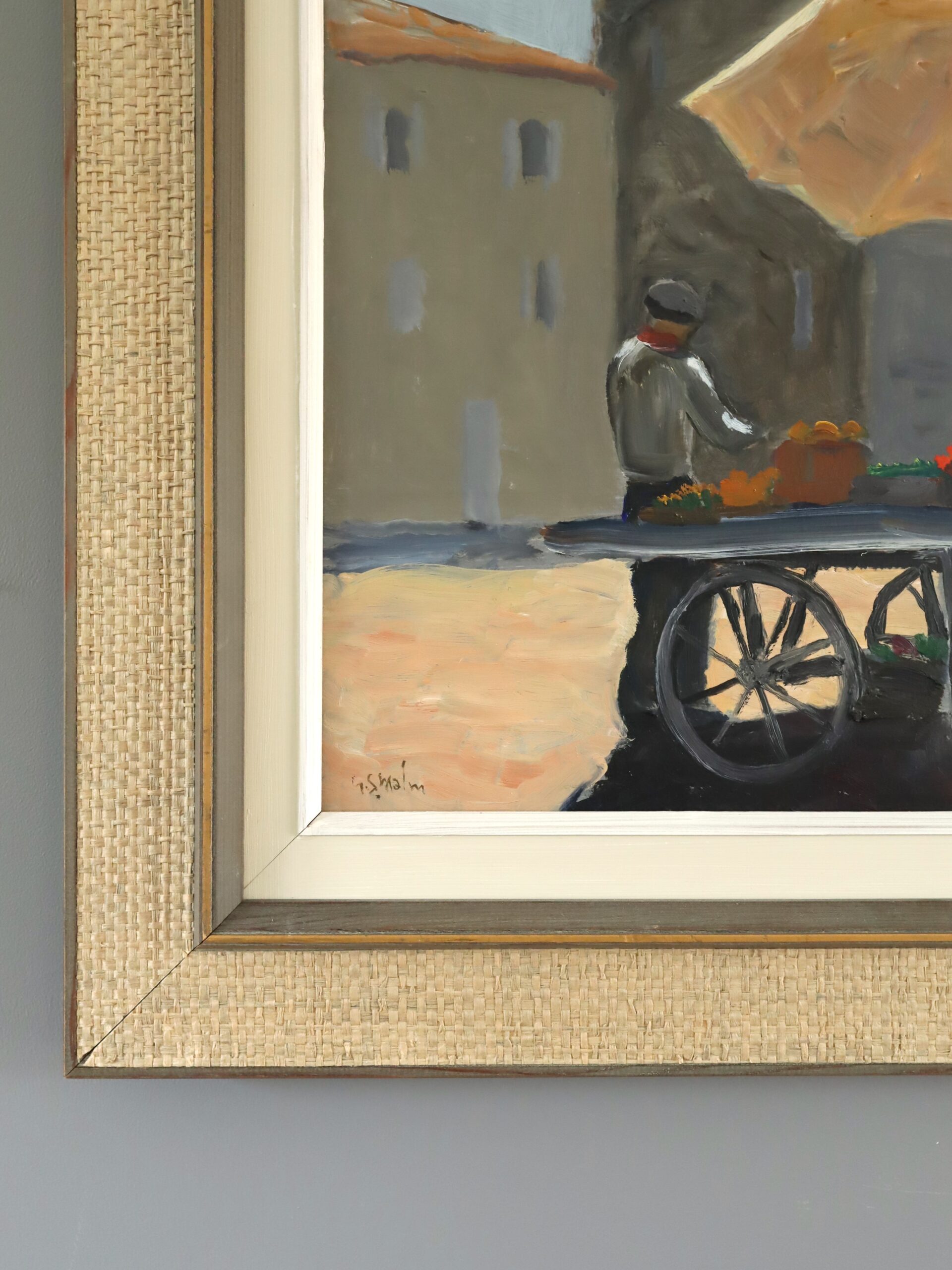 The artist has used a modernist sensibility, with strong compositional contrasts between light and shadow. Sunlight spills across the cobblestones, casting deep angular shadows, while the muted facades of surrounding buildings form a subdued backdrop, allowing the market activity to take centre stage. The palette is warm and harmonious – sandy orange, terracotta, soft greys, and earthy greens – with vibrant bursts of colour in the produce.