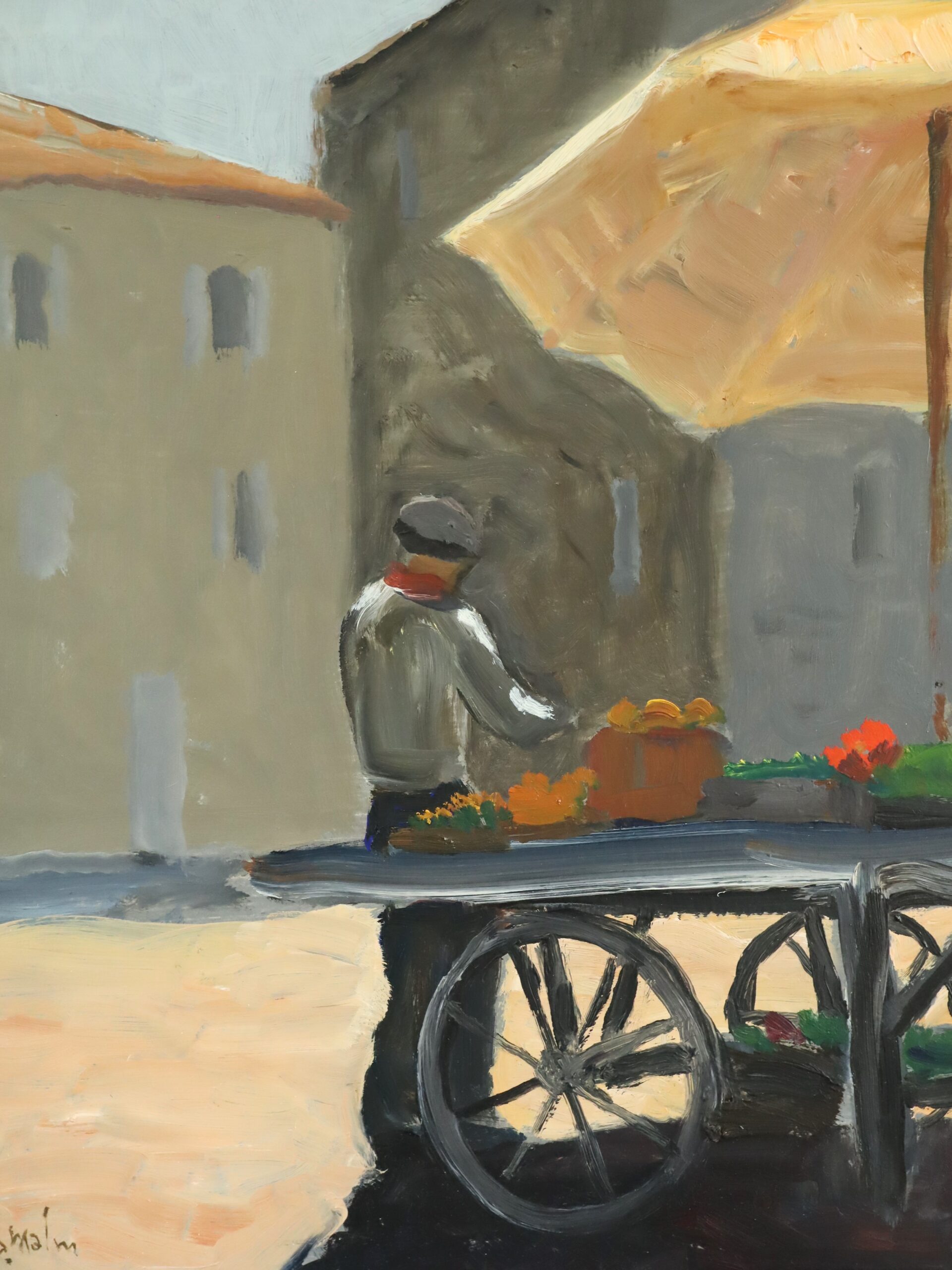 In the foreground, a vendor stands beside a rustic wooden cart laden with fresh produce, partially shaded by a large parasol. Additional market stalls, some green canopies, dot the square, their displays adding splashes of red, orange, and green to the scene. Figures move leisurely among the stalls, their forms simplified yet expressive, lending an almost timeless quality to the market’s atmosphere.