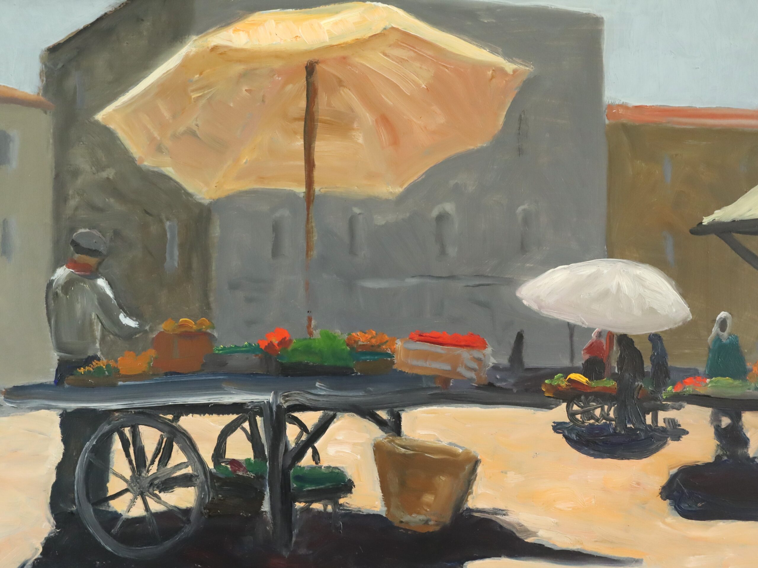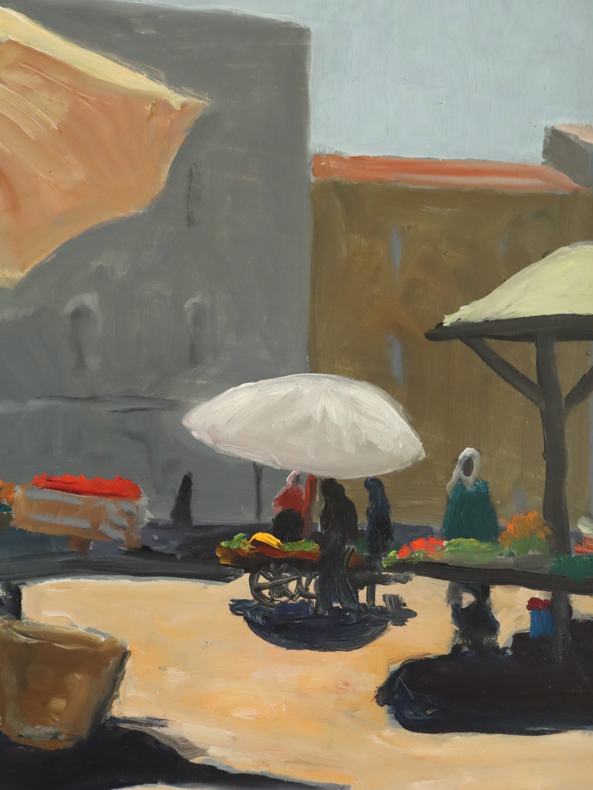 Brushstrokes are confident and broad, with areas of flat, blended colour offset by more textured, visible strokes in the umbrellas and produce. The treatment is painterly – focusing on shape, light, and atmosphere rather than fine detail.
