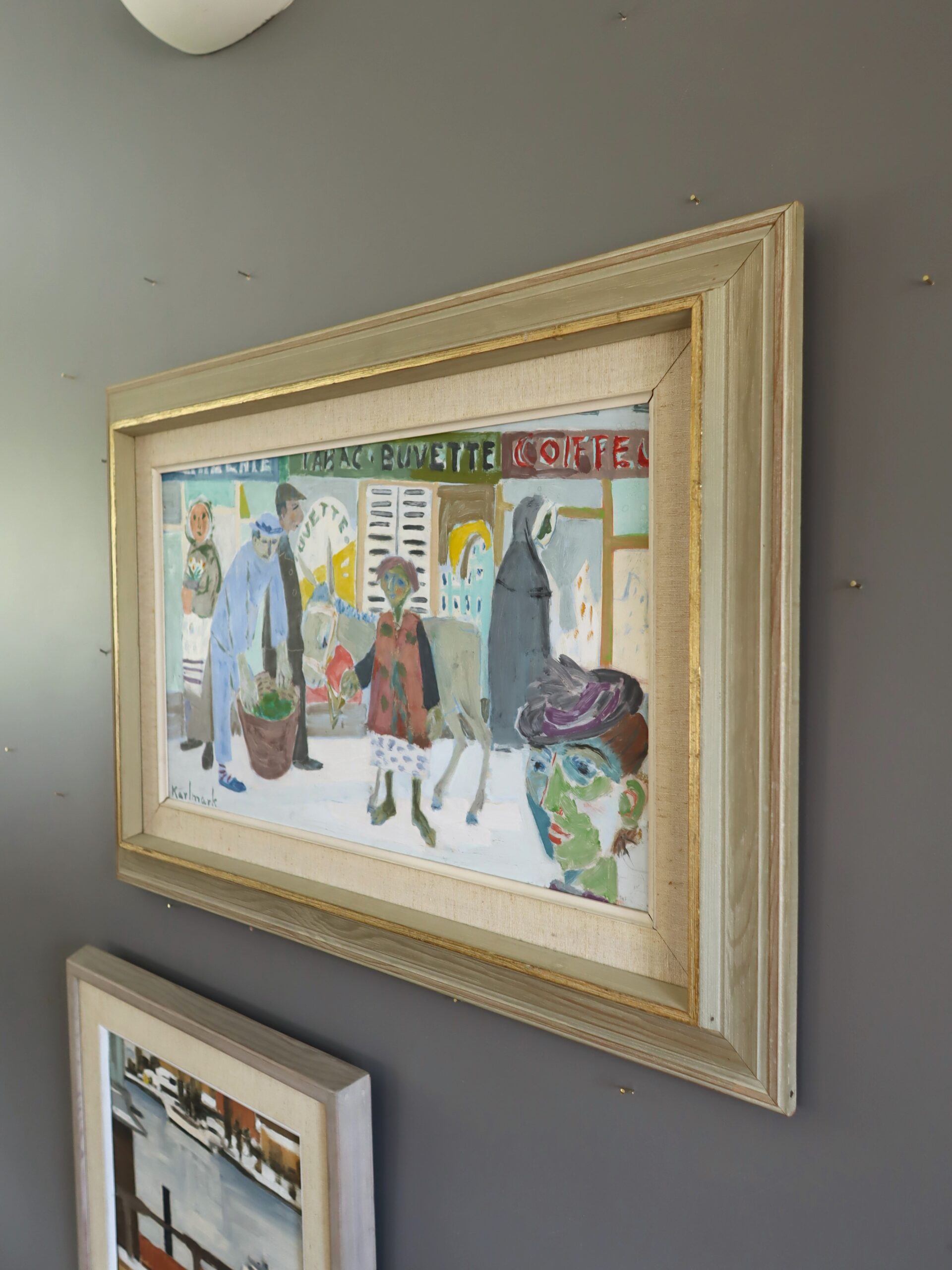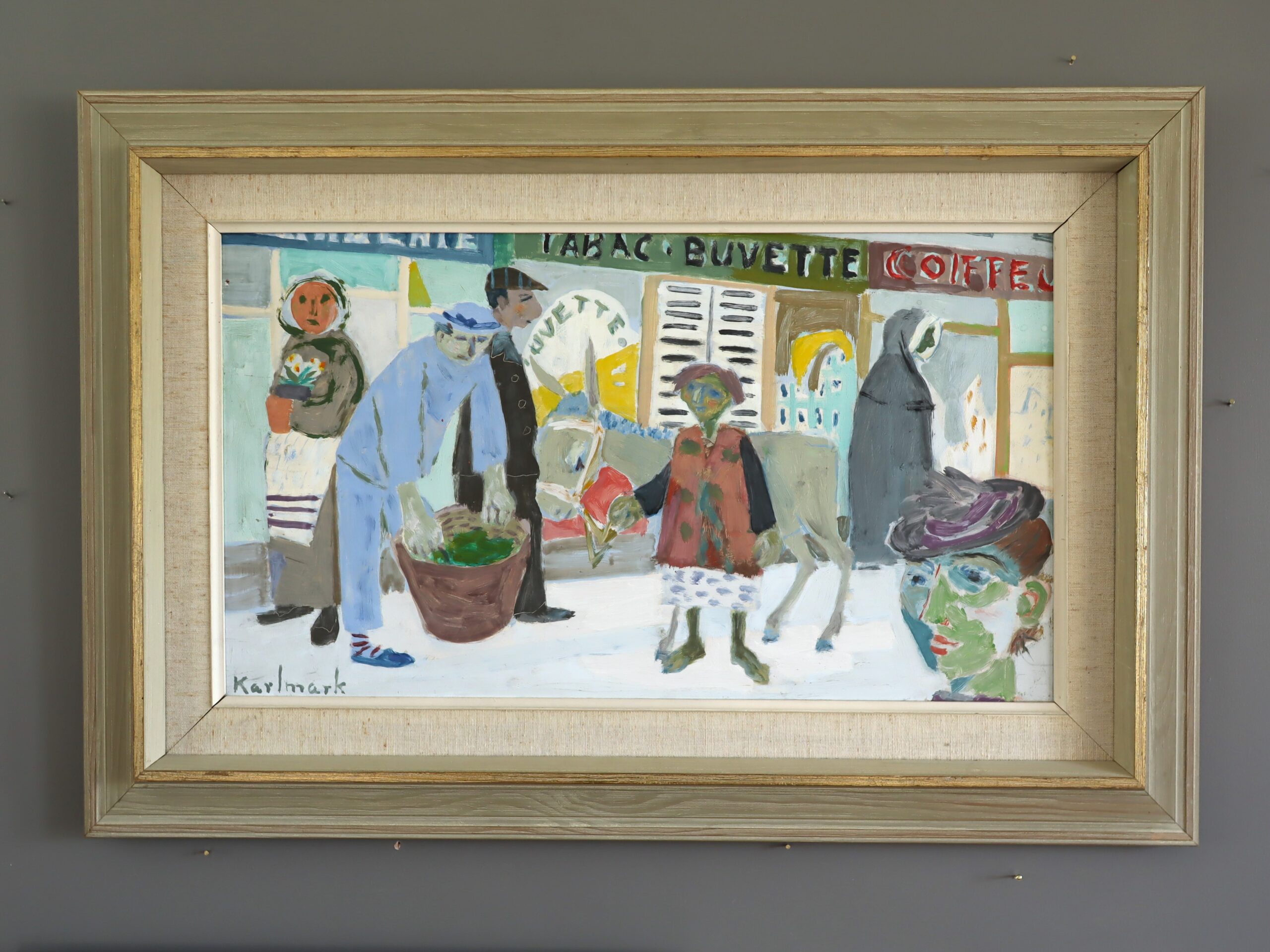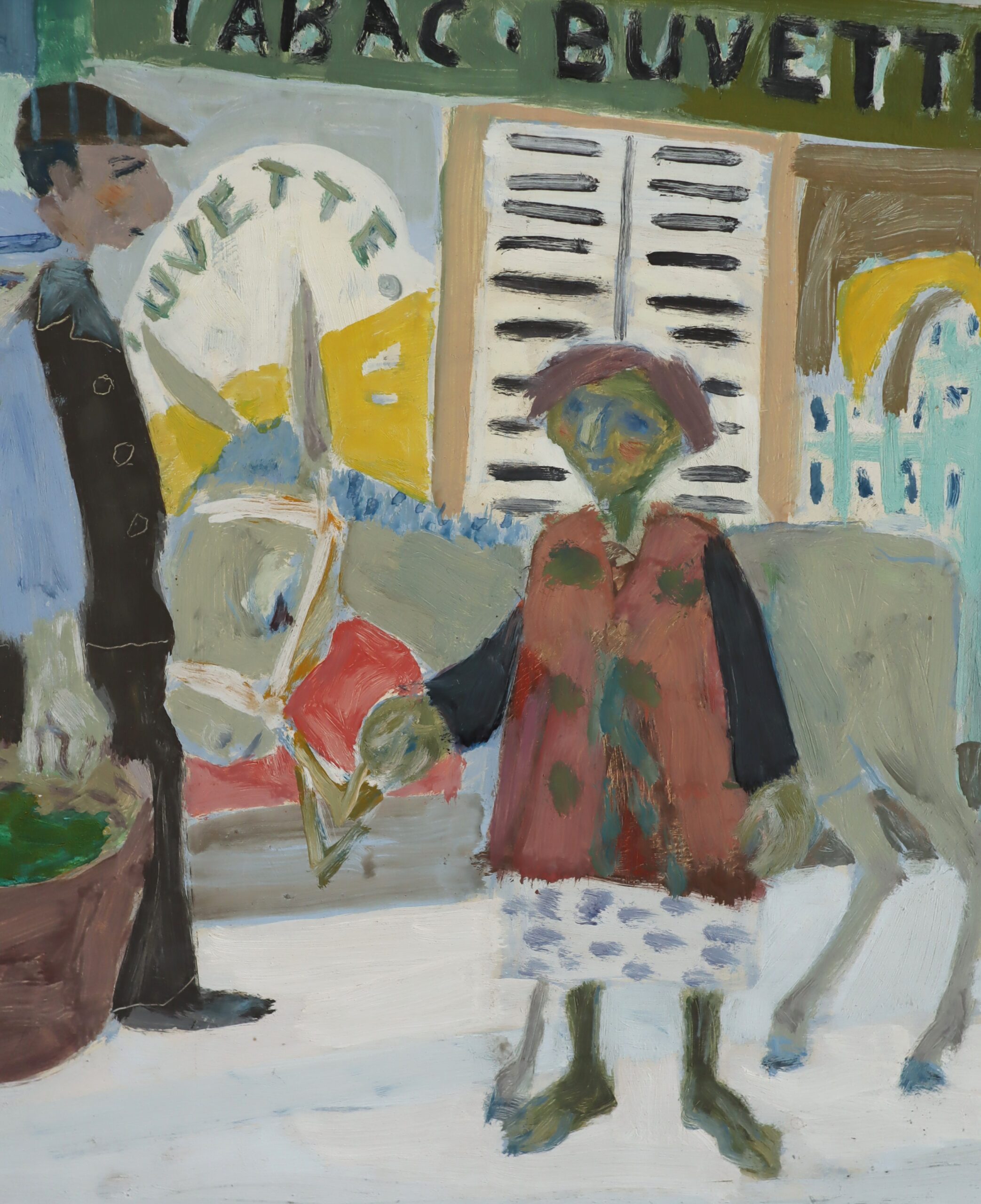 The composition is alive with loosely rendered figures – vendors, villagers, and a donkey – all set against a colourful streetscape adorned with signage. The figures, painted in exaggerated forms, convey the artist’s playful yet perceptive take on character and movement.