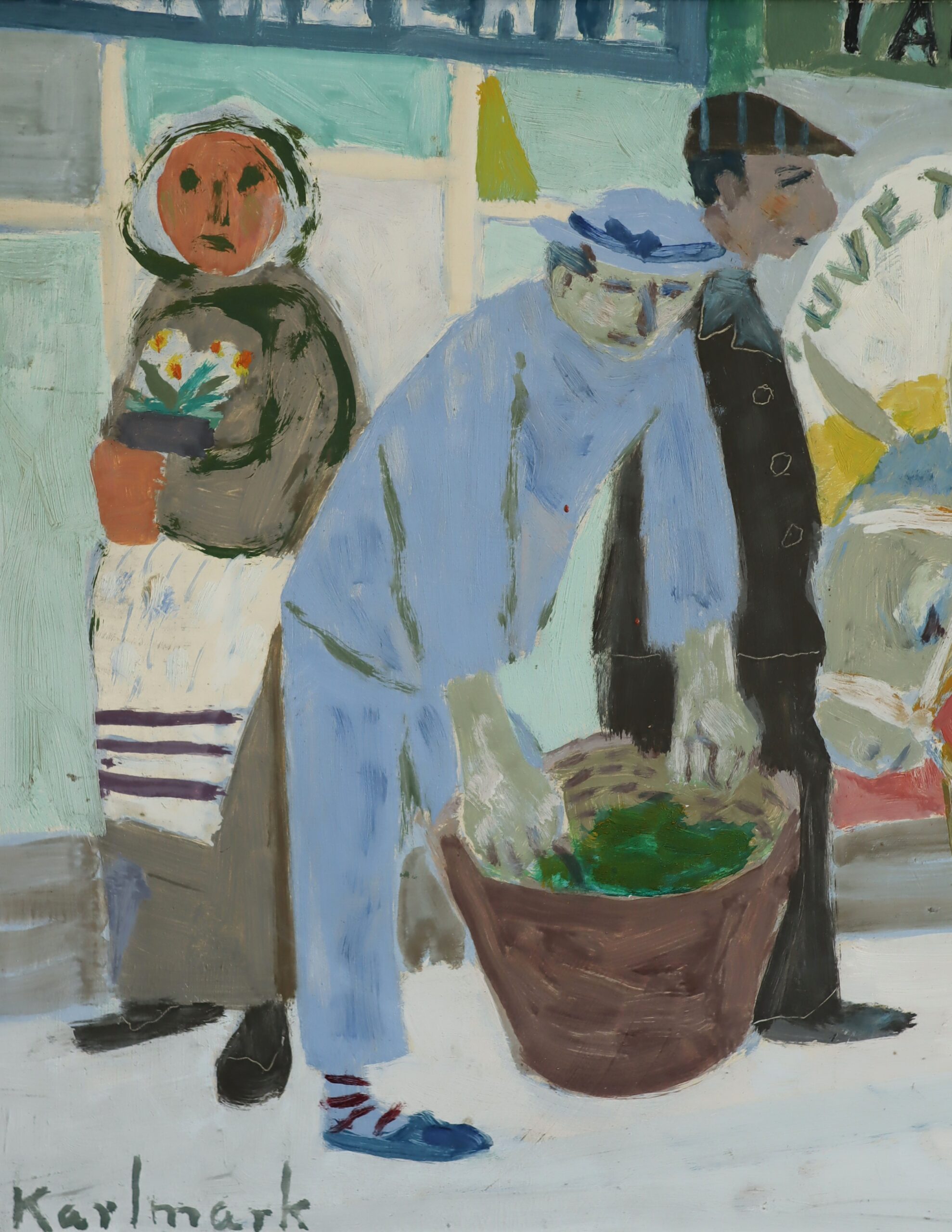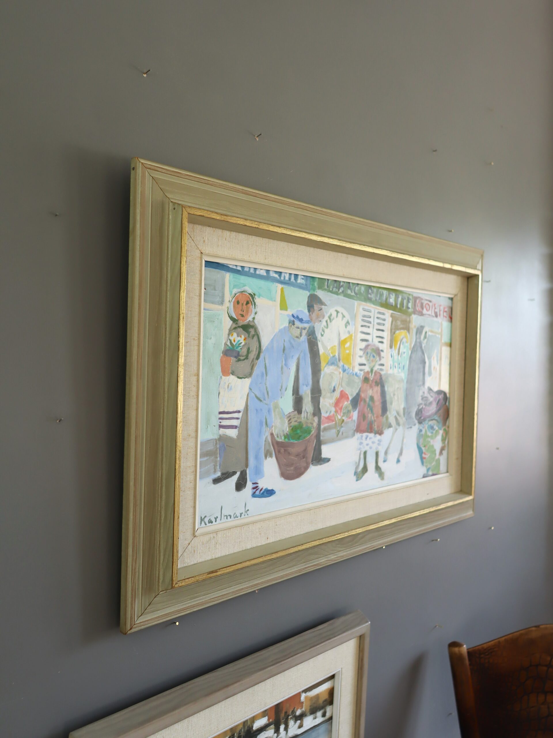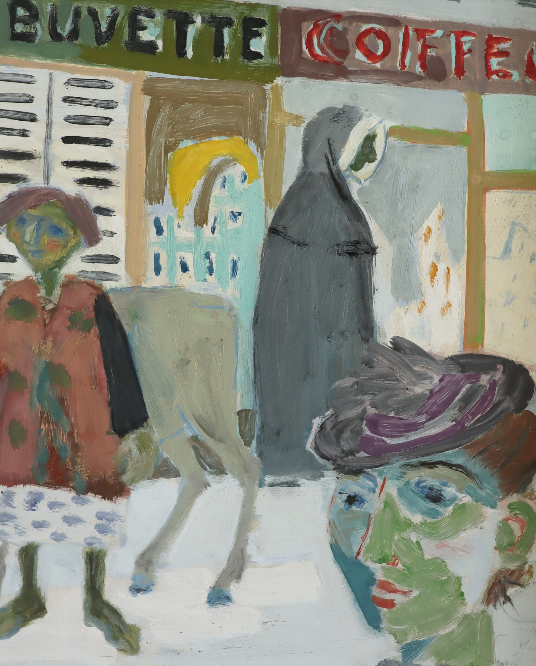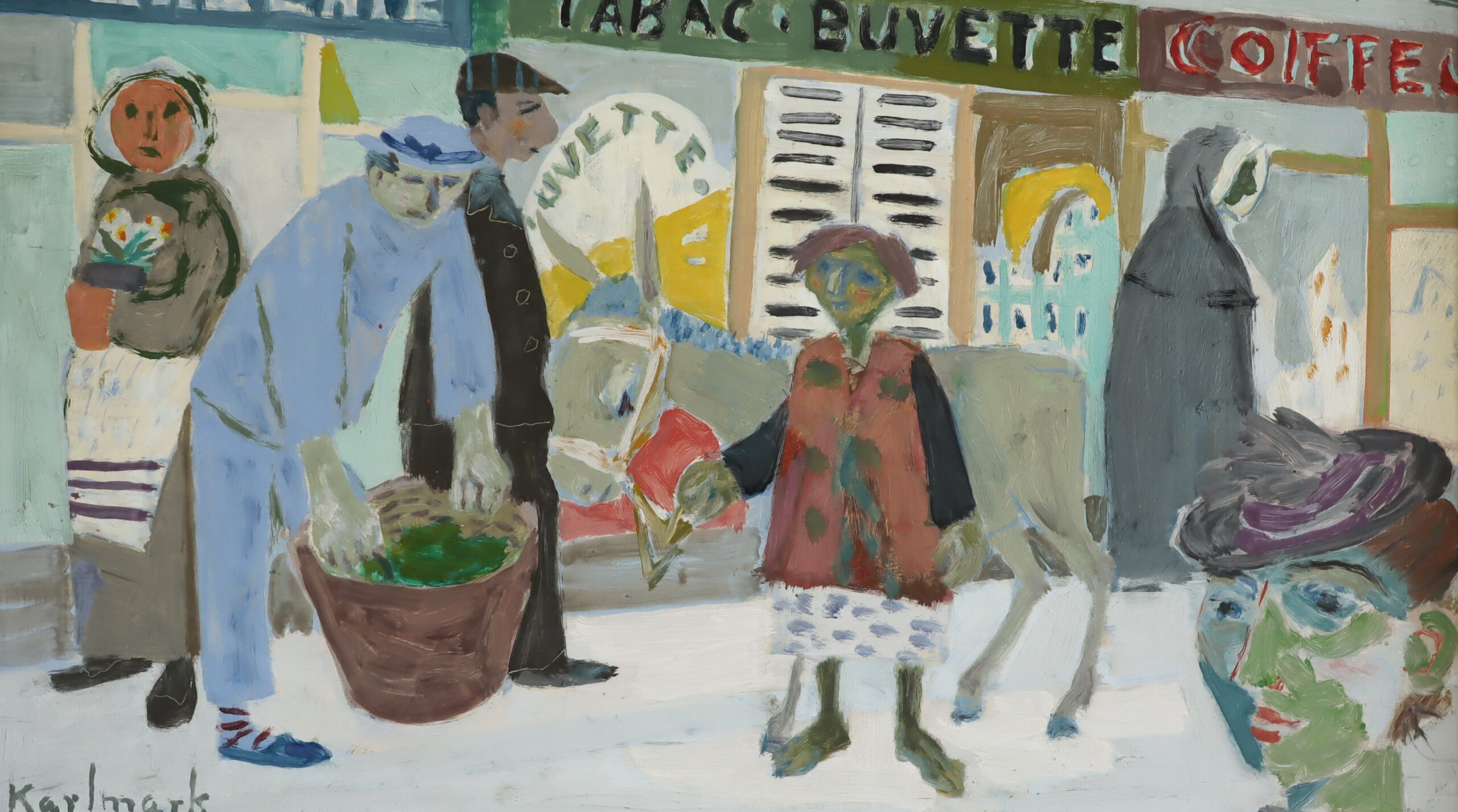 The composition is alive with loosely rendered figures – vendors, villagers, and a donkey – all set against a colourful streetscape adorned with signage. The figures, painted in exaggerated forms, convey the artist’s playful yet perceptive take on character and movement.