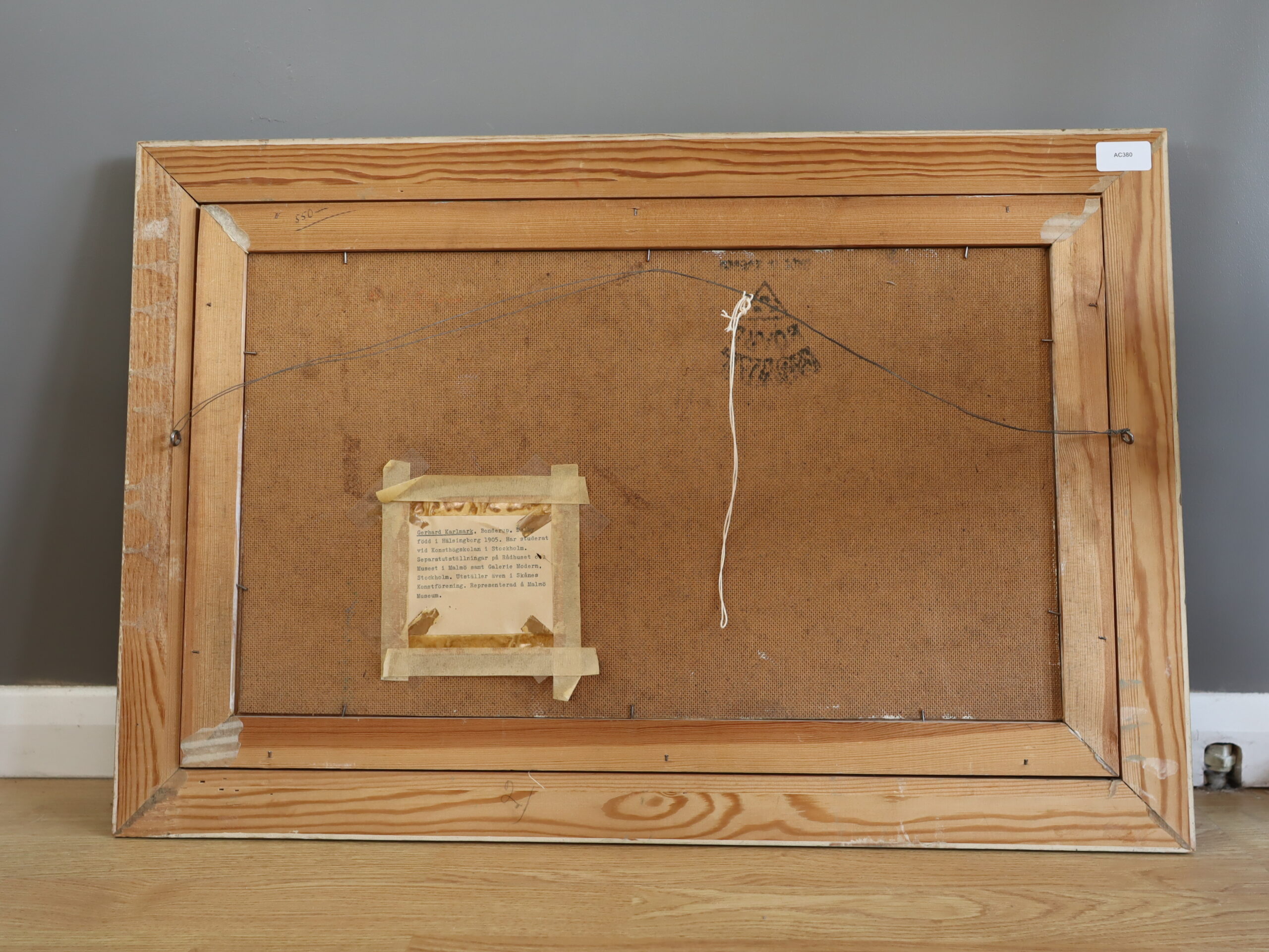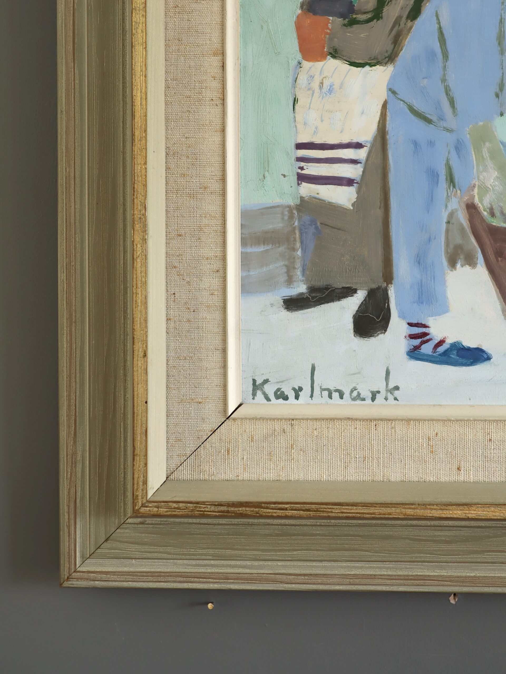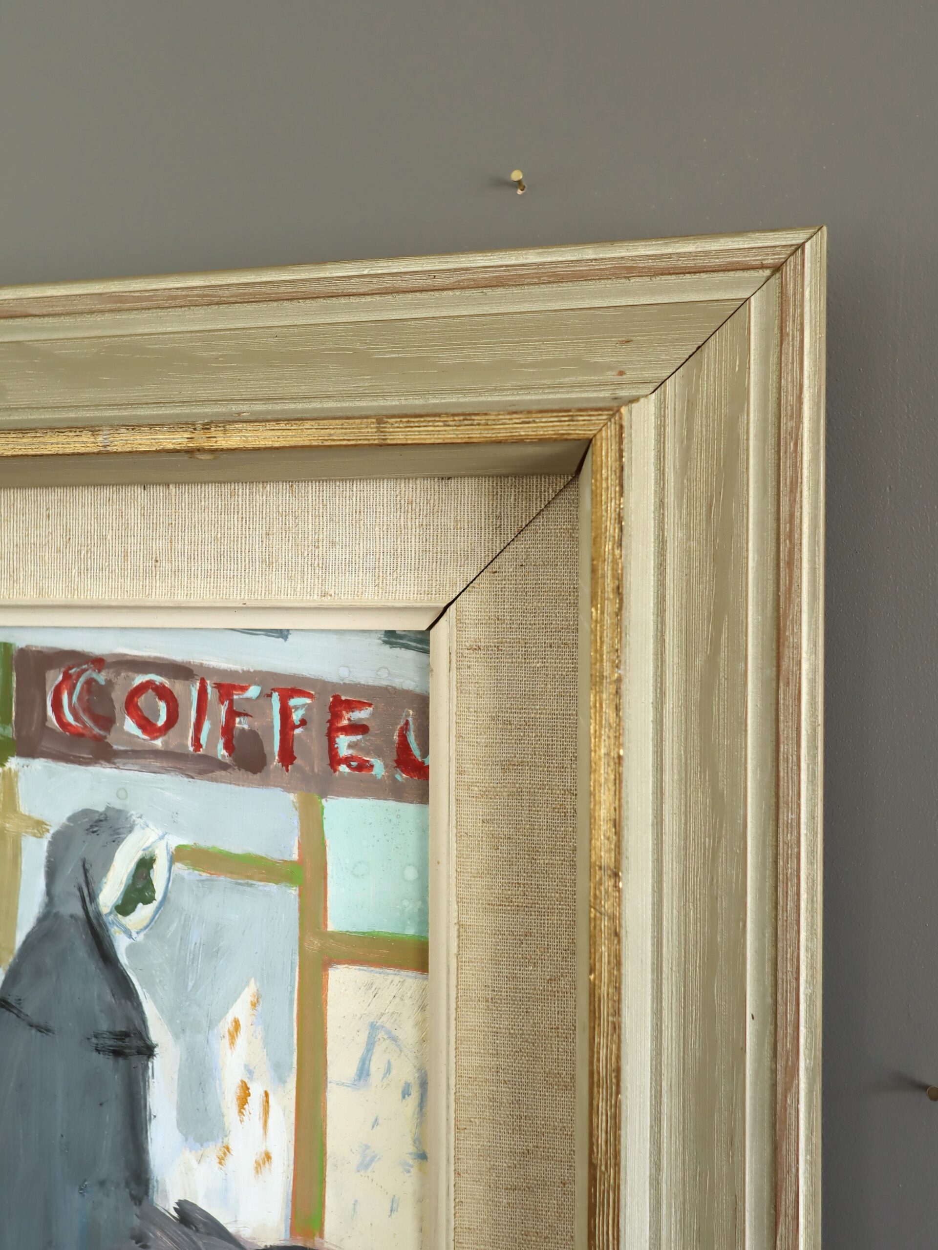 This oil on board is housed in a very well-suited wood frame with an inner linen and gilt border. The painting is in excellent vintage condition, and the frame has very minor scuffing.
