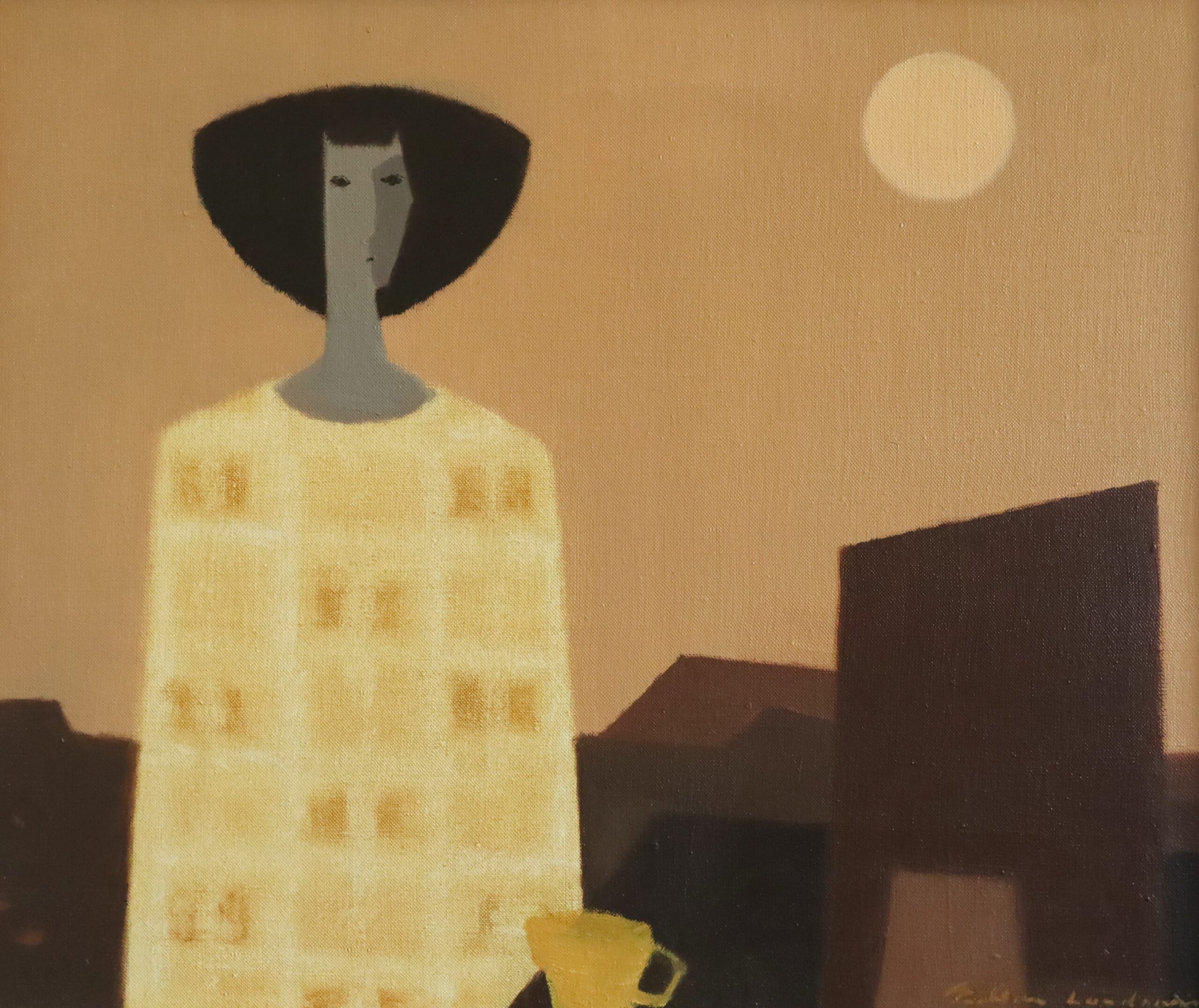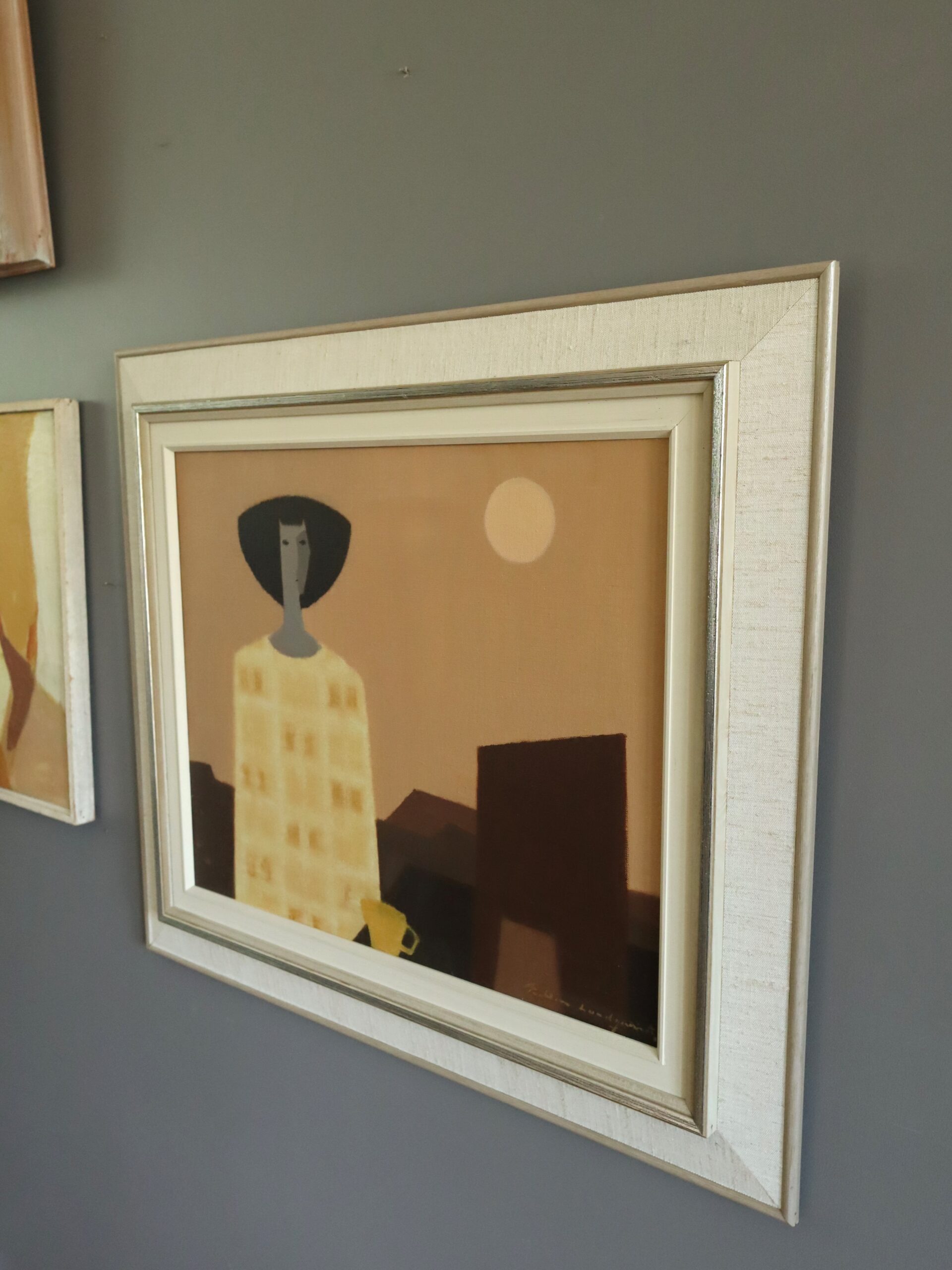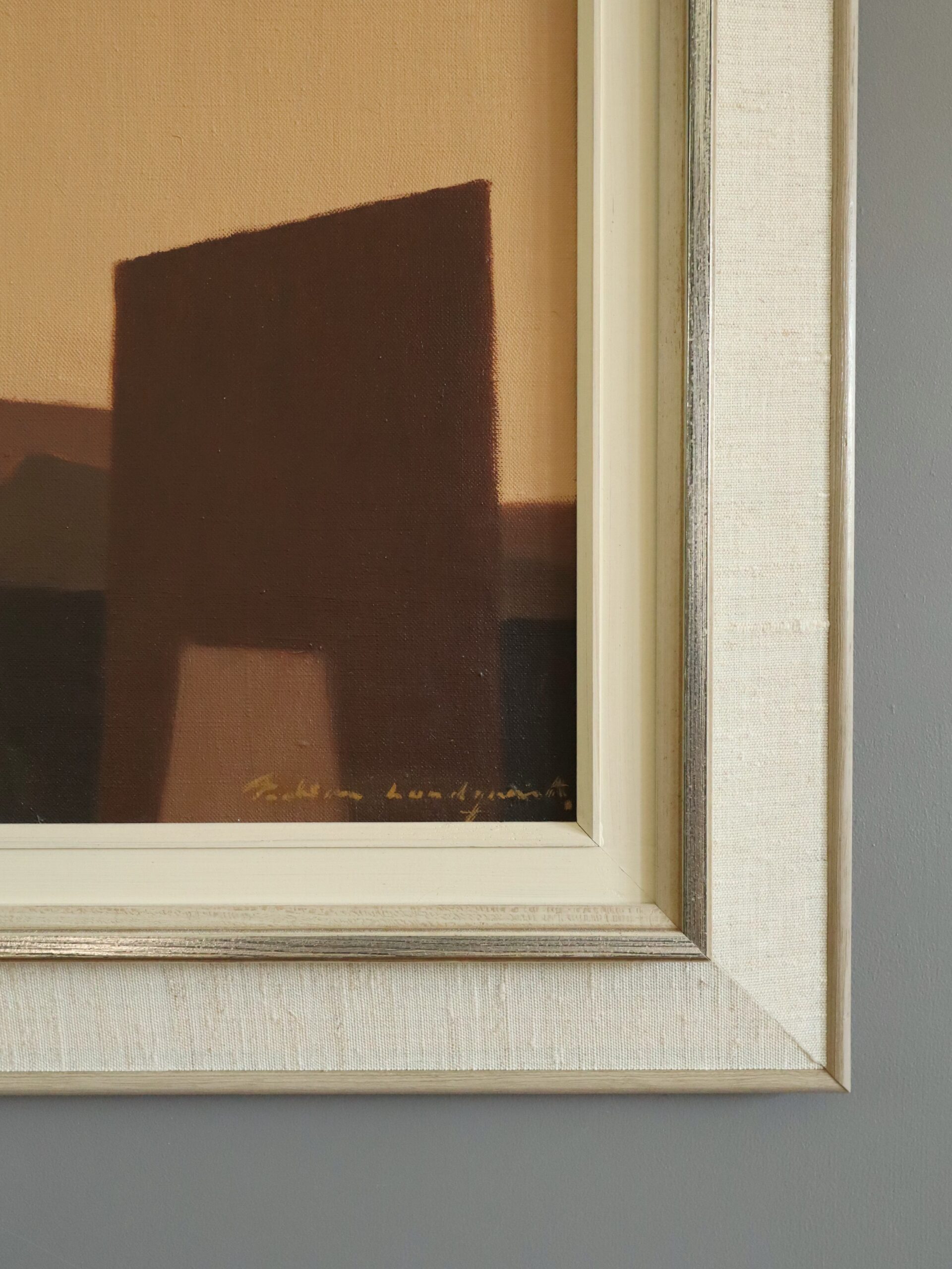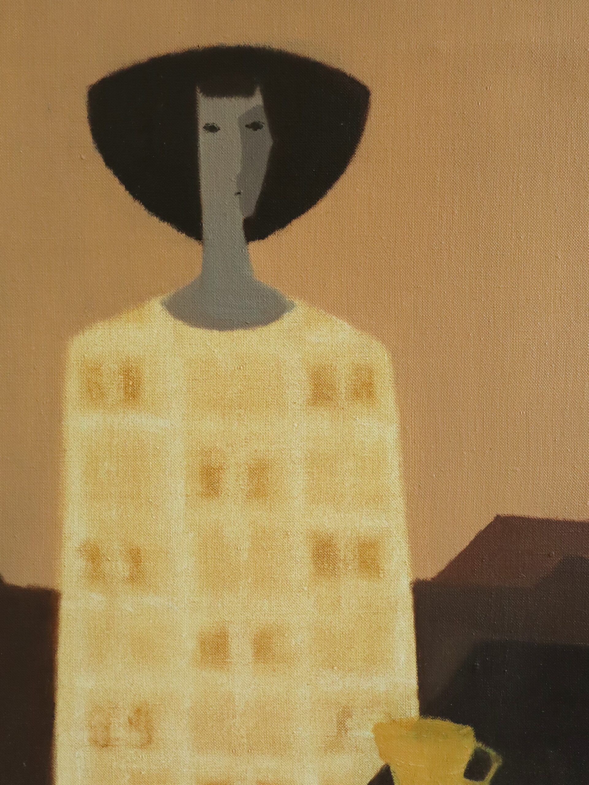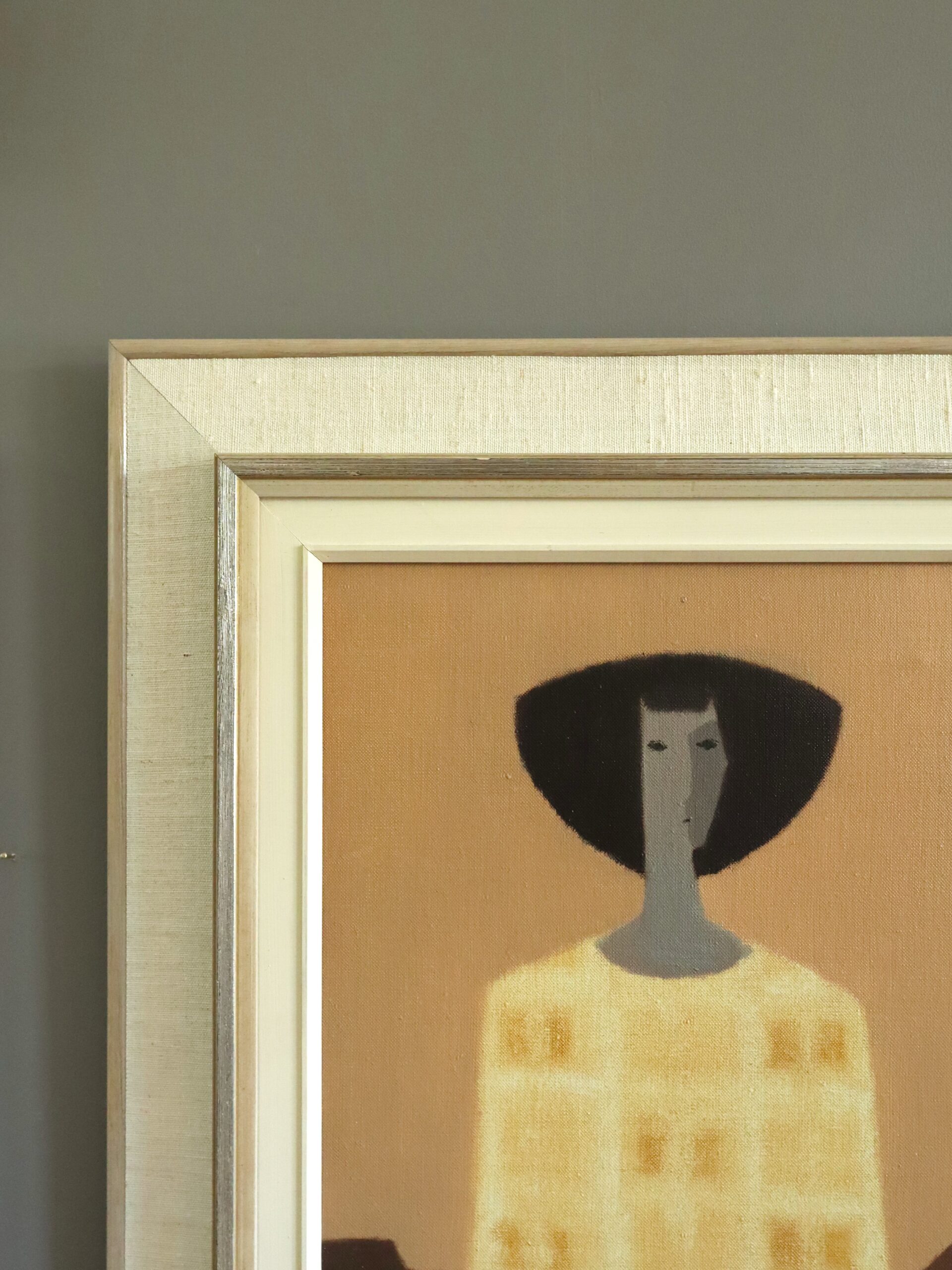 Executed in a restrained palette of warm browns, creams, ochres, and charcoal, the painting features smooth, matte brushwork and soft, flat colour fields, characteristic of post-war European modernism. The artist’s style is contemplative and distilled, evoking introspection and a serene, poetic stillness.