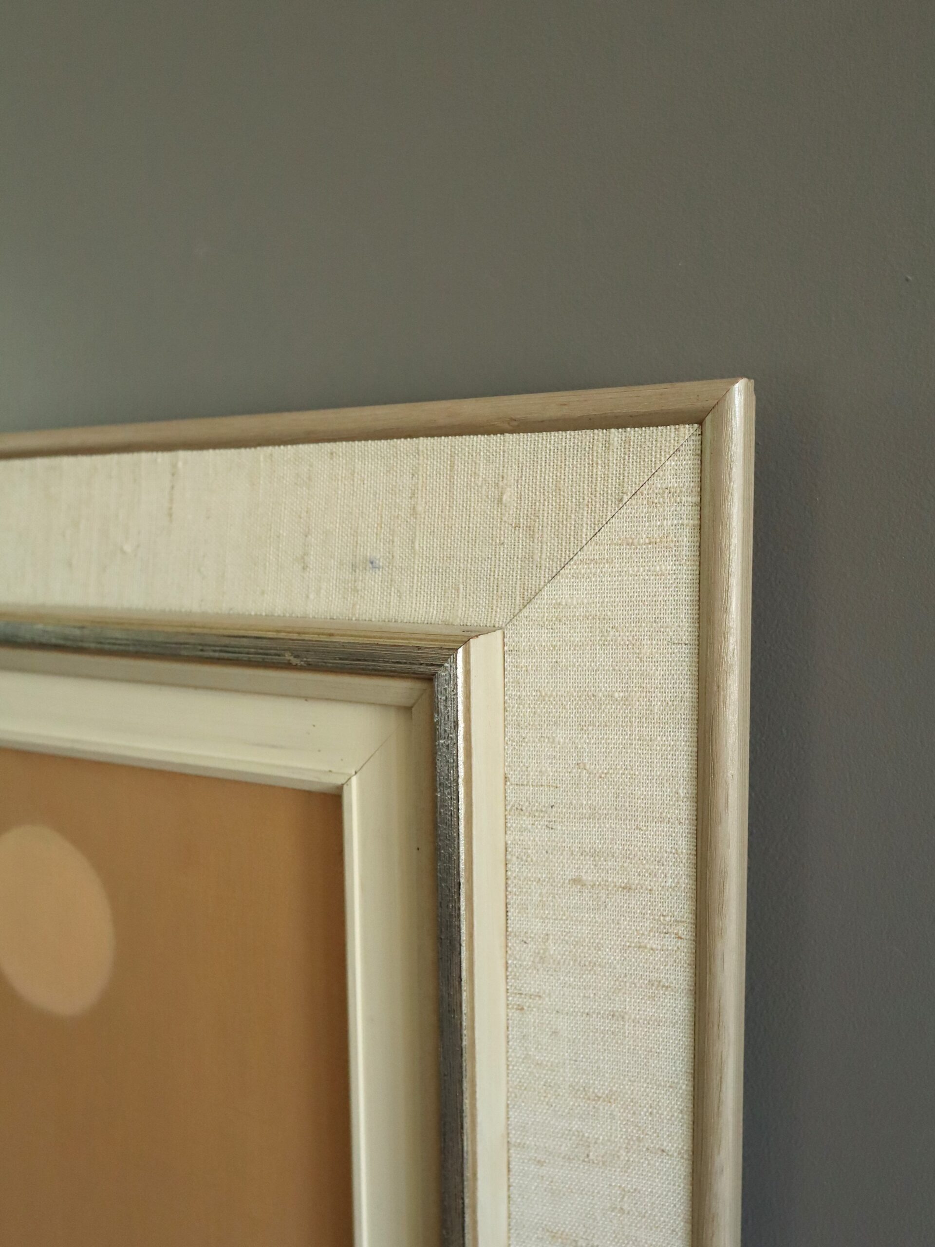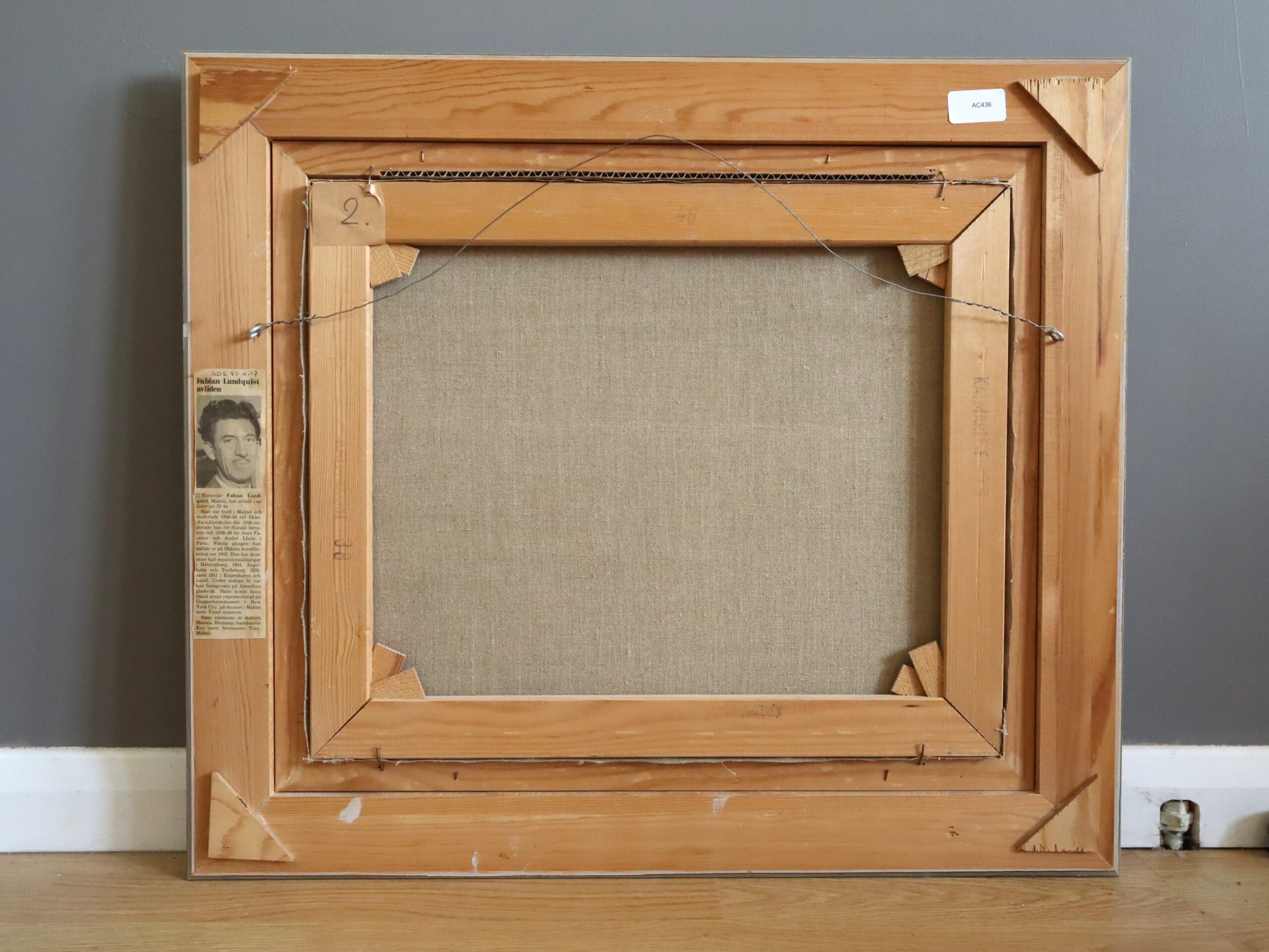 This oil on canvas is housed in a very well-suited silver frame with an inner linen border. Both the painting and frame are in excellent vintage condition.