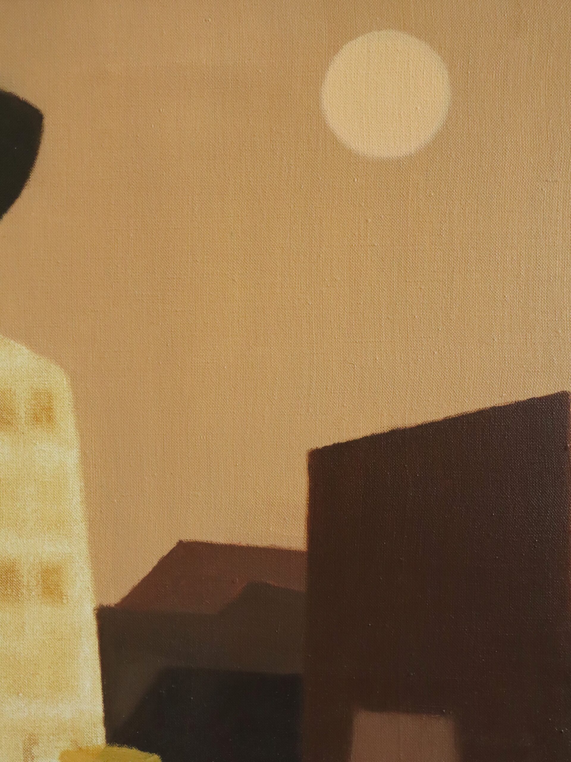A solitary figure stands silhouetted against a dusky ochre sky, bathed in the stillness of twilight. A full, pale moon hangs suspended in the background, casting a quiet presence over a geometric urban landscape rendered in rich, earthen browns and shadowy forms.