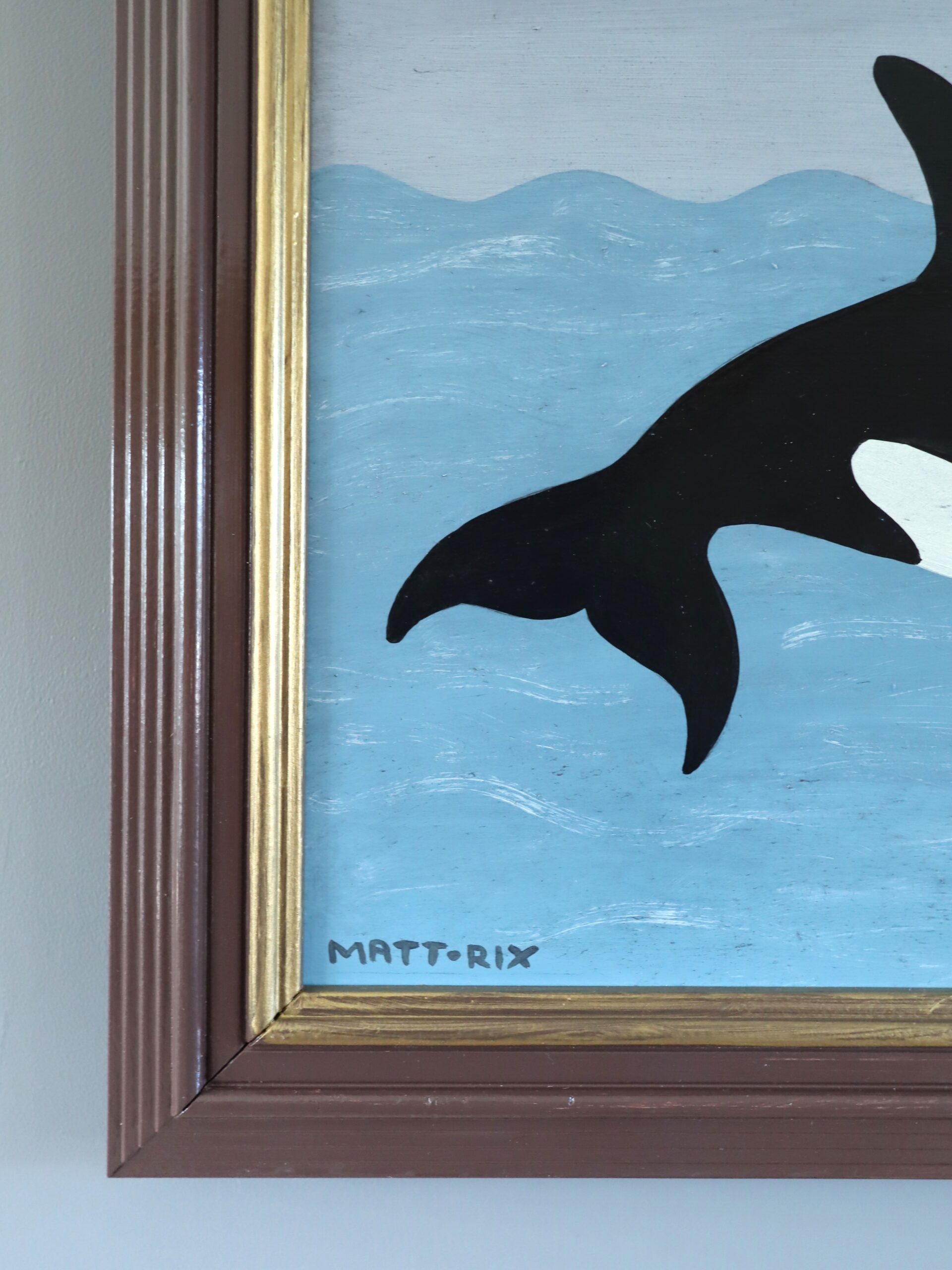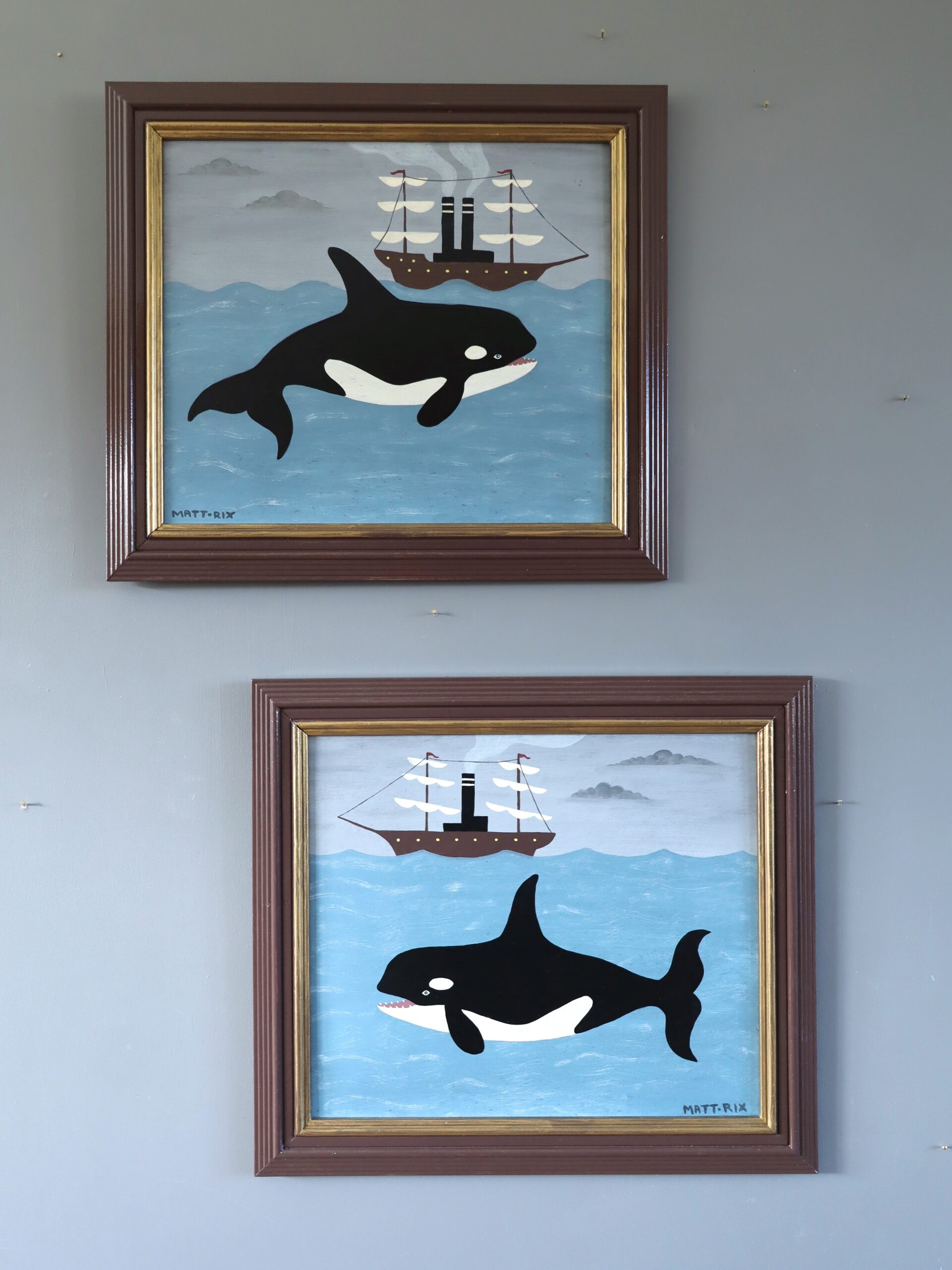 The palette is restrained yet effective: cool blues dominate the sea and sky, layered in soft tonal shifts, while the orca’s deep matte black contrasts crisply against its creamy white markings. The ship introduces earthy browns, subtly grounding the scene.
