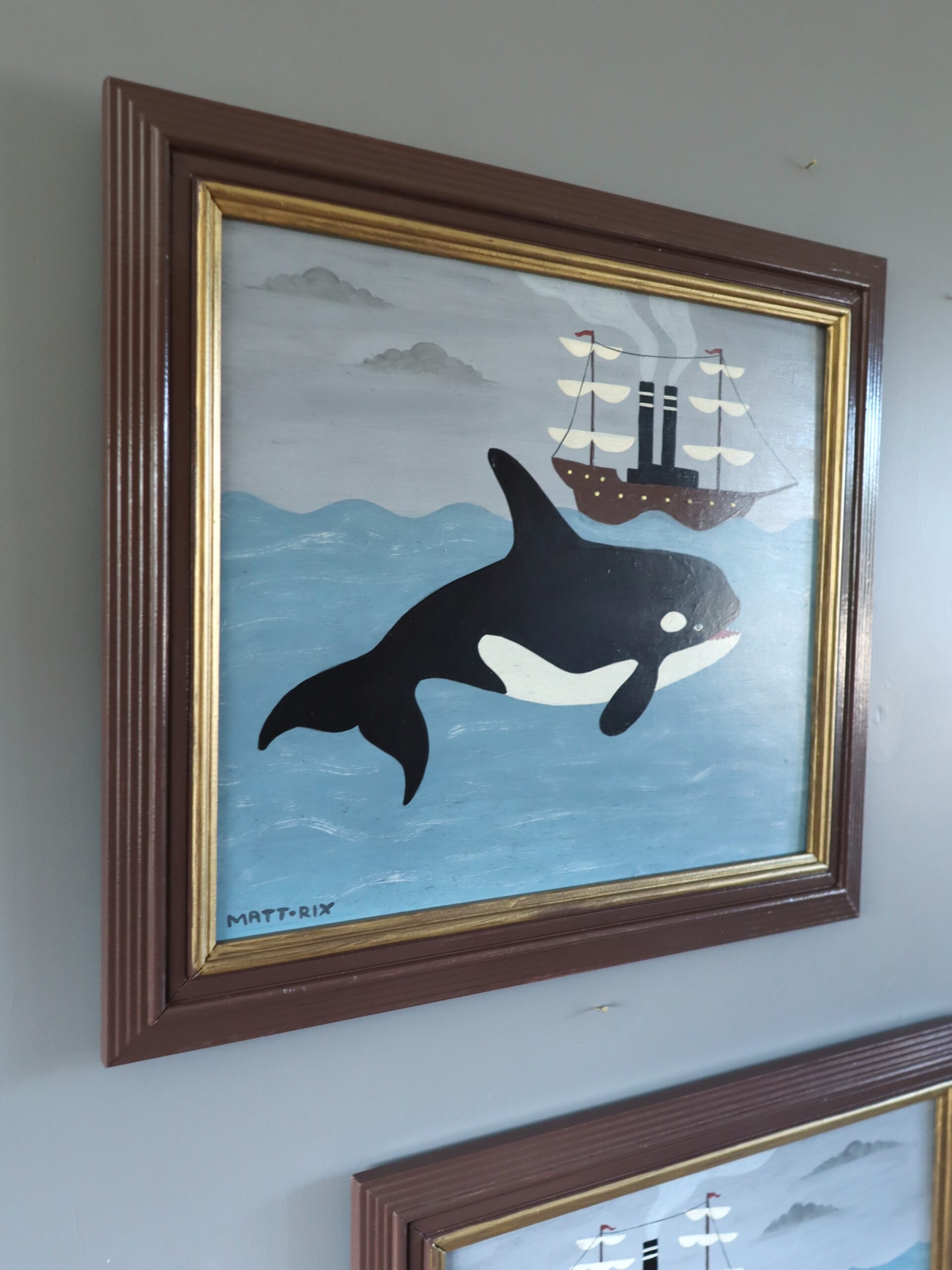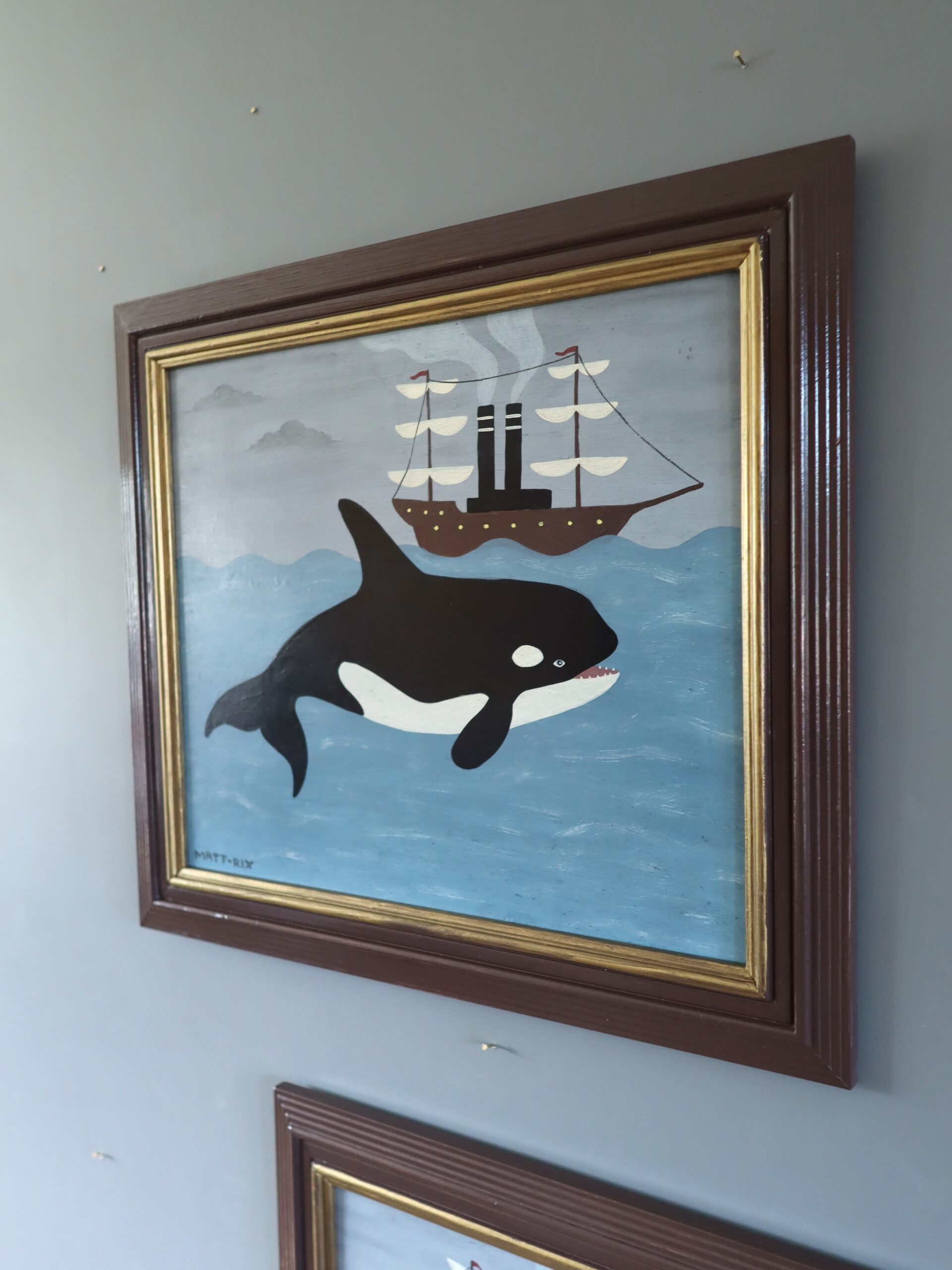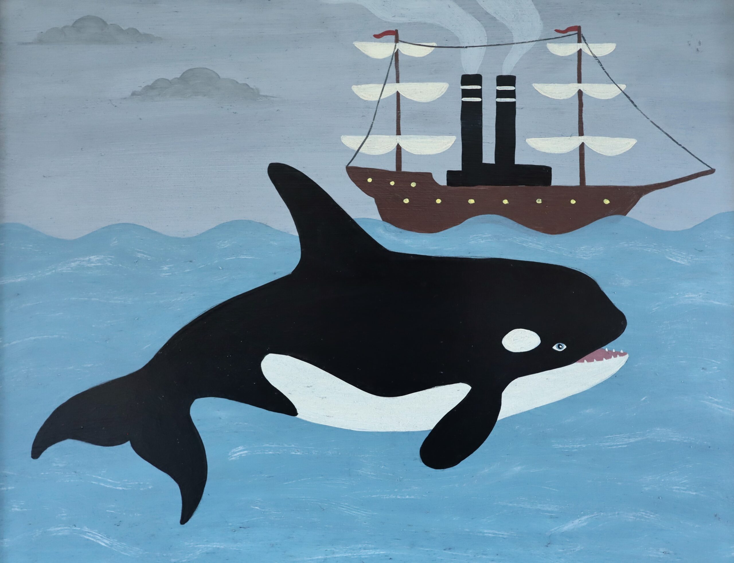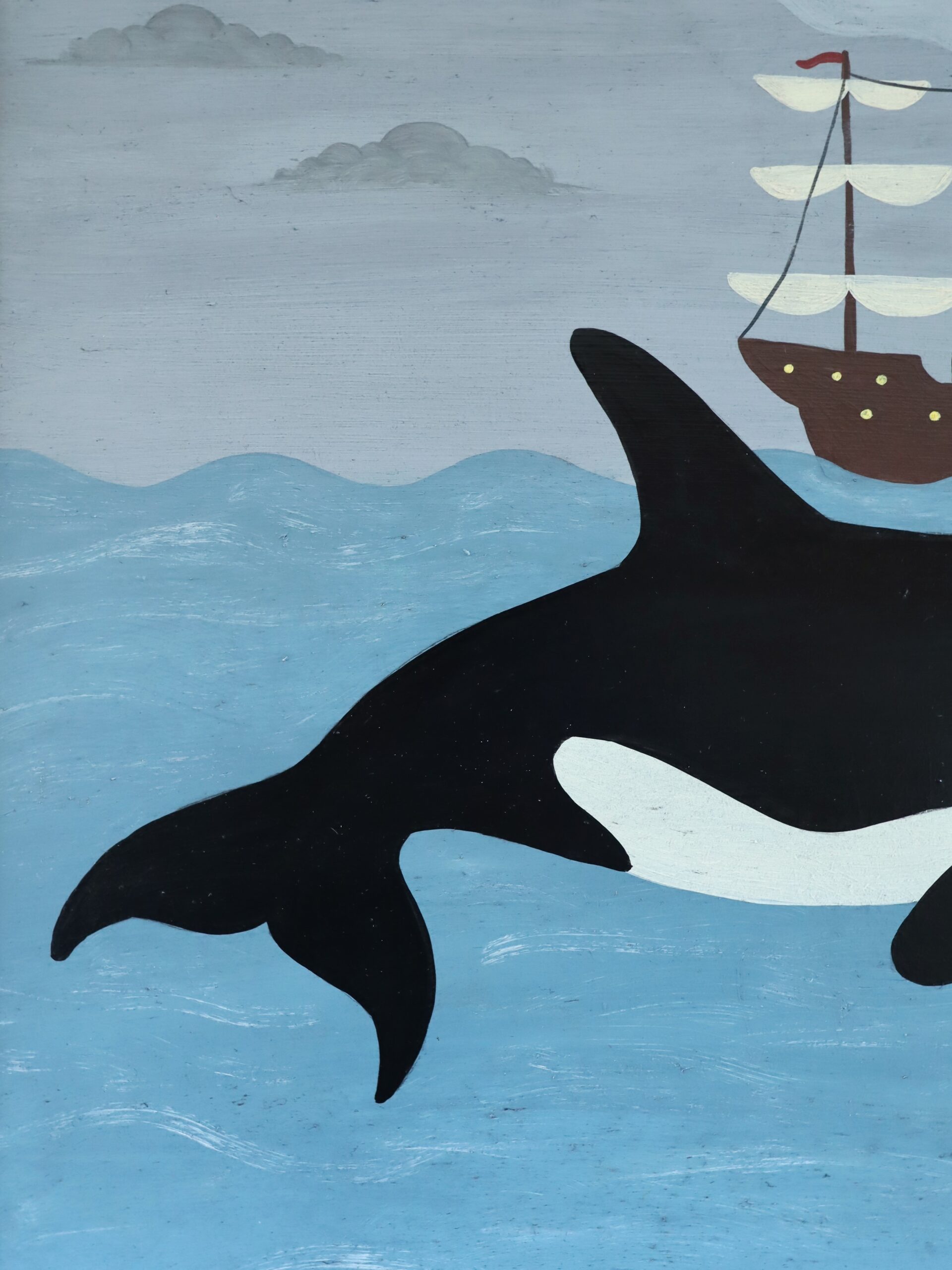 Executed in a naïve style, the work embraces flat perspective and deliberate scale distortion. The whale is rendered larger than life in relation to the ship, lending the scene a dreamlike, storytelling quality. The composition feels almost folkloric, as if suspended between reality and imagination.
