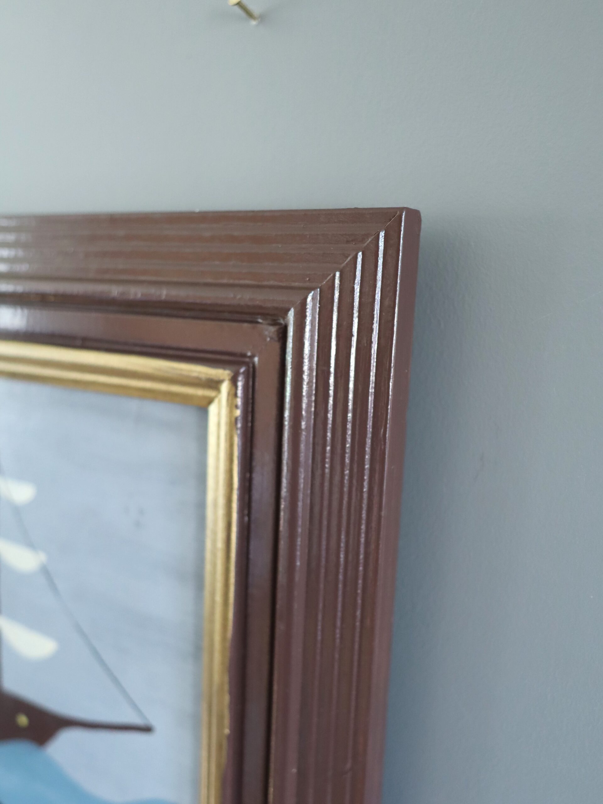 This oil on board is housed in a brown painted wood frame with an inner gilt window. Both painting and frame are in excellent condition.