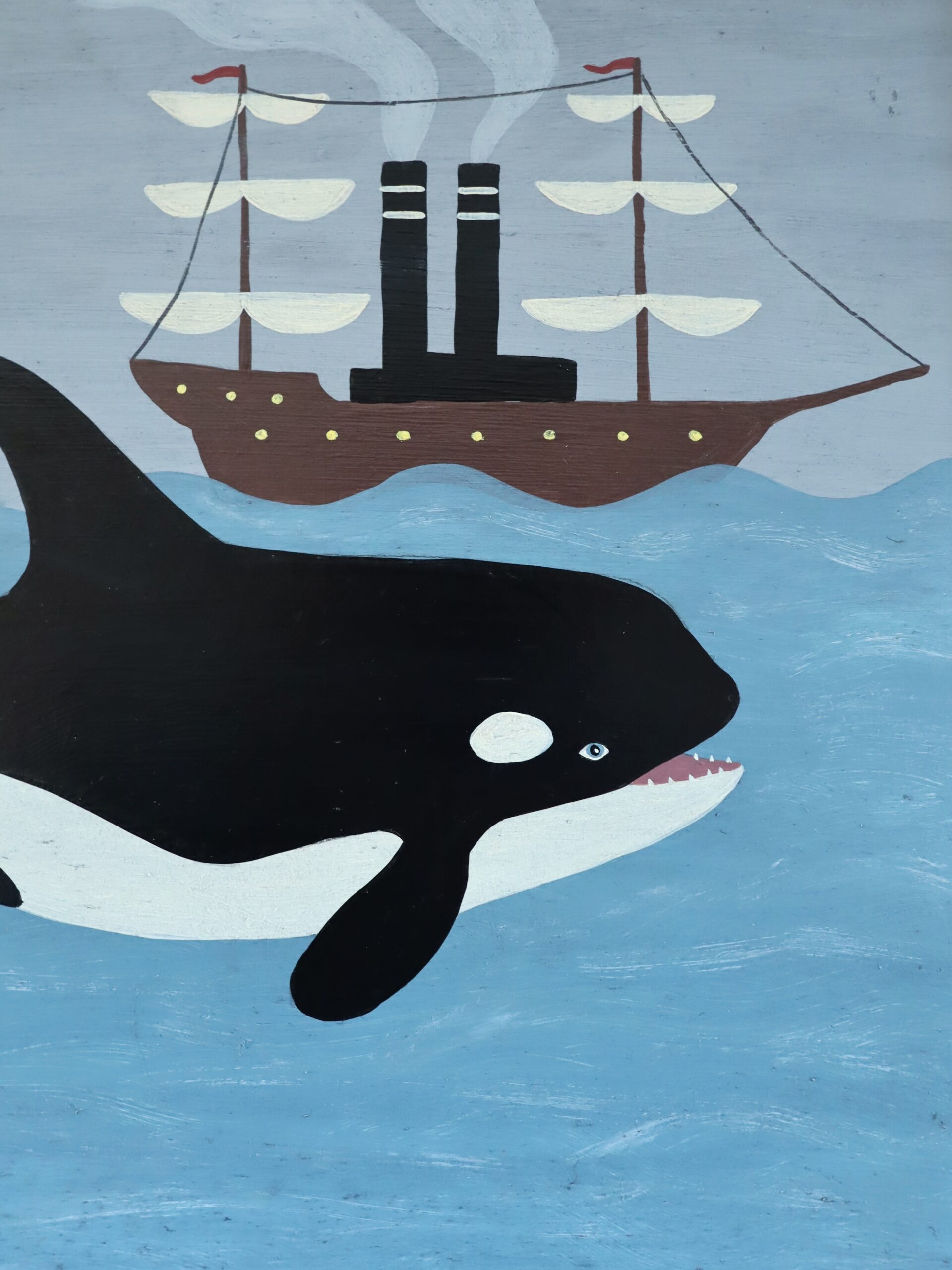A monumental orca glides across softly undulating waters, its bold black-and-white form commanding the foreground. Behind it, a stylised steamship sails calmly across the horizon, smoke rising in gentle puffs toward a pale, clouded sky. In the distance, faint mountainous silhouettes dissolve into mist, creating a sense of depth while maintaining the painting’s charming simplicity.